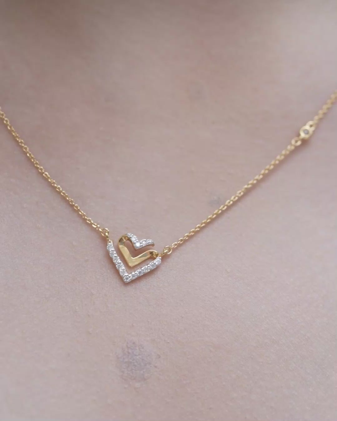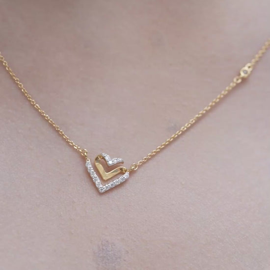Double heart pendant necklace designed with an outline heart shape overlayed by a smaller one. Both forms are embellished with round stones that add brilliance to this sleek and elegant style.