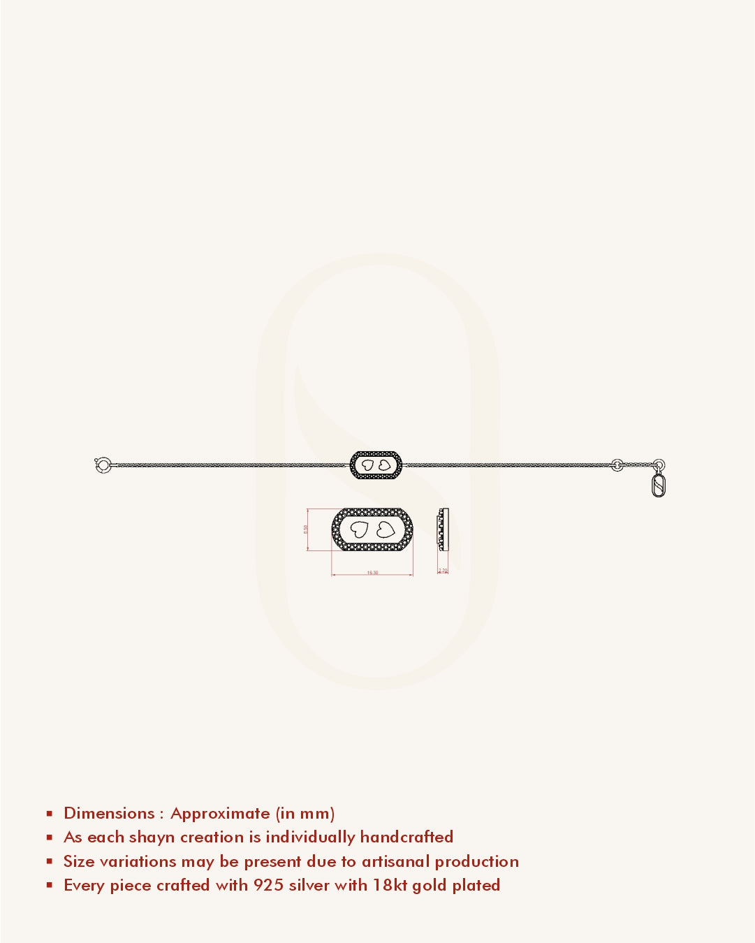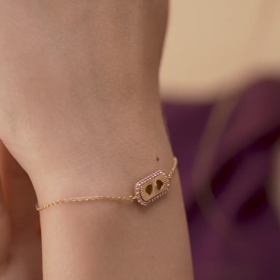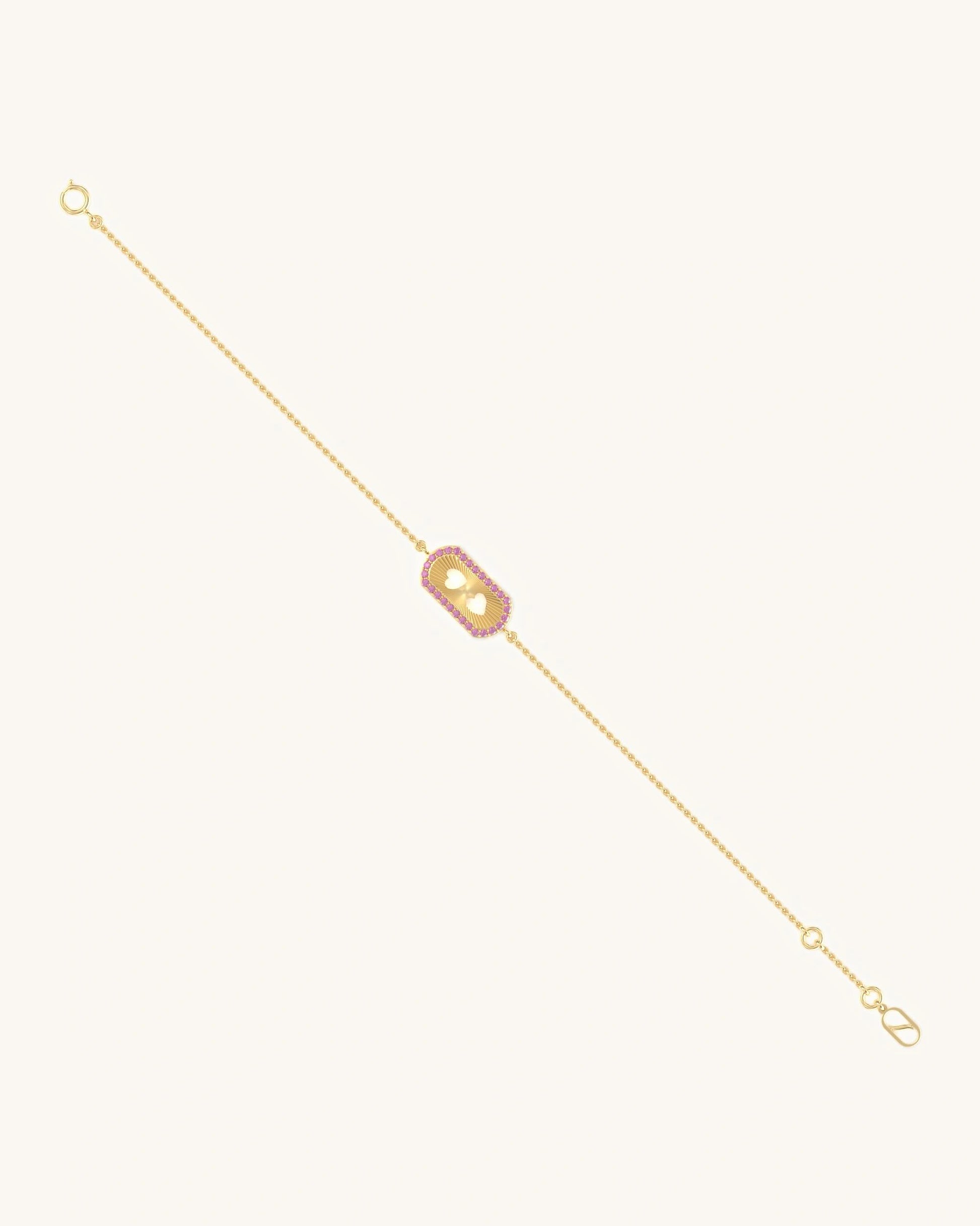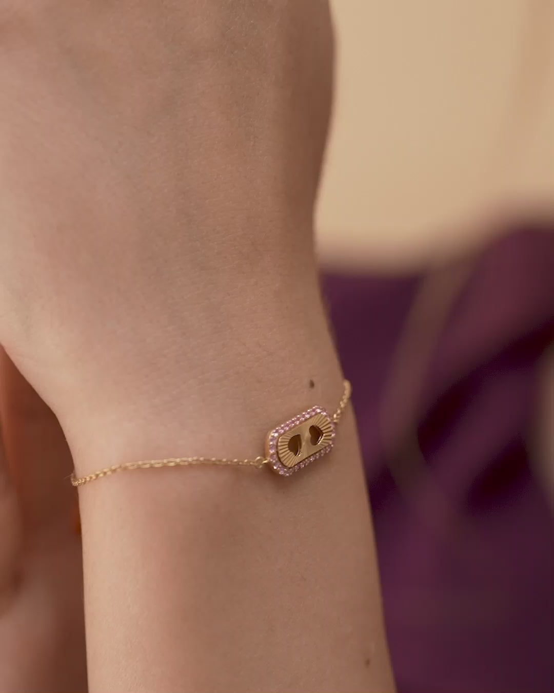 Bracelet with a rectangular tag centerpiece adorned with two cut-out hearts and a border of dazzling pink stones.