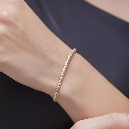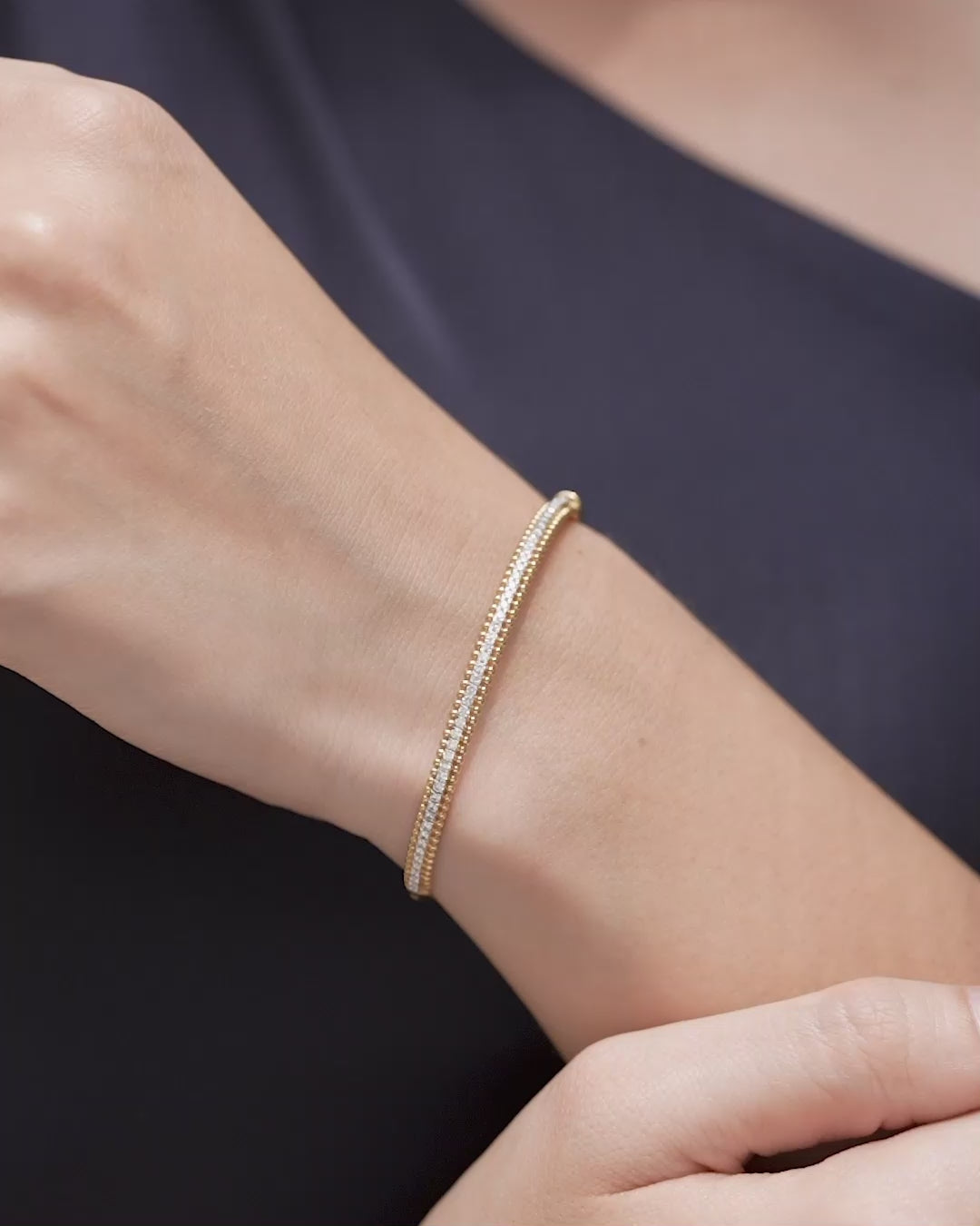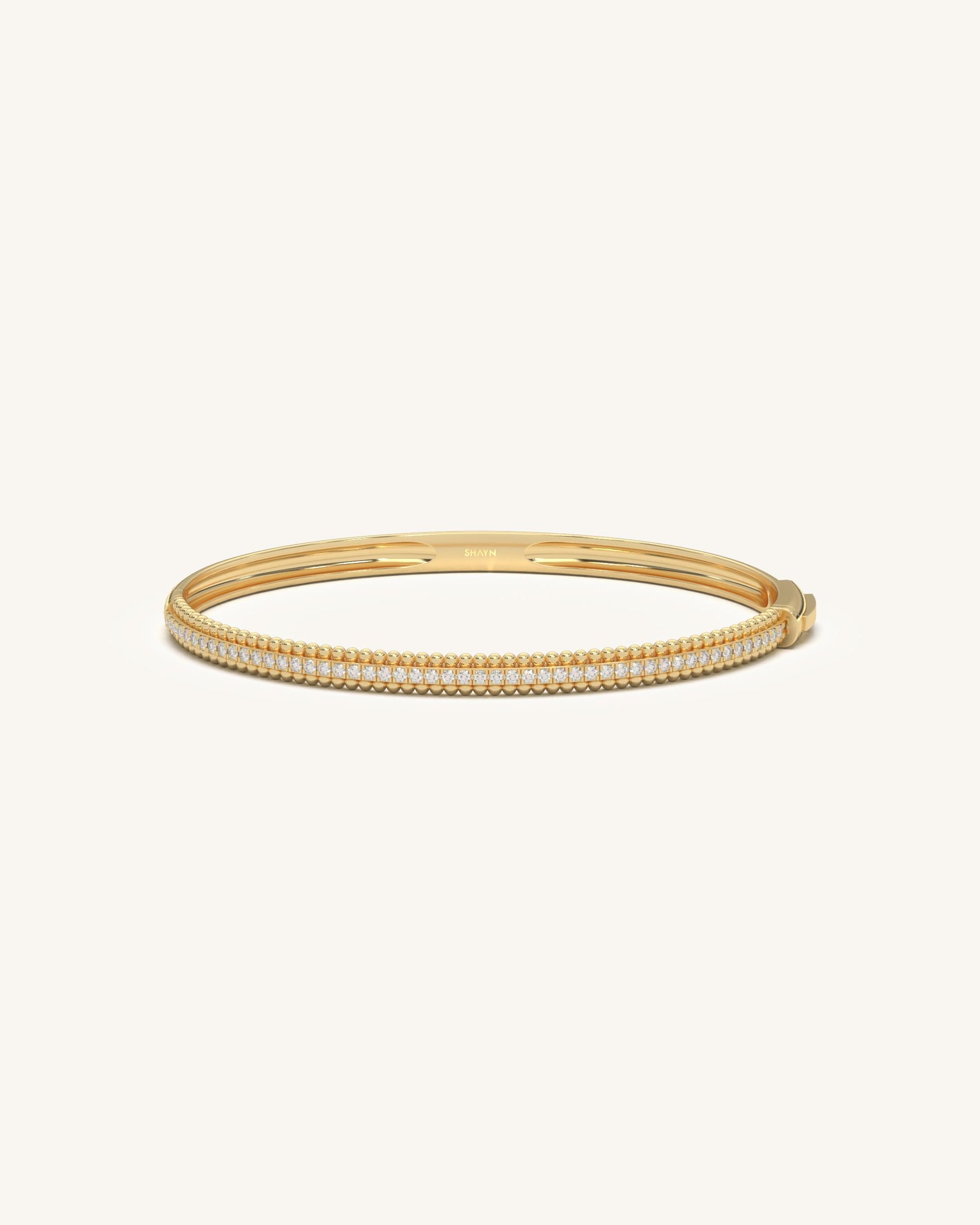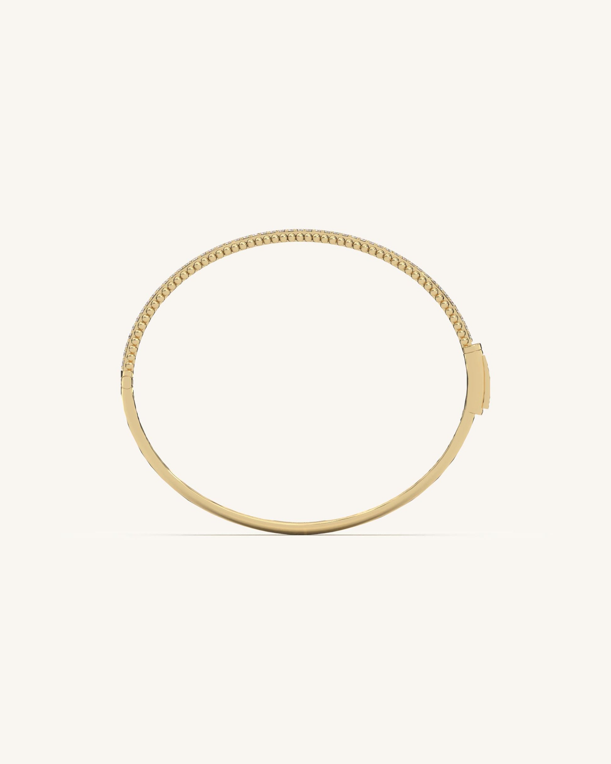 A refined open bangle with a distinctive double-row beaded design and embedded moissanite diamonds across the front, blending vintage charm with modern grace.