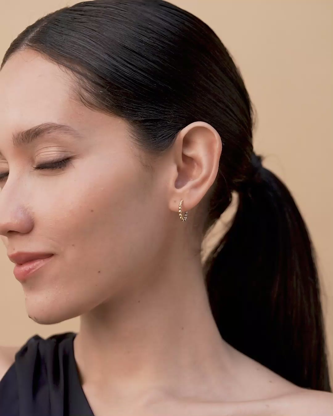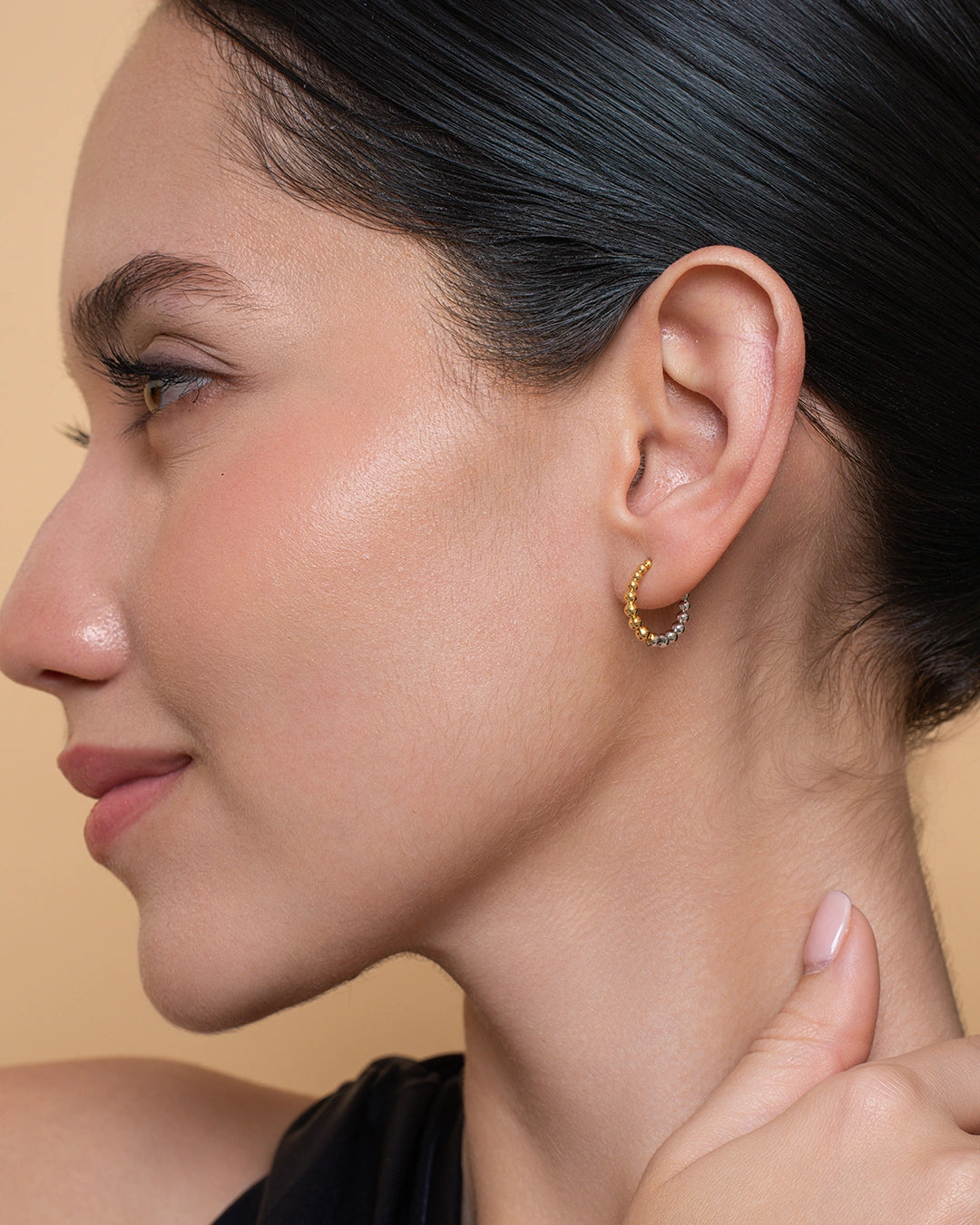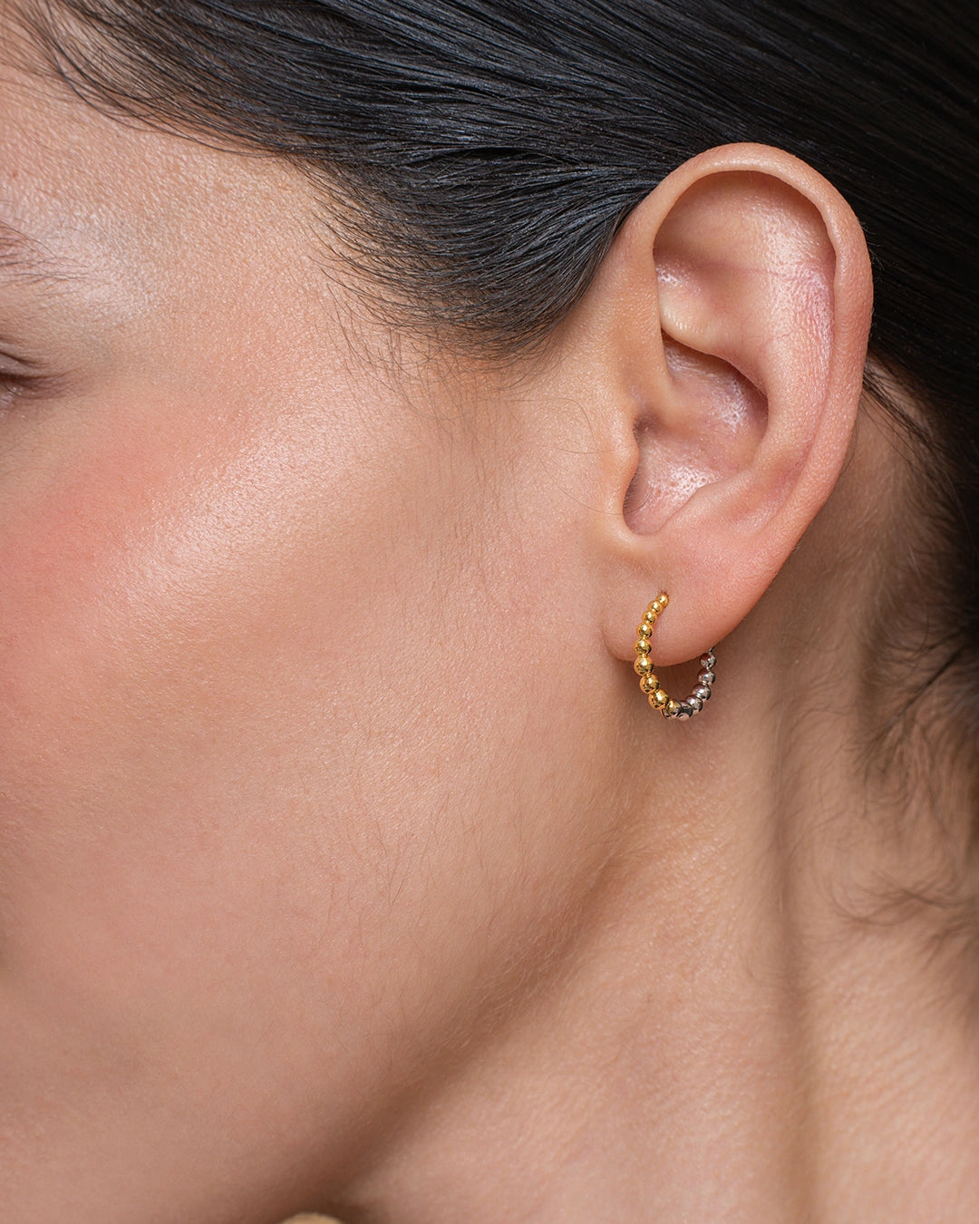 Each hoop is formed with a rhythmic beaded design in 925 Sterling Silver With 18KT Gold Vermeil r tones, creating a playful yet refined surface pattern.