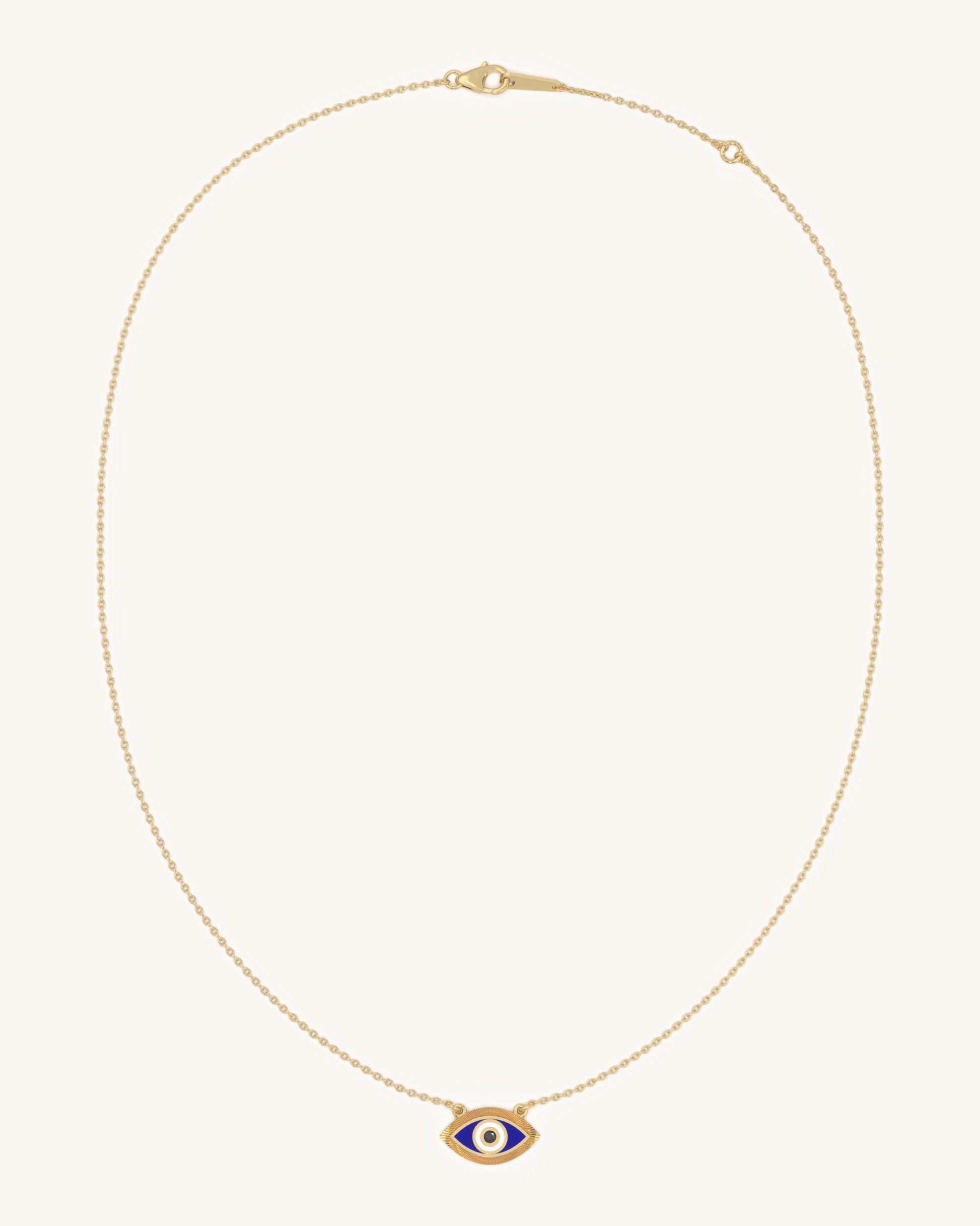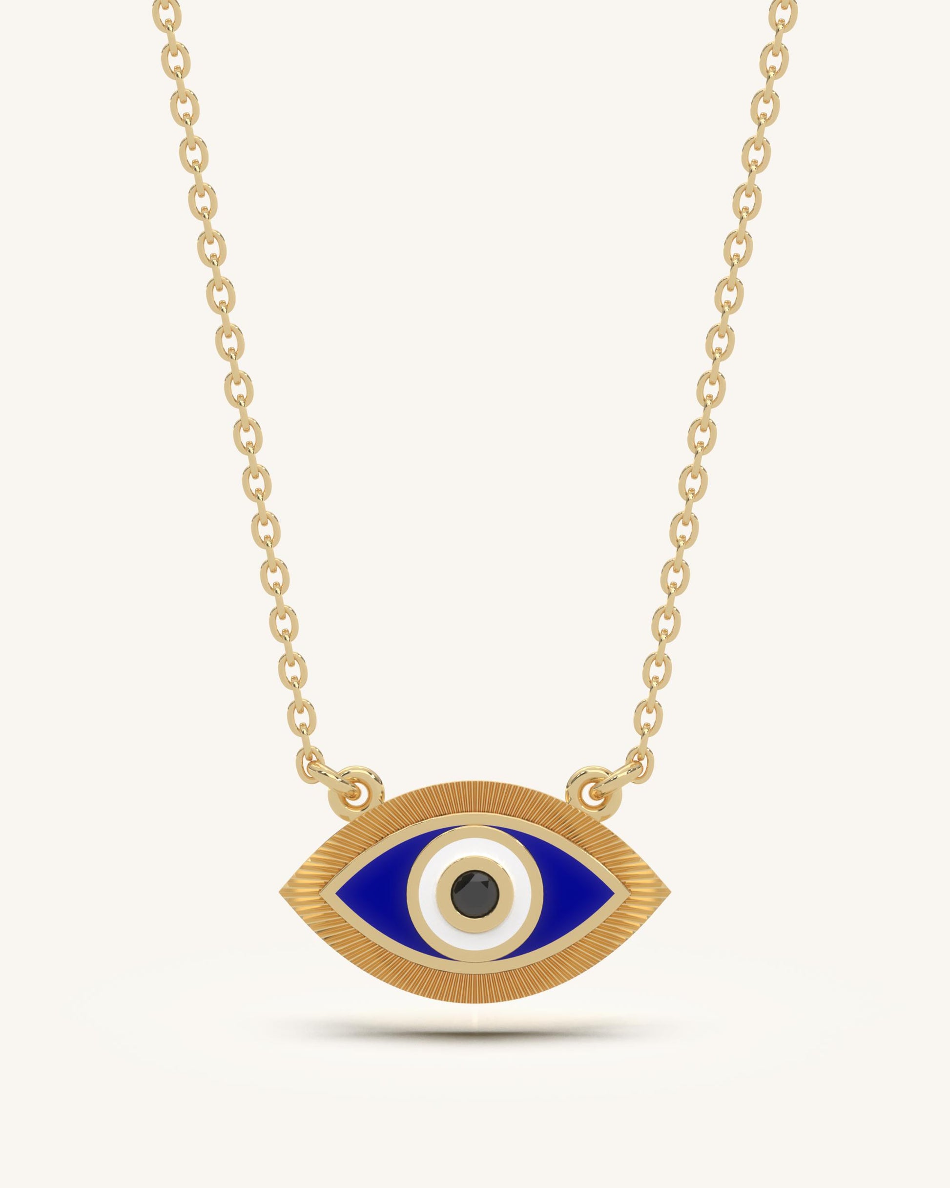 This striking almond-shaped pendant draws the eye with its vivid blue enamel center, surrounded by clean ivory and black concentric accents. The detailed ridged gold frame enhances its dimensional look while maintaining a sense of balance and protection in the design. Suspended from a fine gold chain, it’s both minimal and full of symbolism.