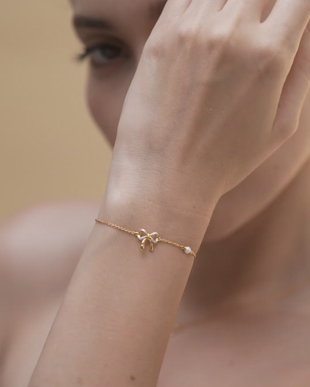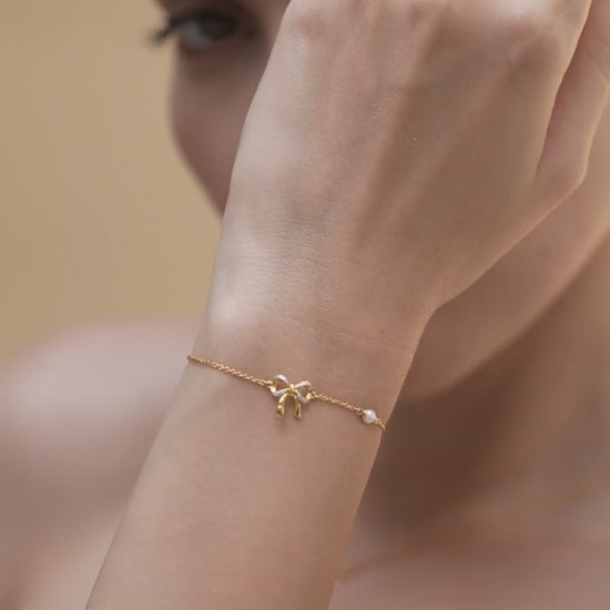 This bracelet showcases a dual-tone bow charm with subtle moissanite accents. The gold chain and elegant detailing make it ideal for gifting.