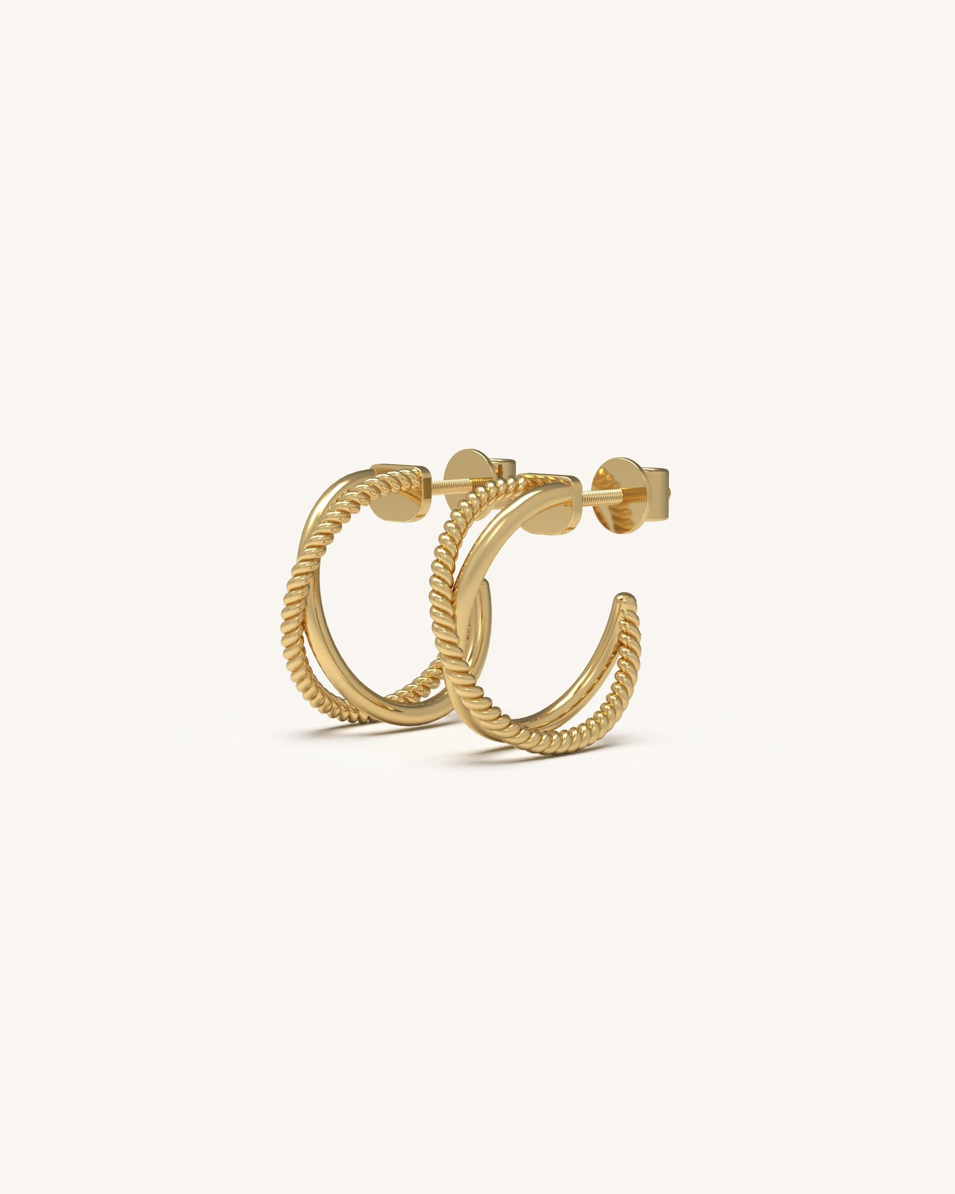 A refined pair of crossover hoop earrings in dual textured yellow gold finish. The open curve design wraps gracefully around the earlobe adding a sophisticated edge. These earrings combine classic styling with a twist of modern expression.