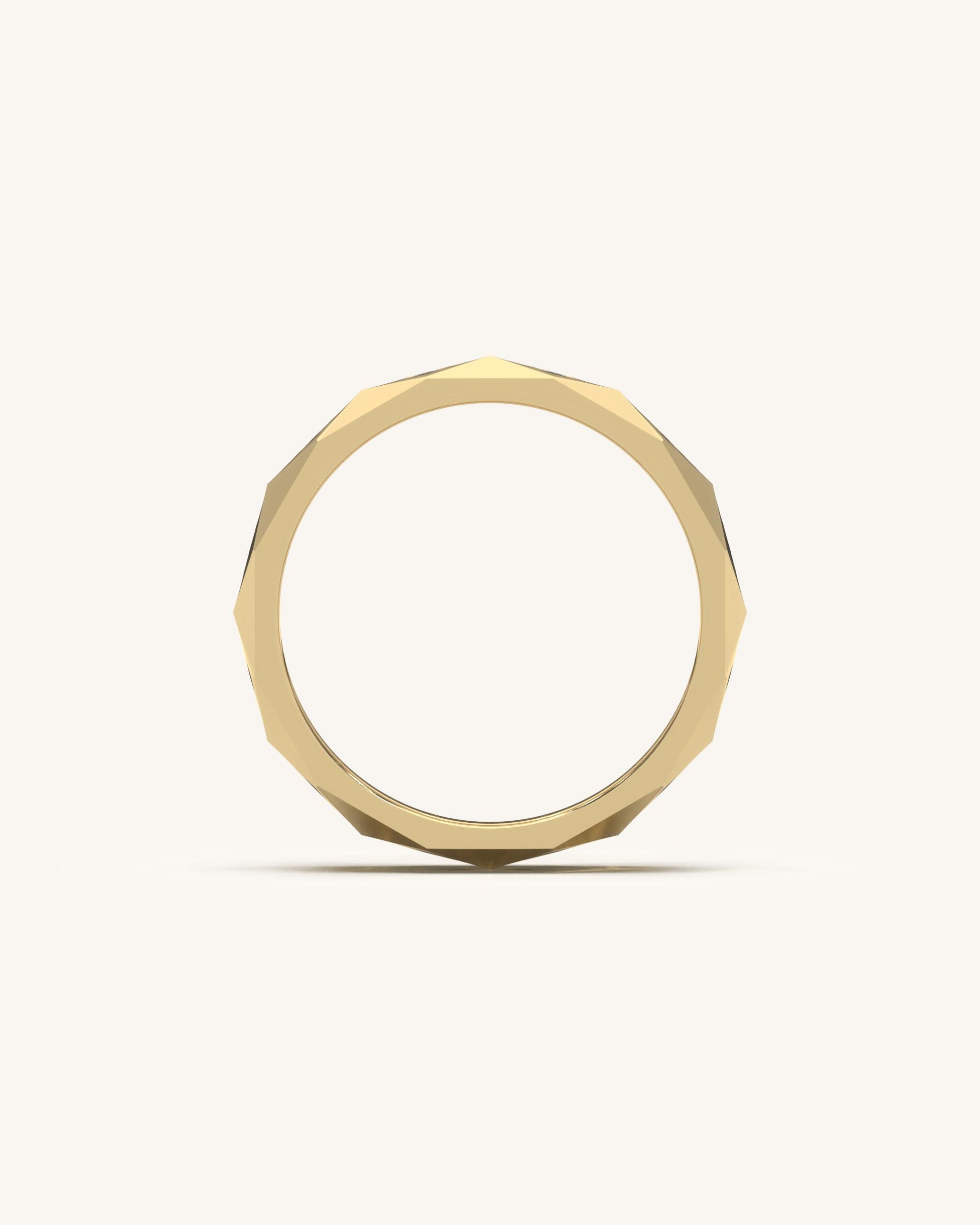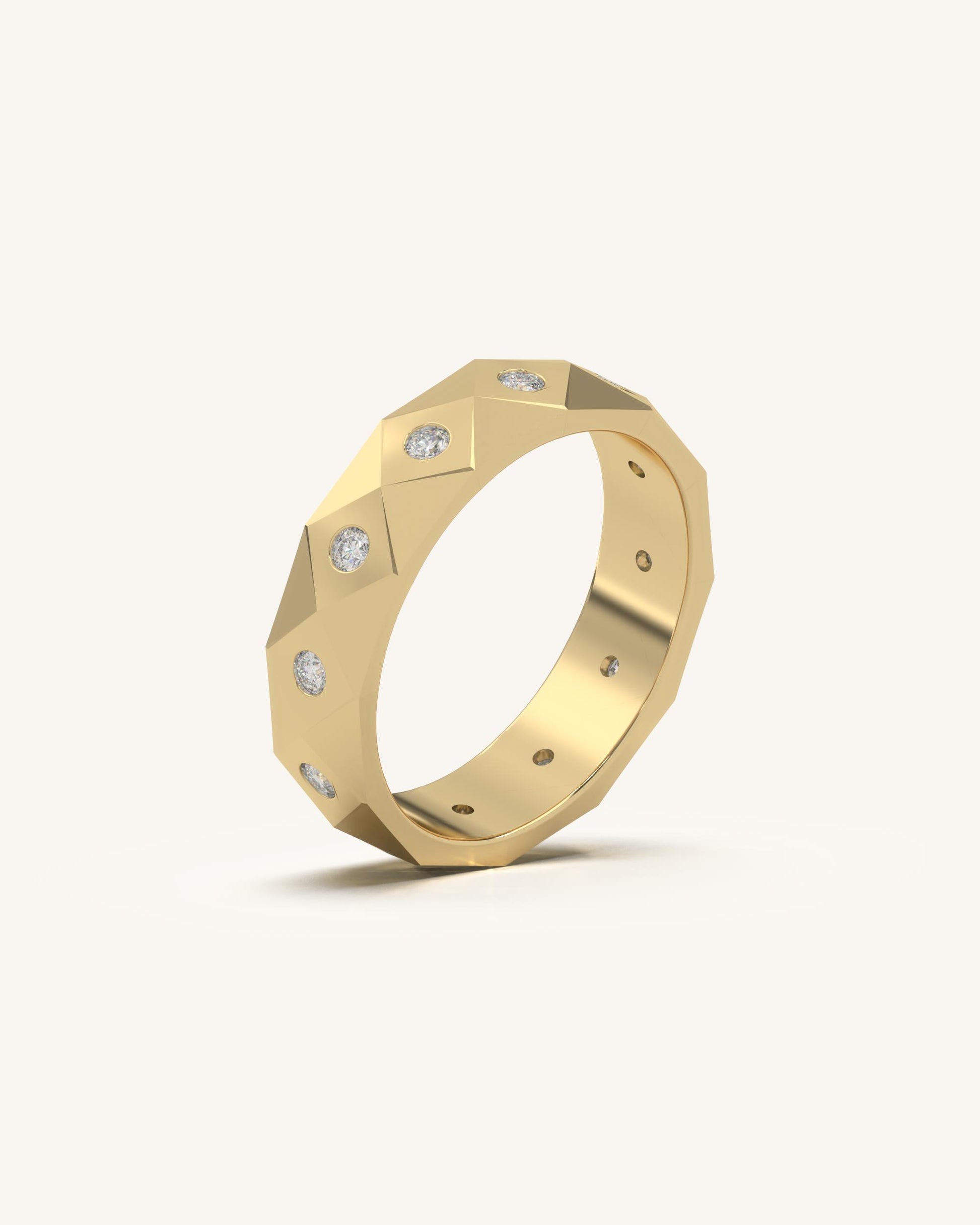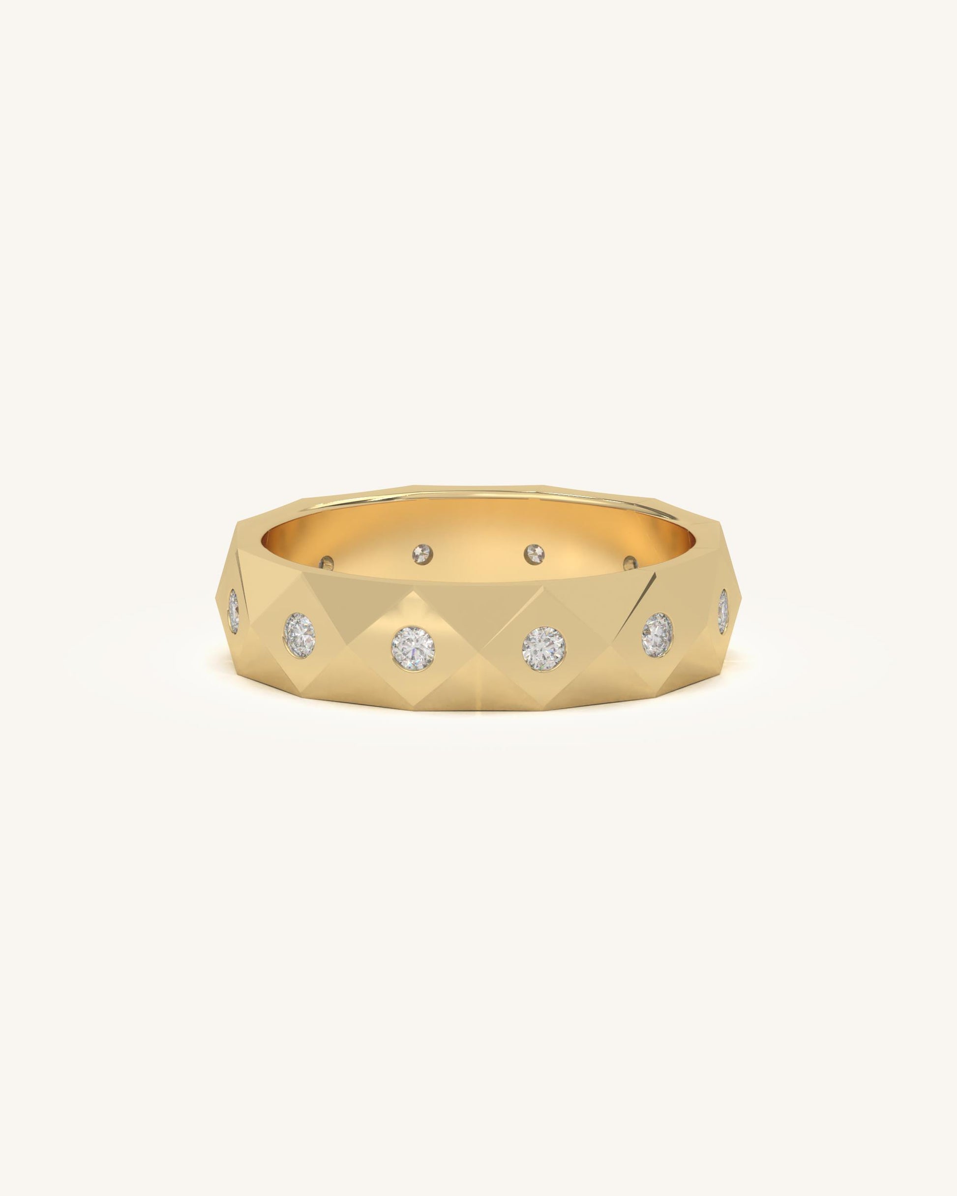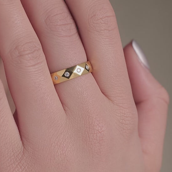 A geometric gold band detailed with evenly spaced diamond accents. Adds texture and shine to minimalist styling.