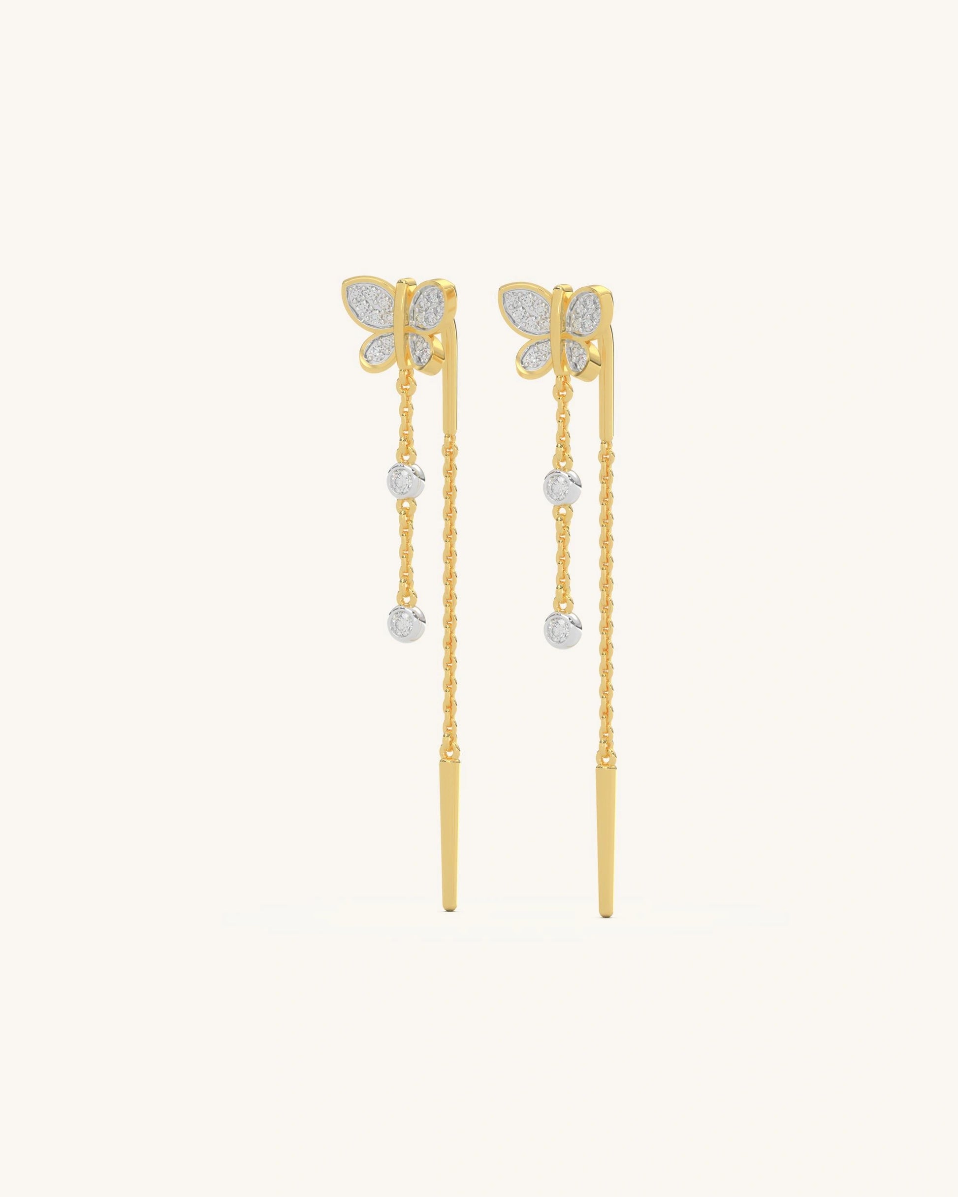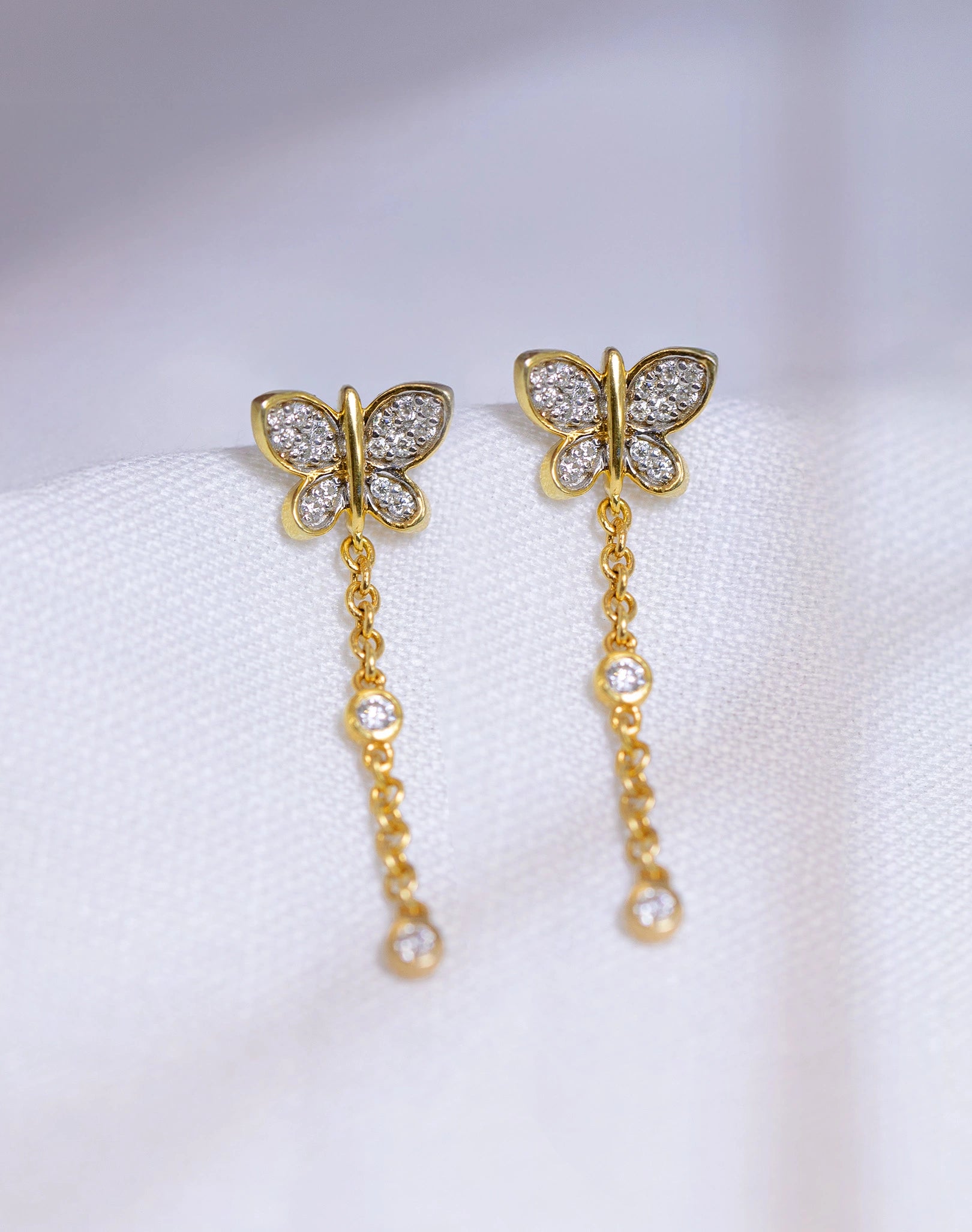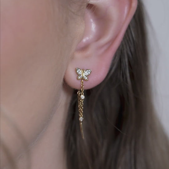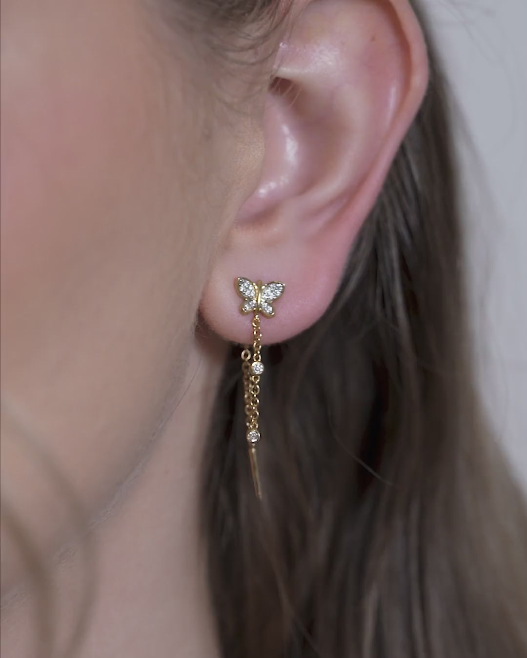 This pair features a delicate butterfly stud with a long gold chain that drops vertically, interspersed with bezel-set moissanite stones for added elegance.