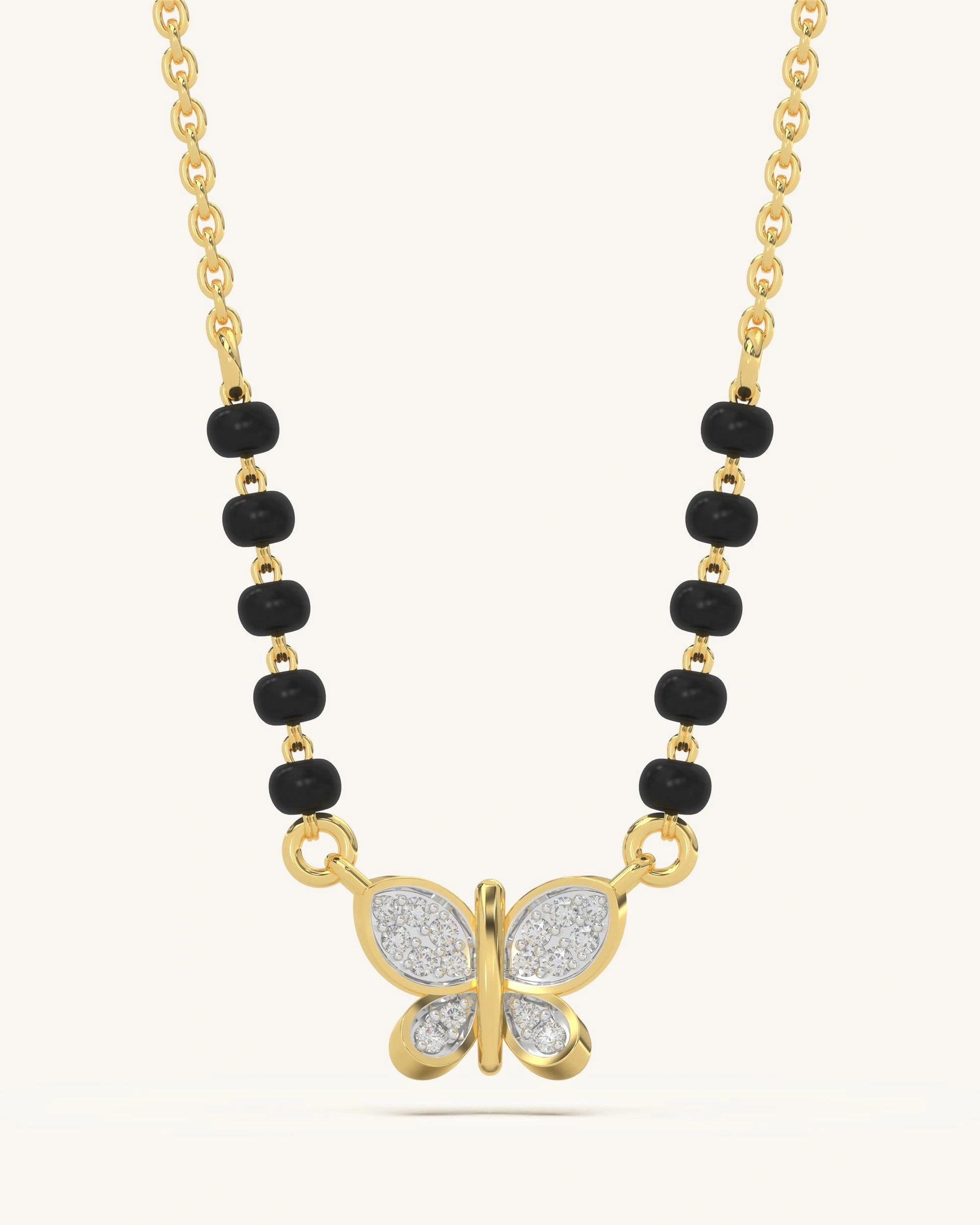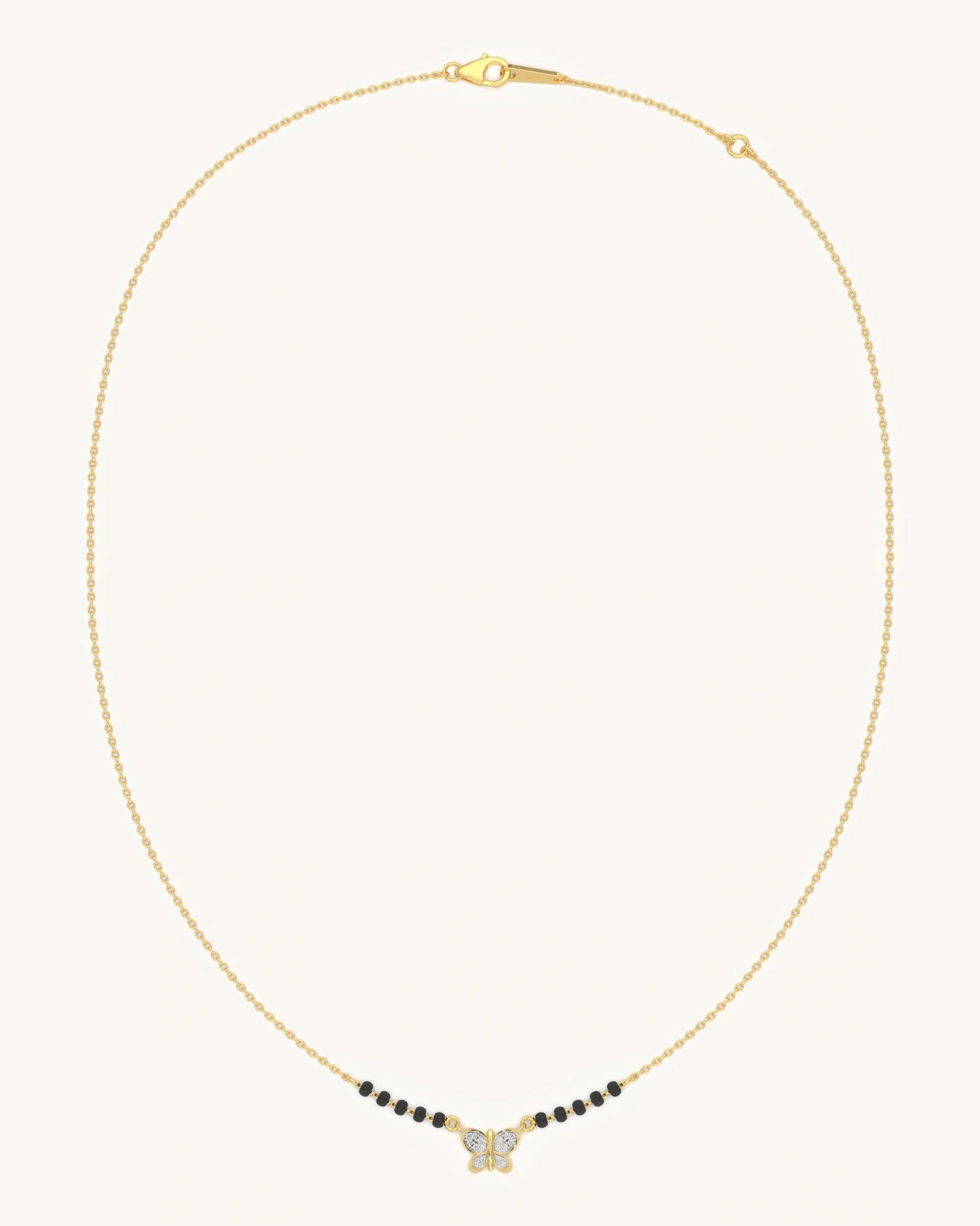 Designed in 925 silver with gold plating and embellished with Moissanite diamonds, the butterfly centre adds symbolic elegance, making it a beautiful everyday piece of contemporary mangalsutra jewellery.