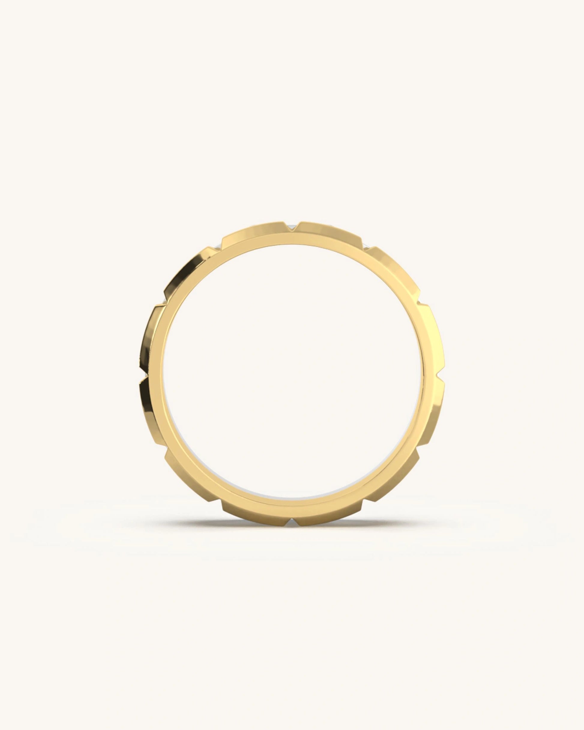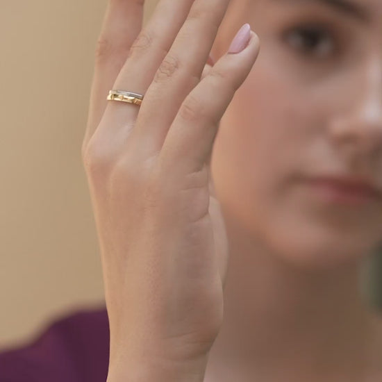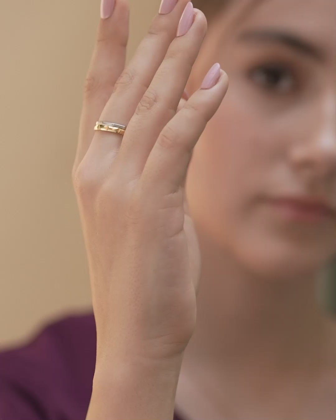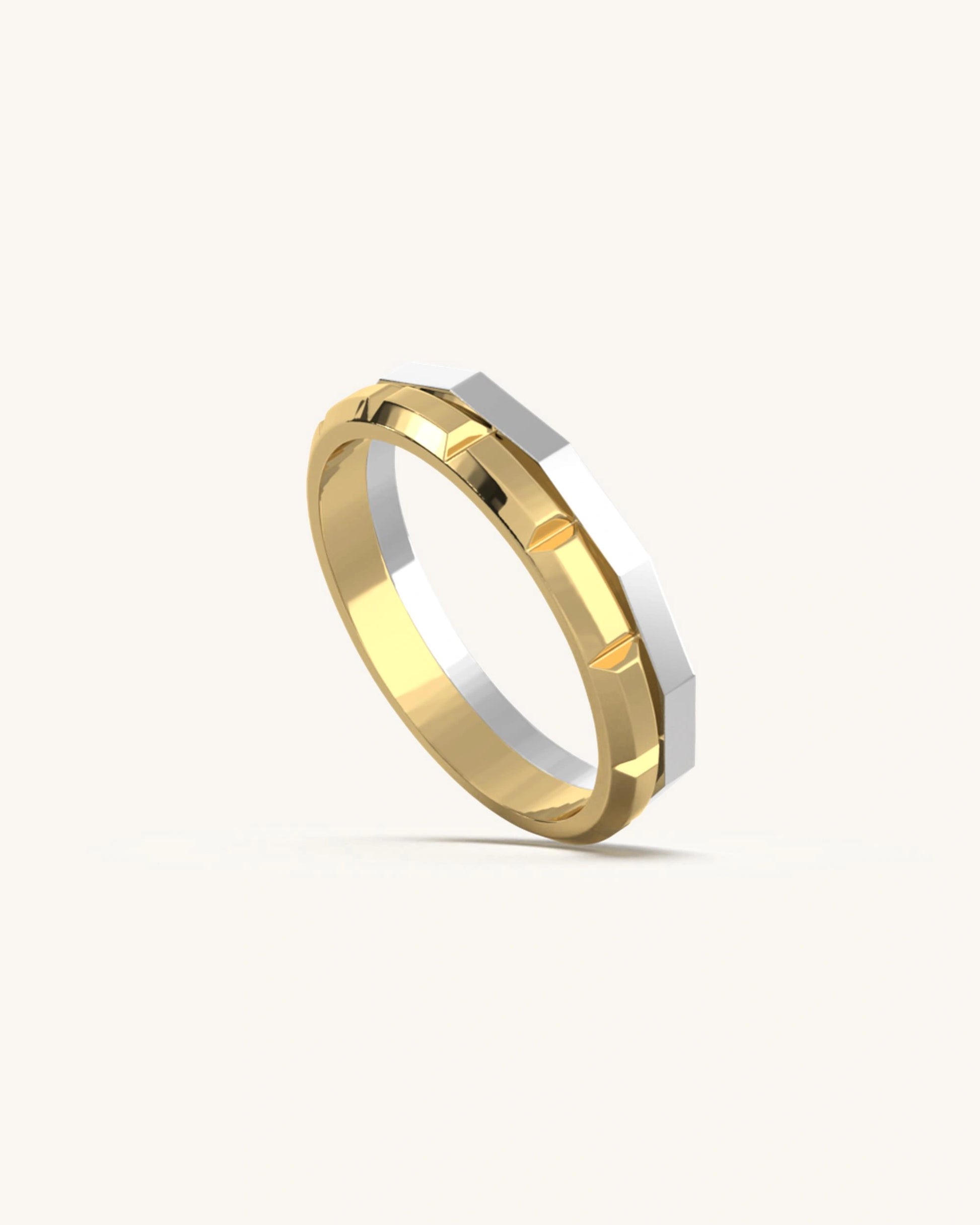 This ring brings a unique fusion of minimalism and texture with a dual-tone band. The segmented upper design sits atop a clean silver base, delivering contrast and modern flair.