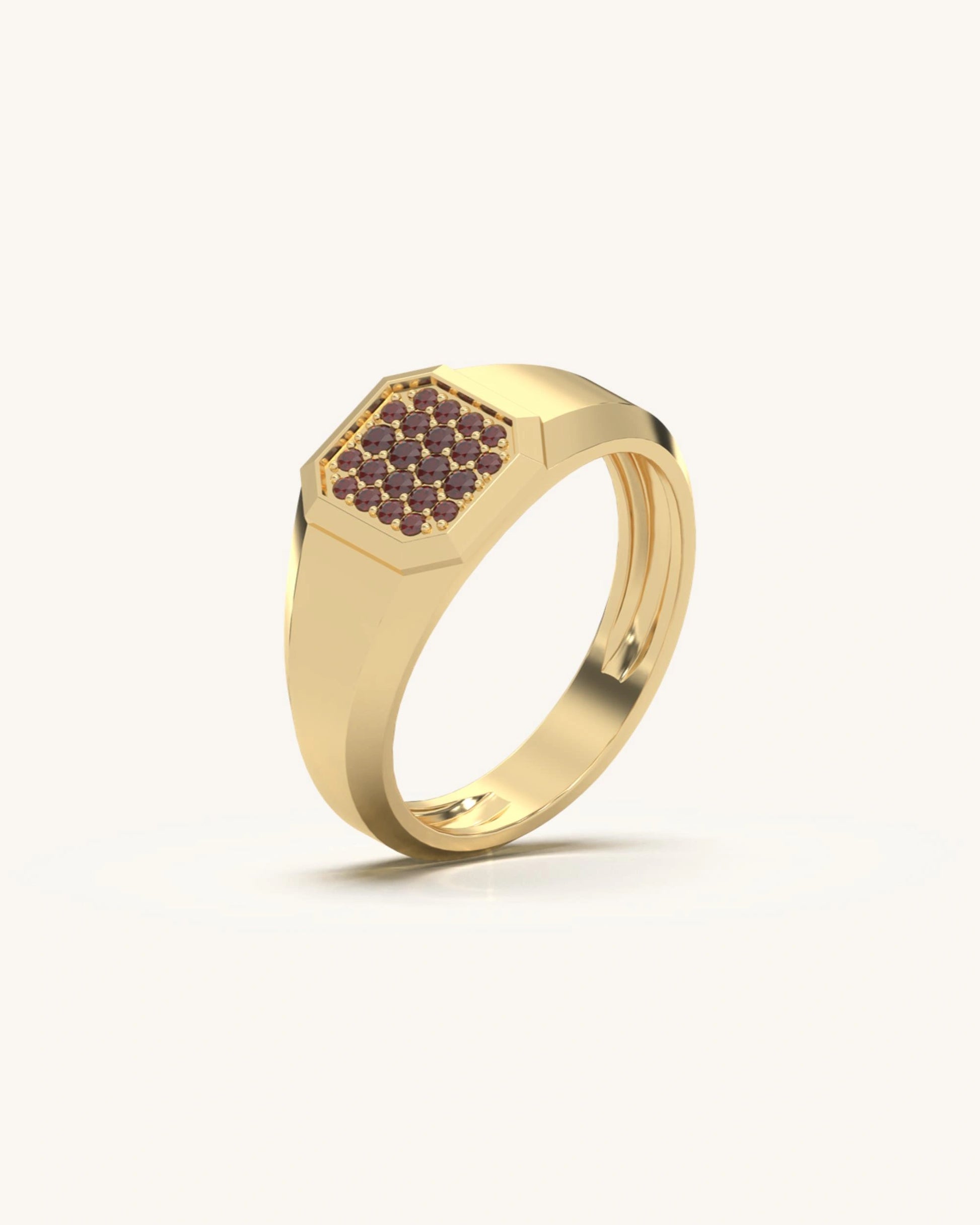 The design utilizes a recessed "honeycomb" setting to sit the stones flush, while the stepped bezel adds architectural depth. The tapered shank is ergonomically curved for a comfortable, balanced fit.