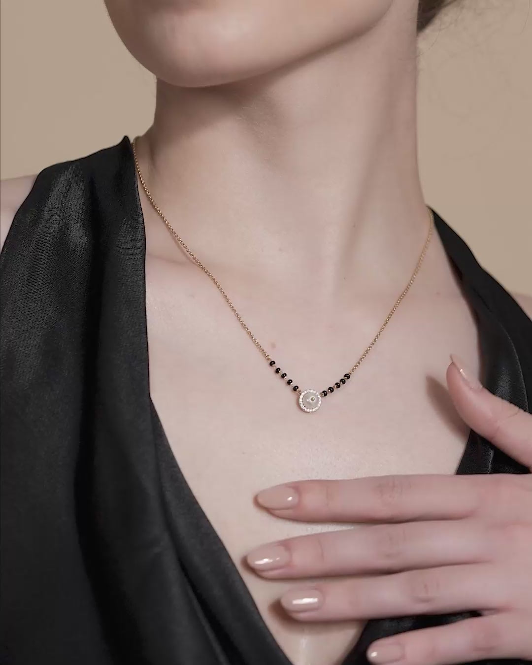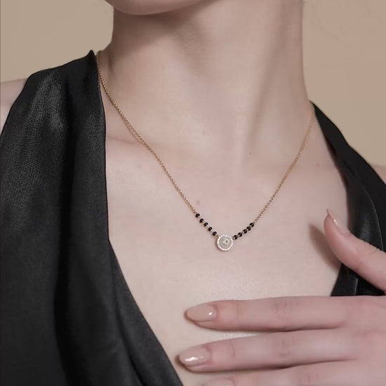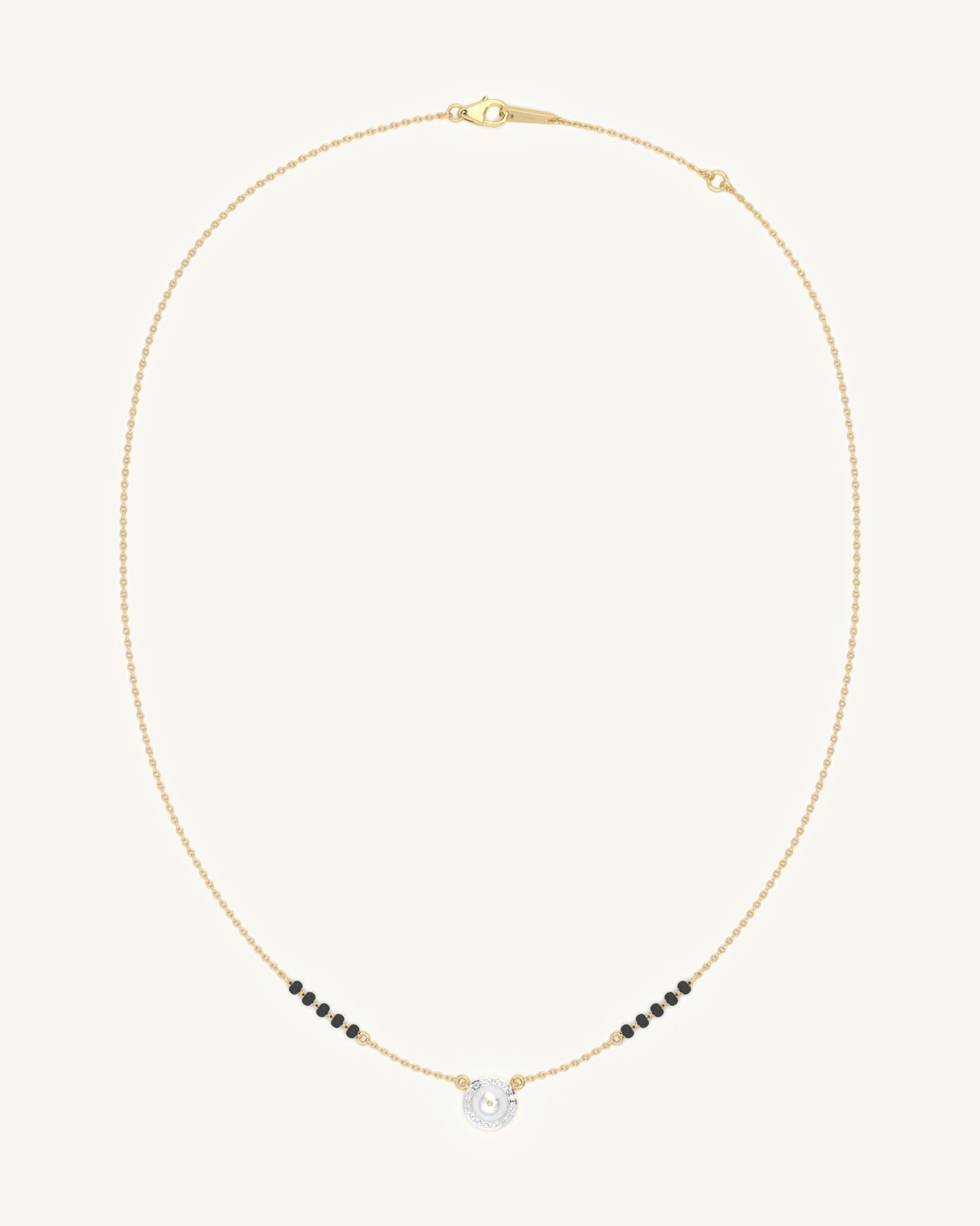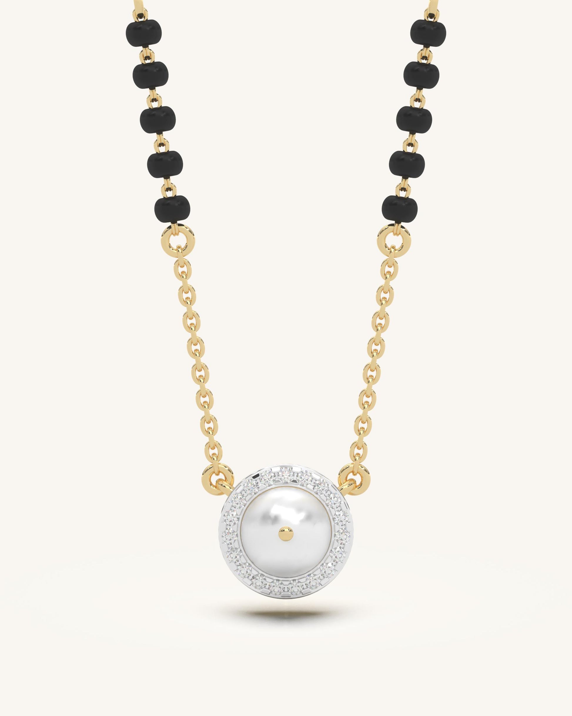 A traditional yet modern mangalsutra style necklace featuring a round pearl in a circular diamond frame. The gold toned chain is adorned with small black beads that lend a cultural essence to the design. It blends heritage with a contemporary twist.
