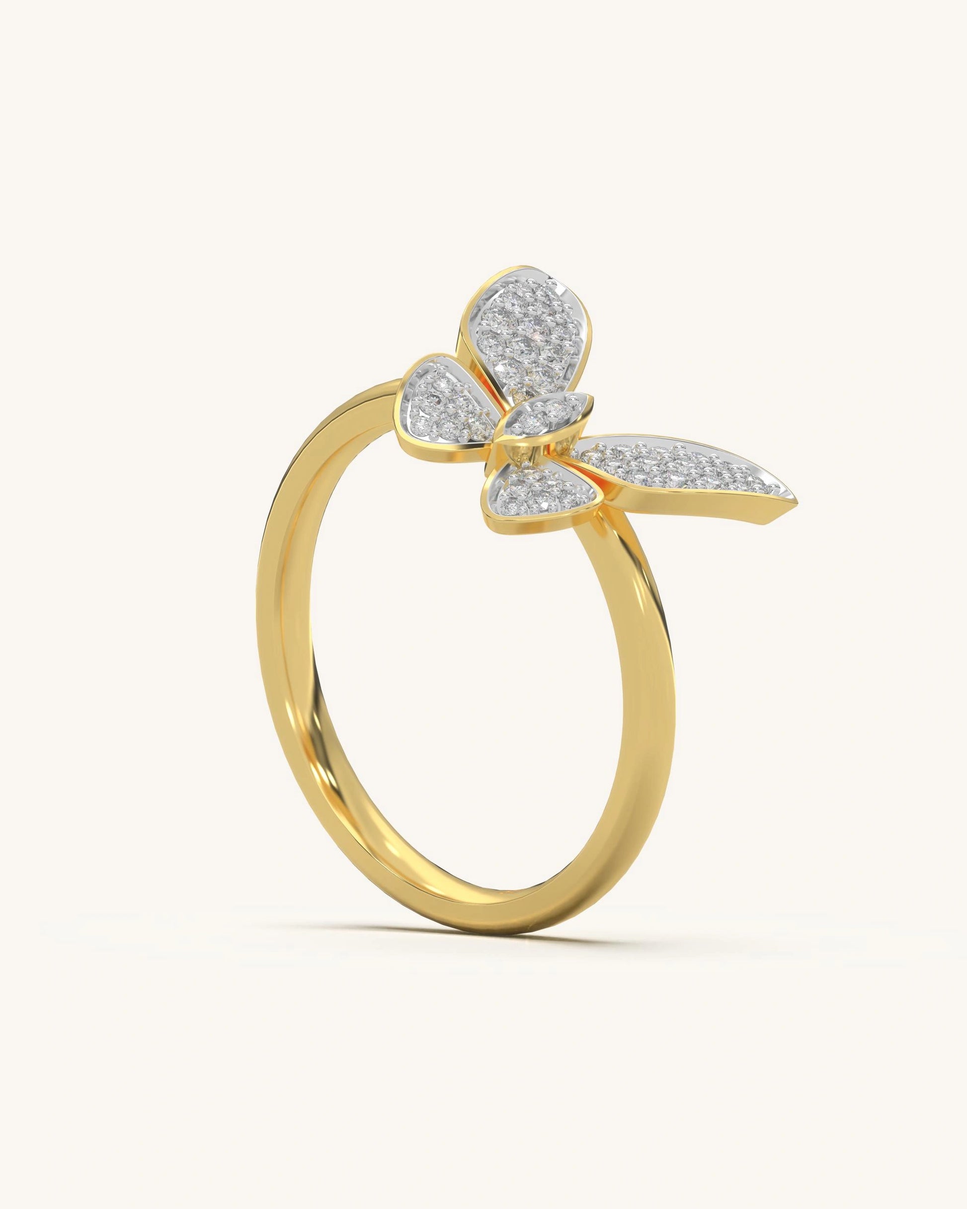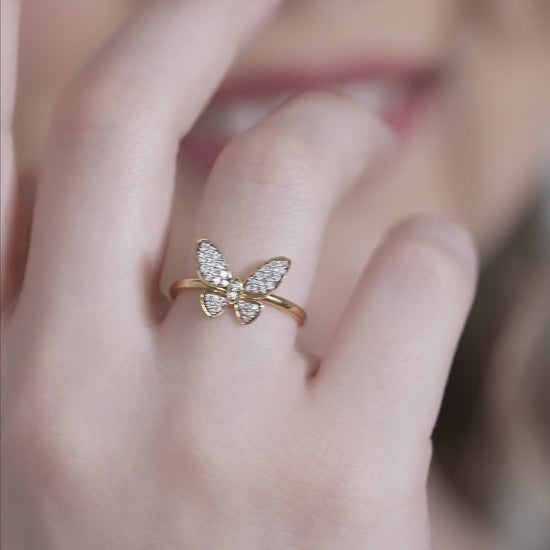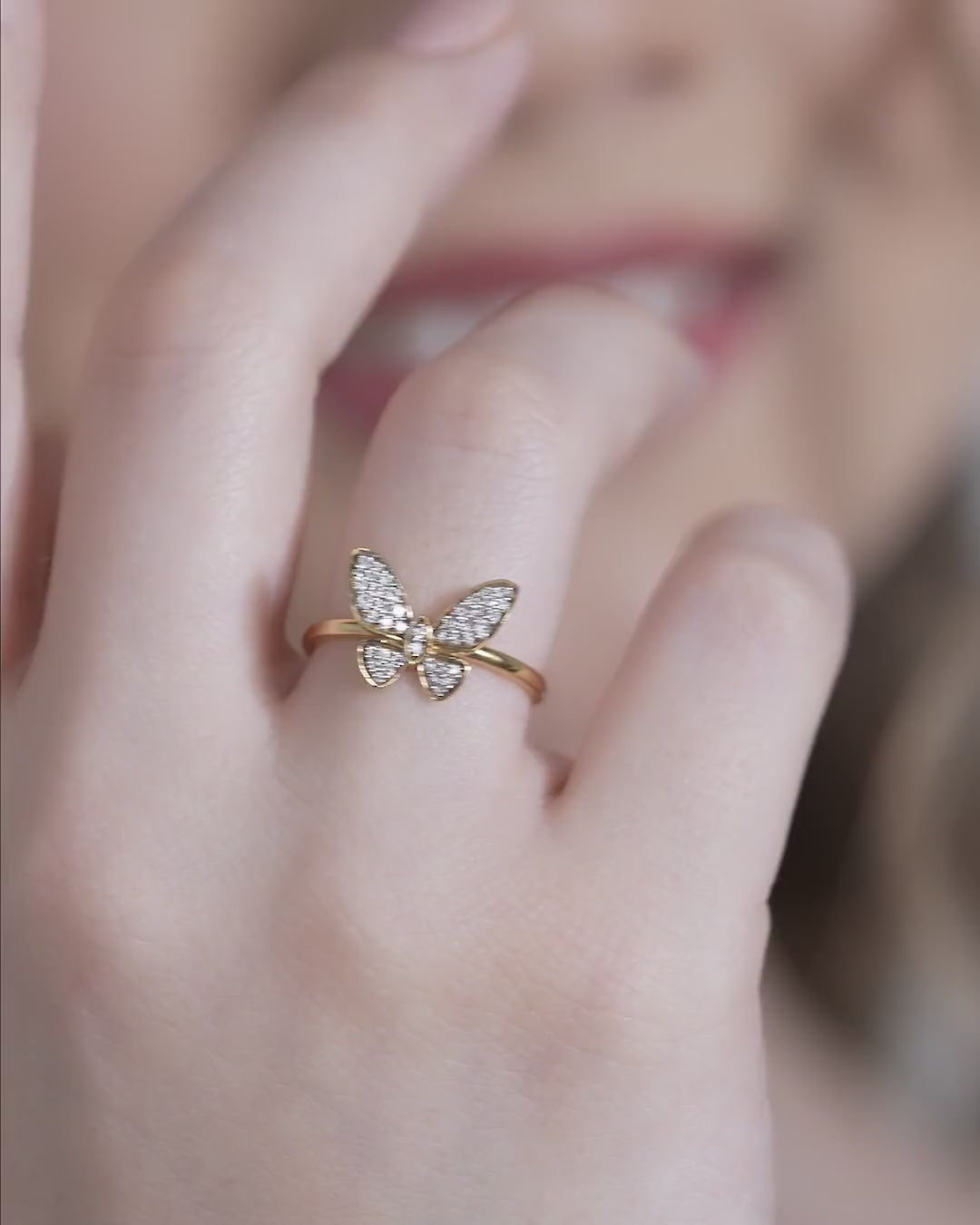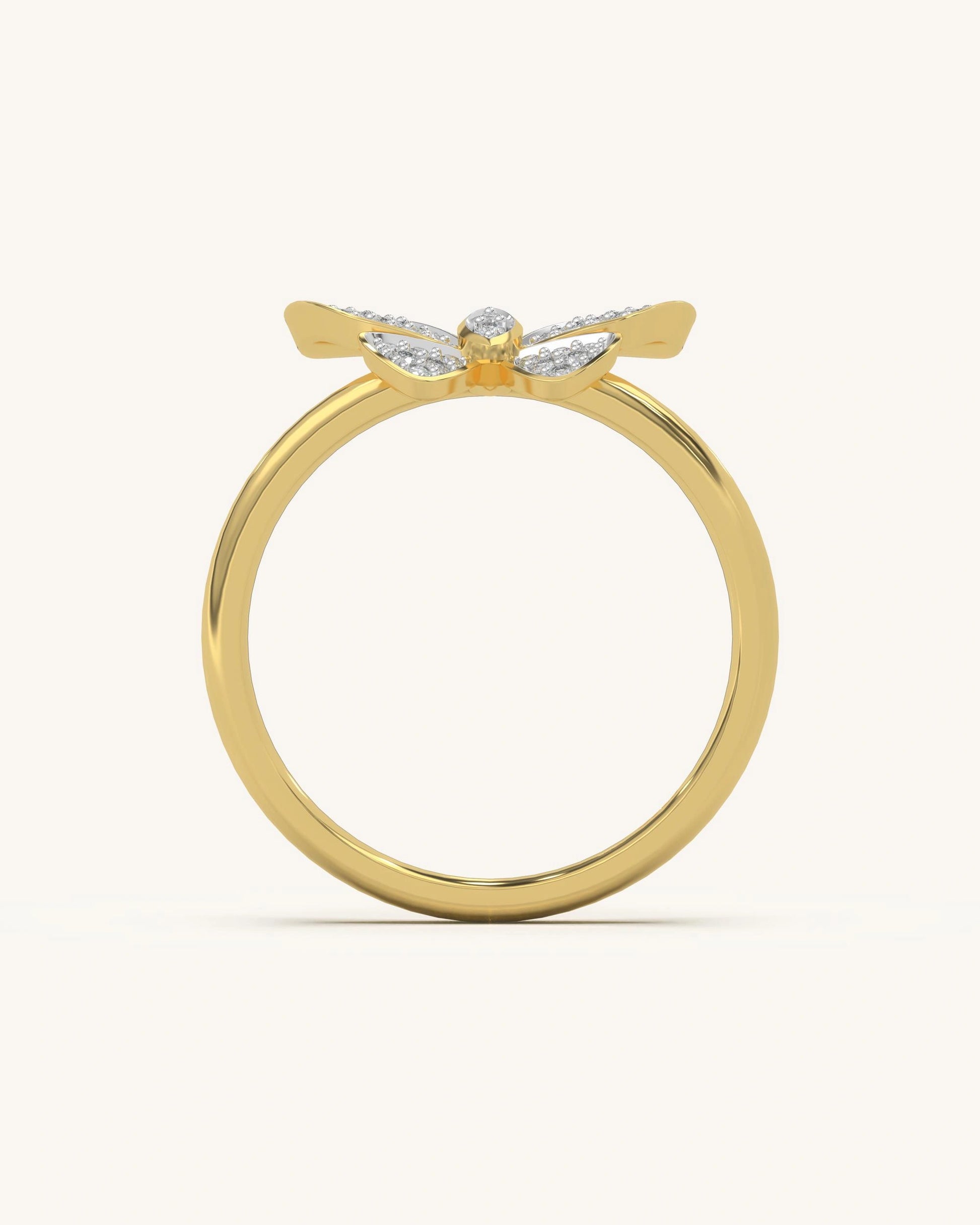 A symmetrical butterfly design with rounded wings fully paved with bright moissanite stones sits gracefully atop a polished golden band.