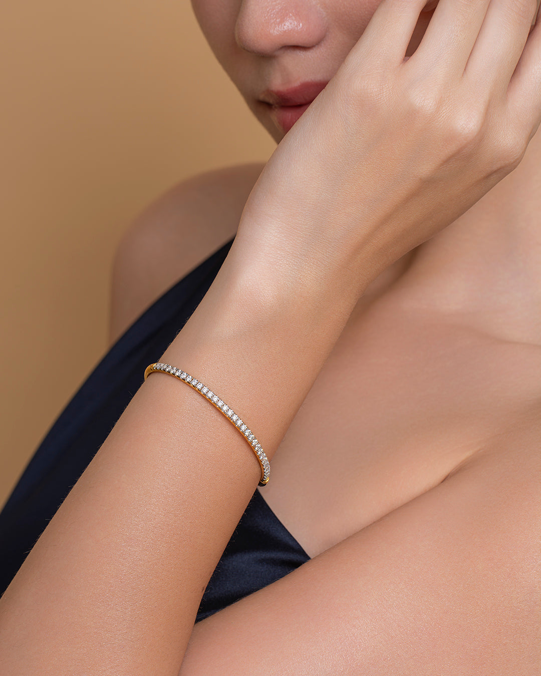 A timeless design, this bracelet features a full row of closely set round moissanite diamonds in pave style across the curved front of the open bangle.