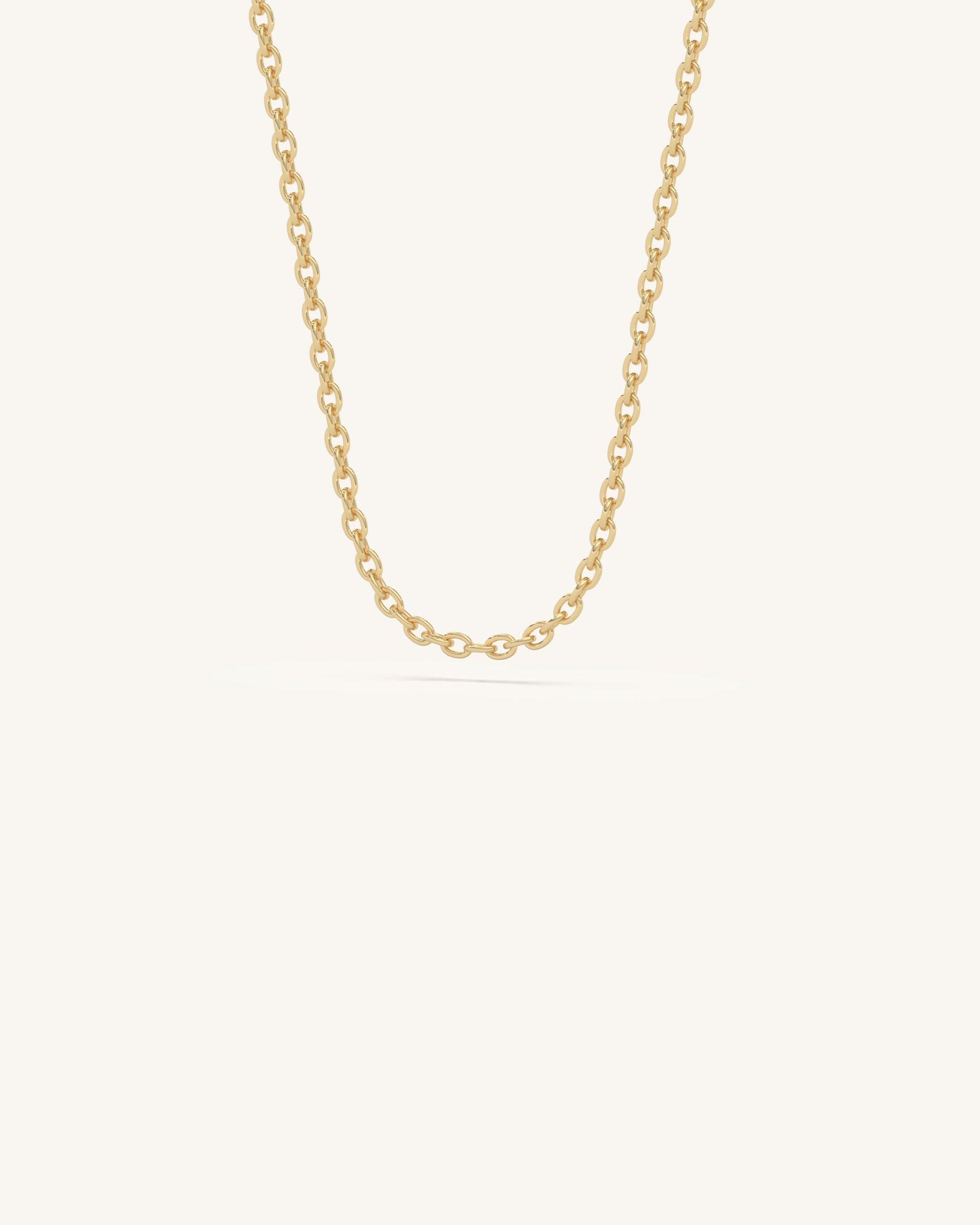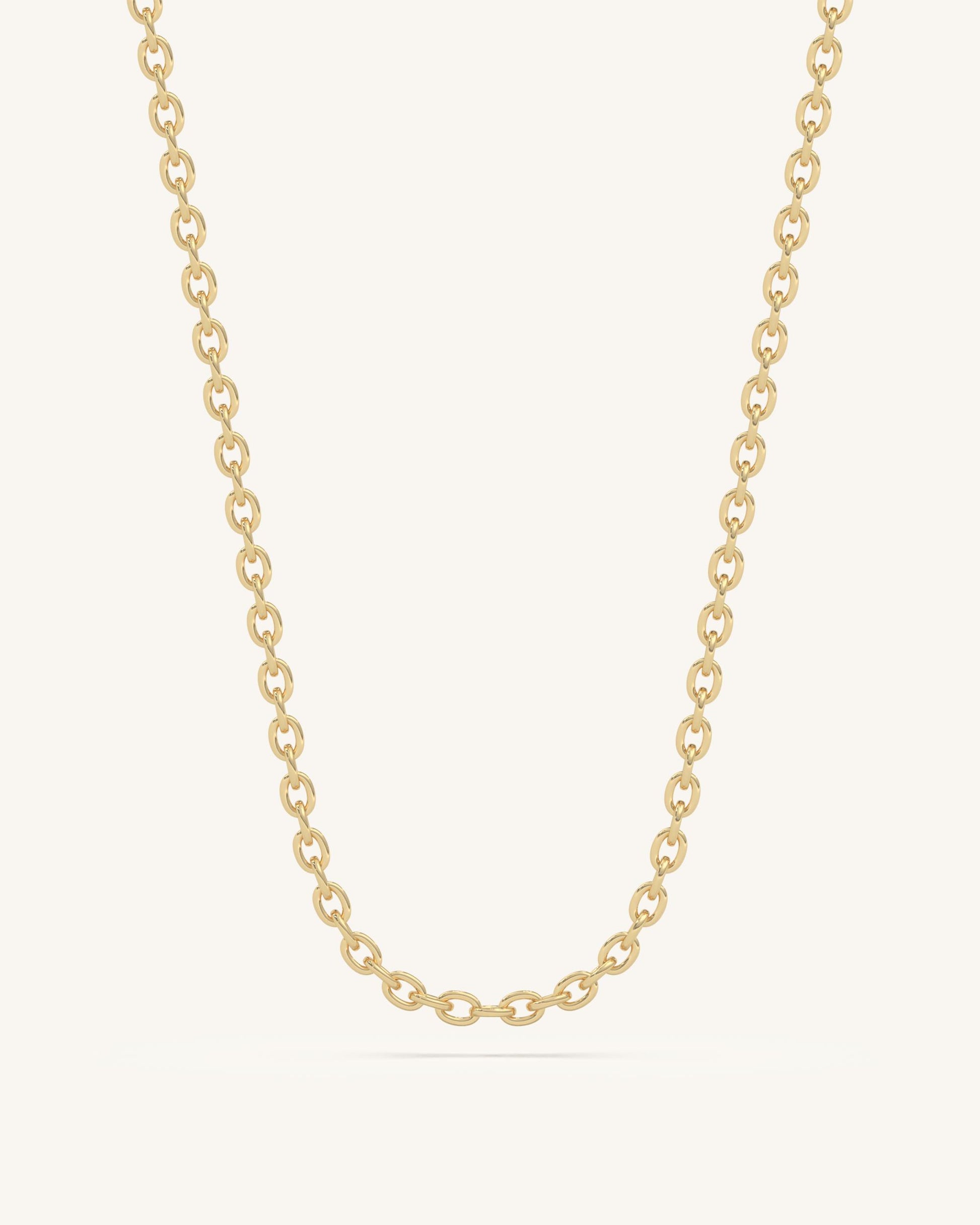 A clean and modern chain featuring interlocked oval links in a polished gold finish. Its simple yet impactful style adds a strong statement to everyday looks.