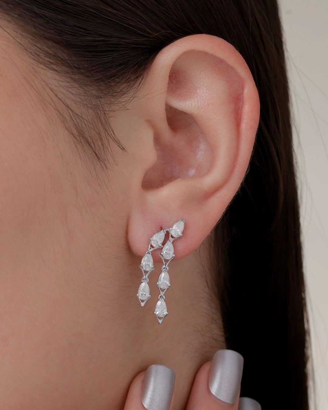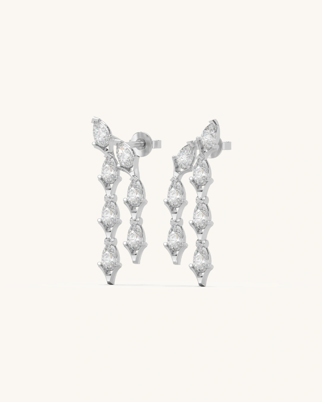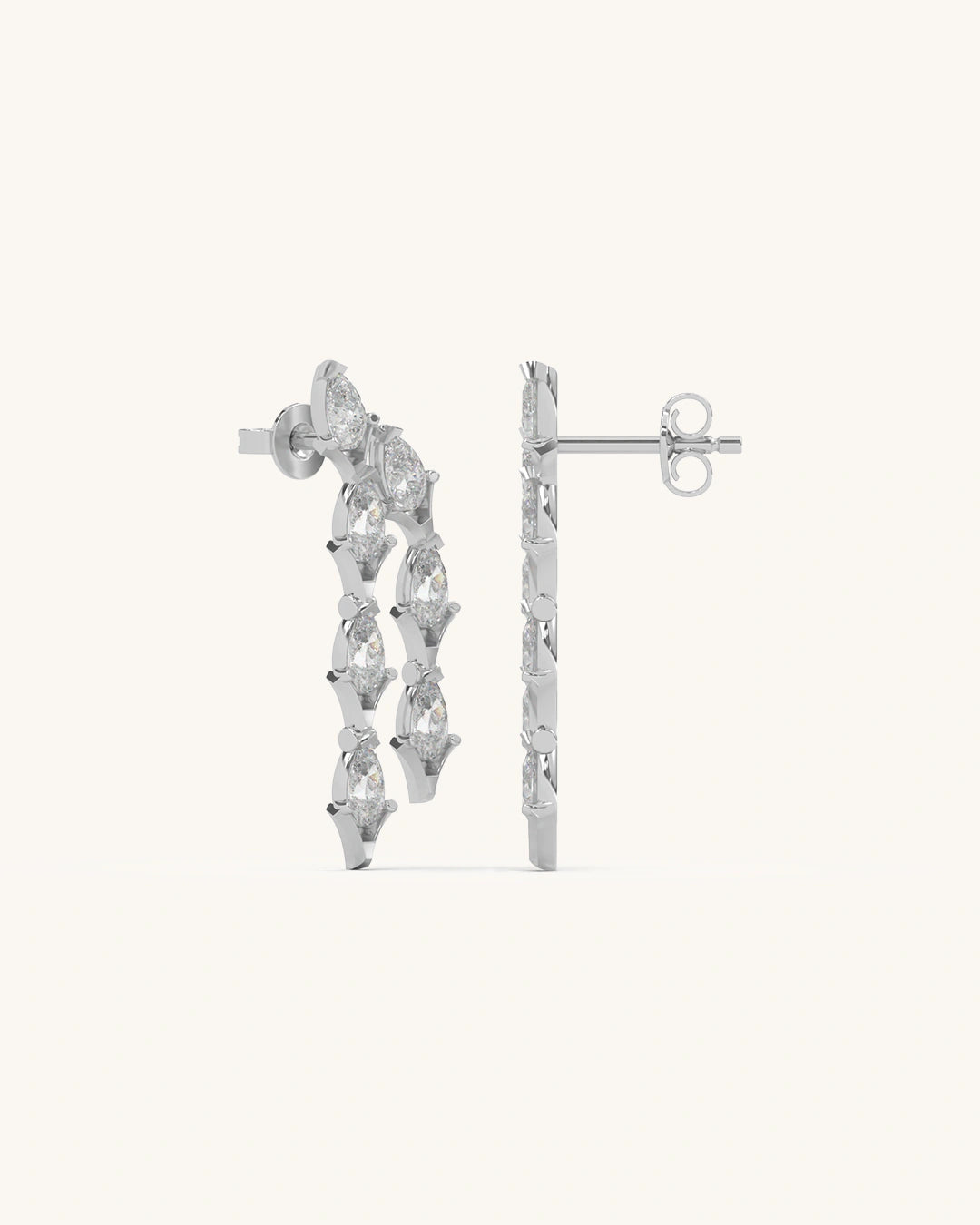 Designed with an upward arc, these earrings climb along the ear with precision-cut pear-shaped diamonds. The dynamic curve follows the natural contour of the ear, giving an elegant lift. Each diamond is held in a minimal gold setting for a clean finish. A modern choice with sculptural appeal.