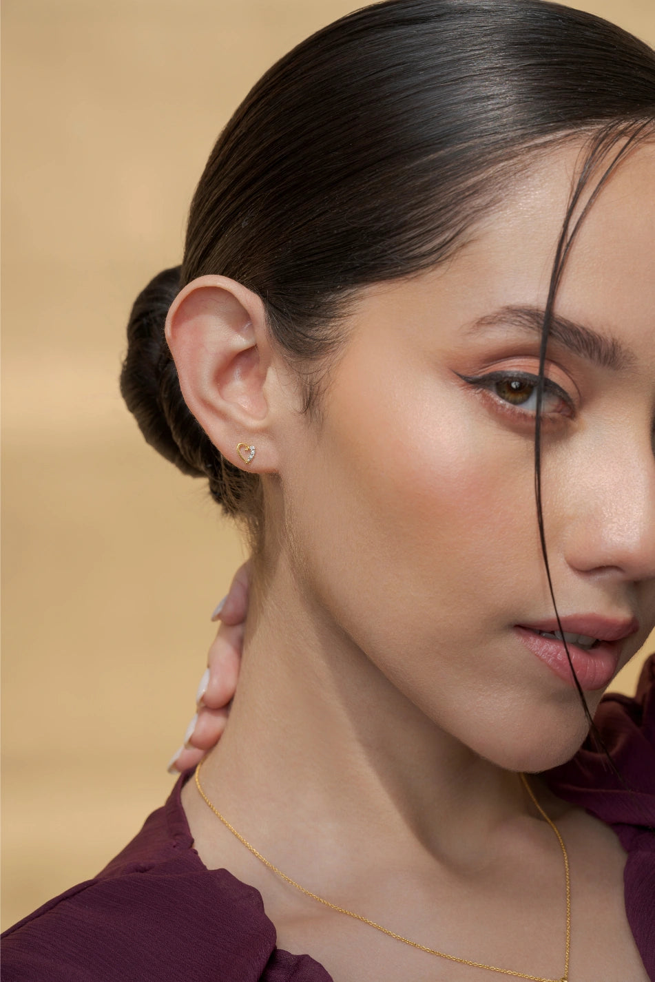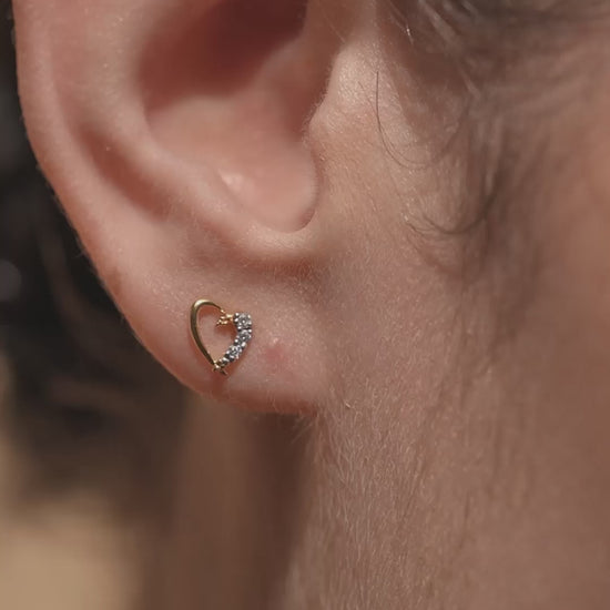These dainty studs feature an asymmetric heart design with one sleek gold-tone side and one curved moissanite-encrusted side. They sit delicately on the ear for a sweet impression.