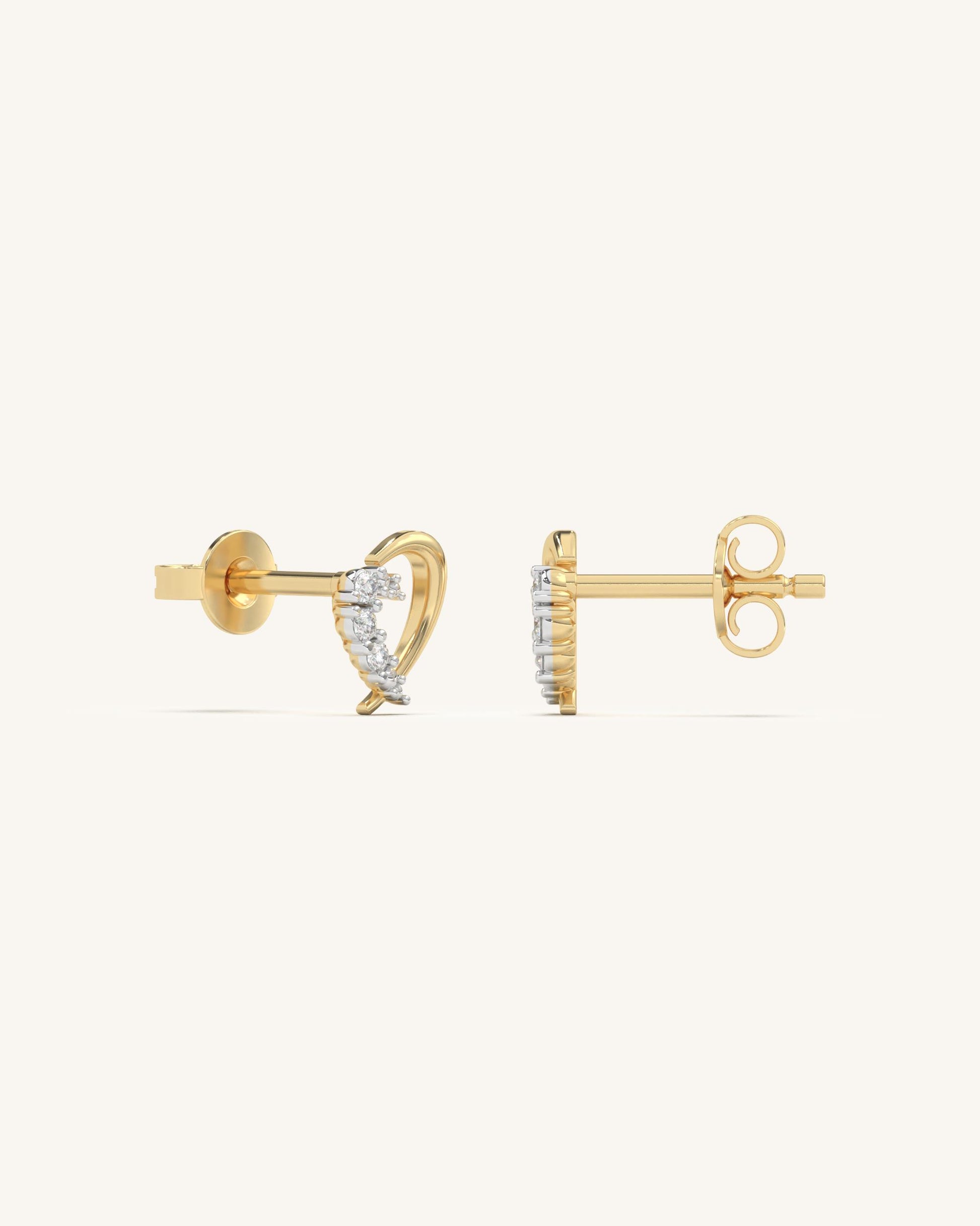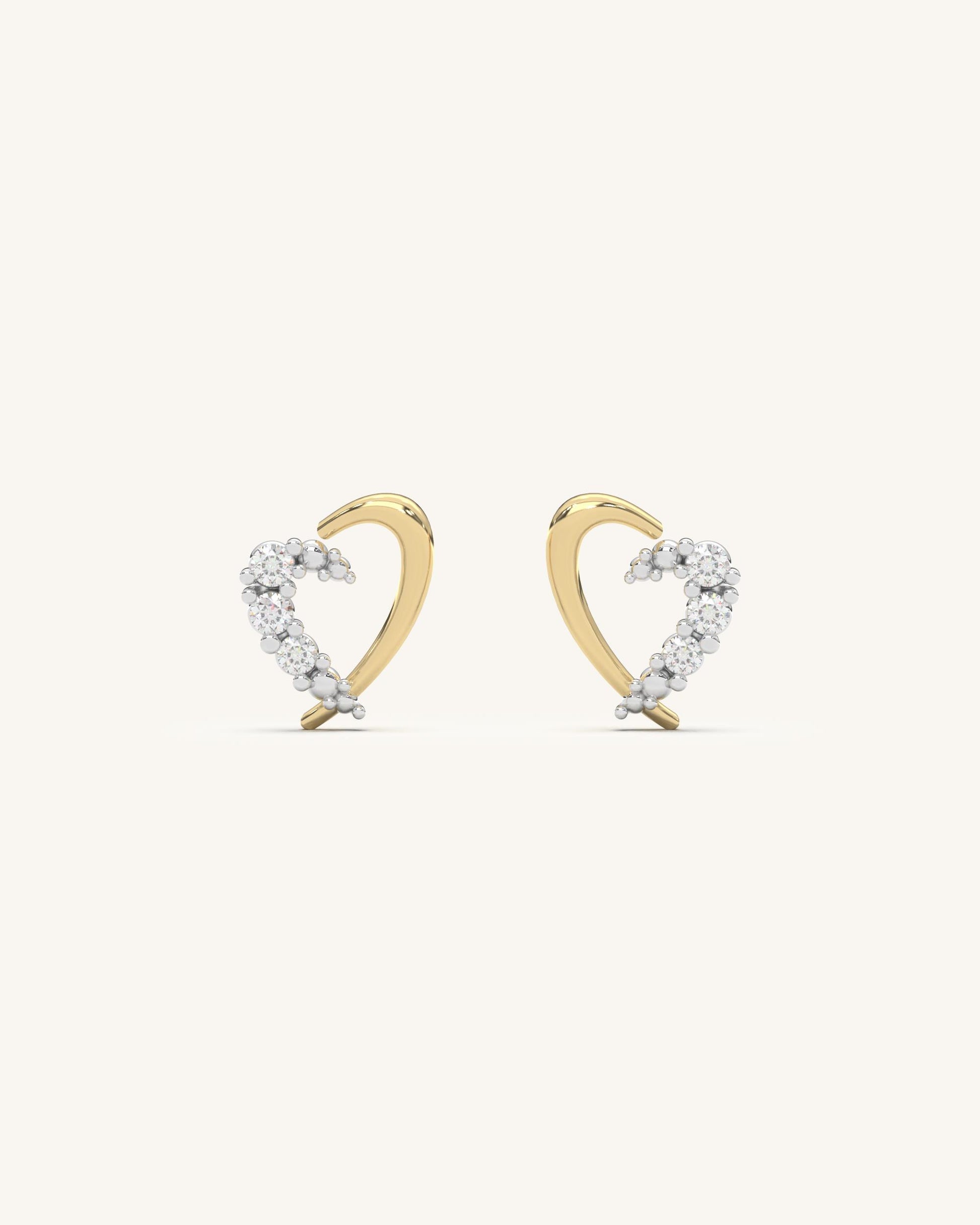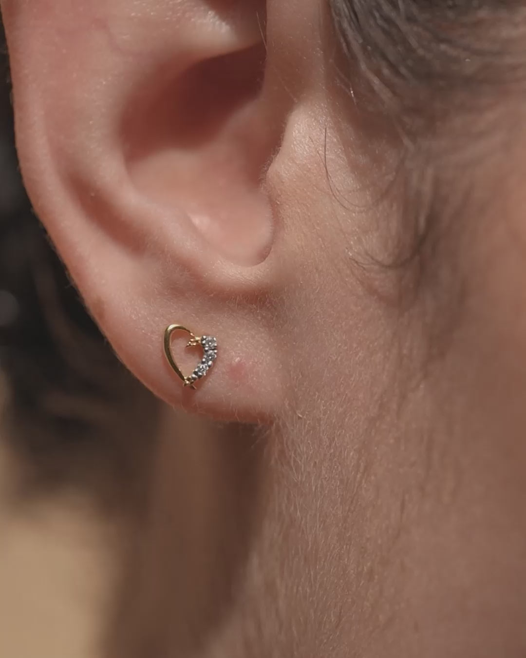 These dainty studs feature an asymmetric heart design with one sleek gold-tone side and one curved moissanite-encrusted side. They sit delicately on the ear for a sweet impression.