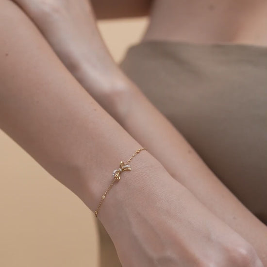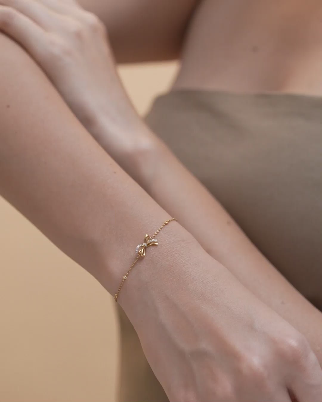 Featuring a dimensional bow motif, this bracelet blends gold and silver tones with fine moissanite sparkle. A graceful statement for the wrist.