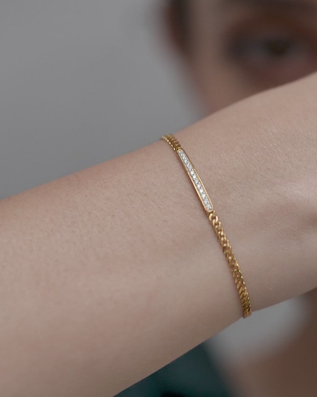 A sleek rose gold bracelet featuring a slender central bar set with a line of dazzling round diamonds.
