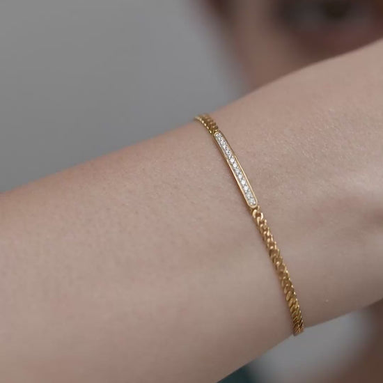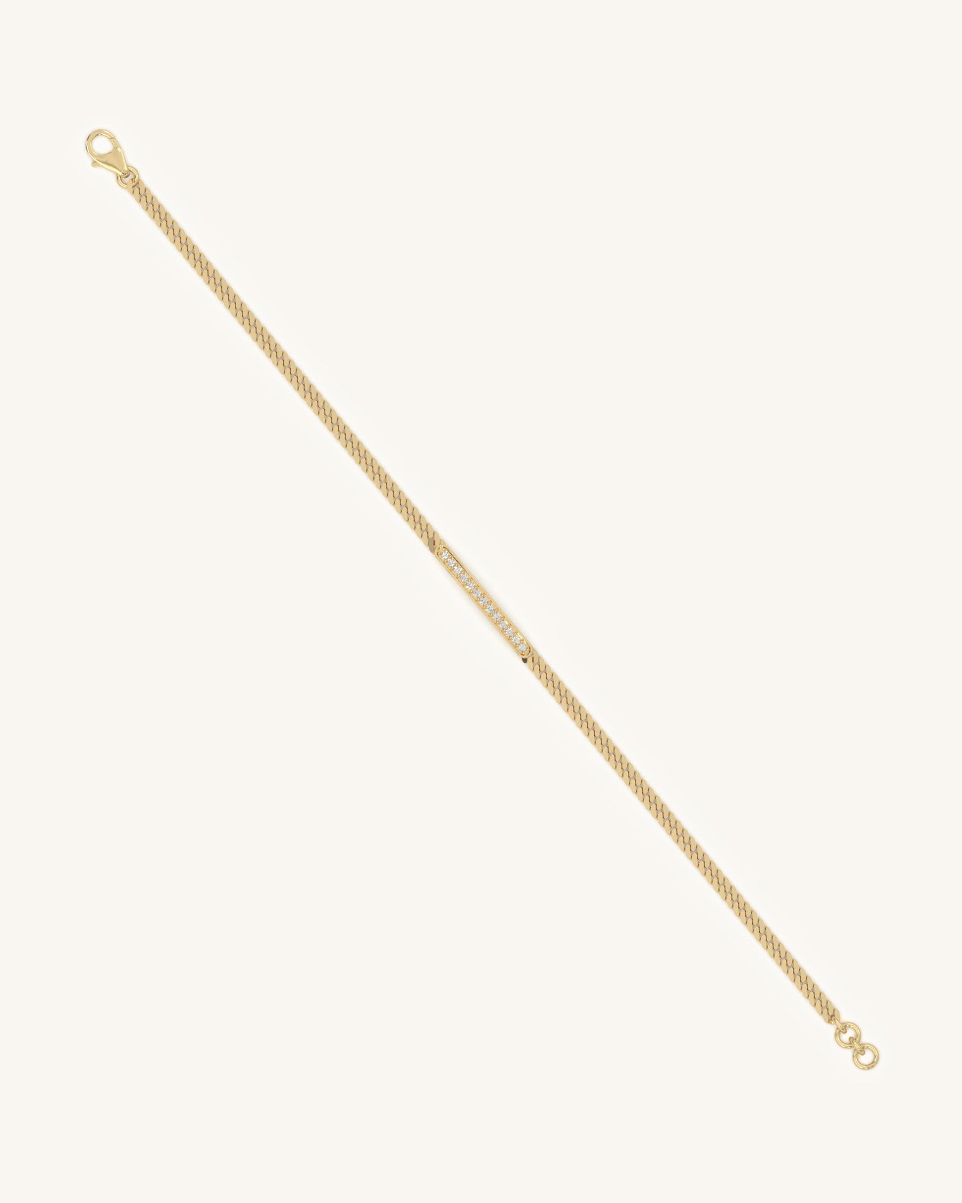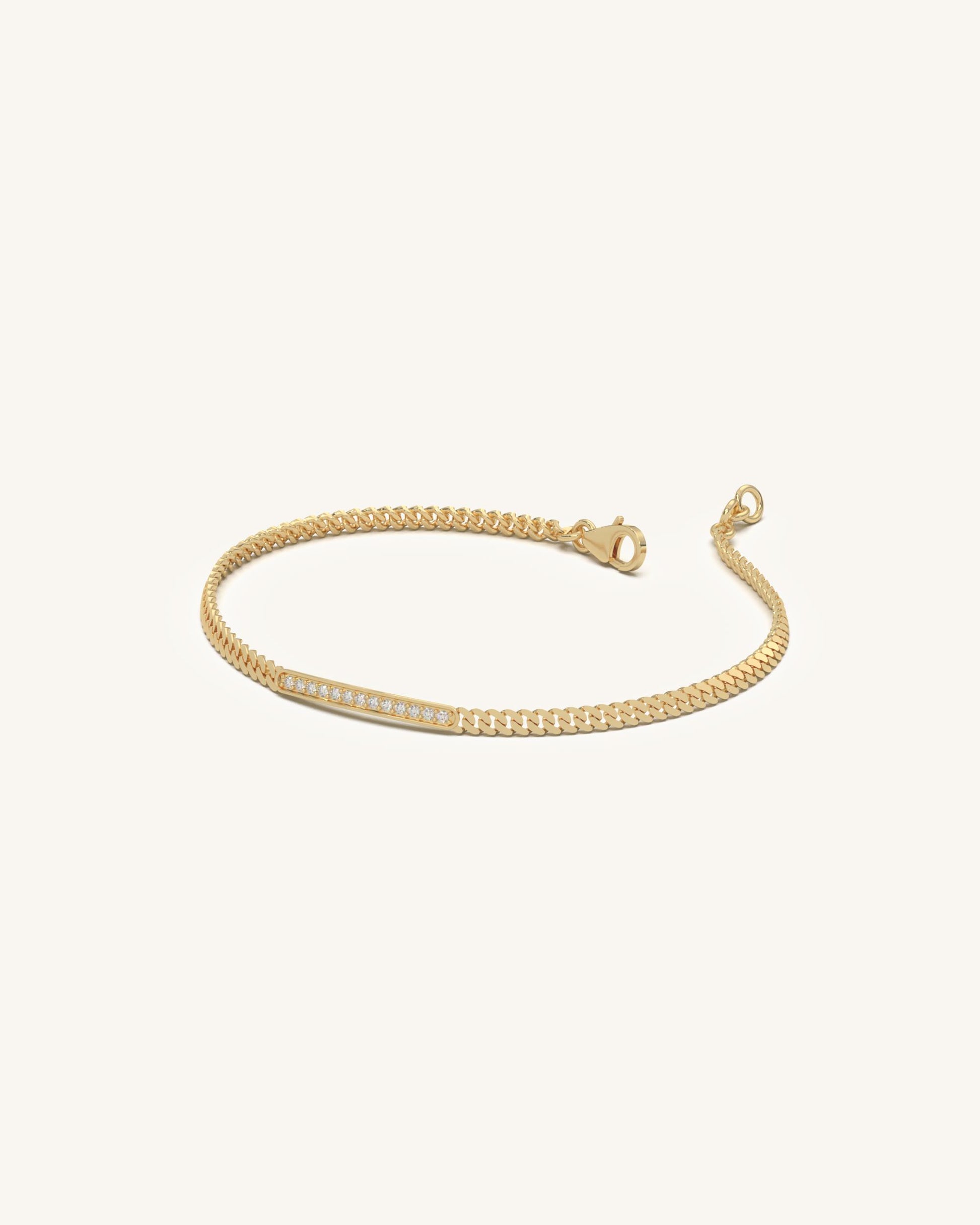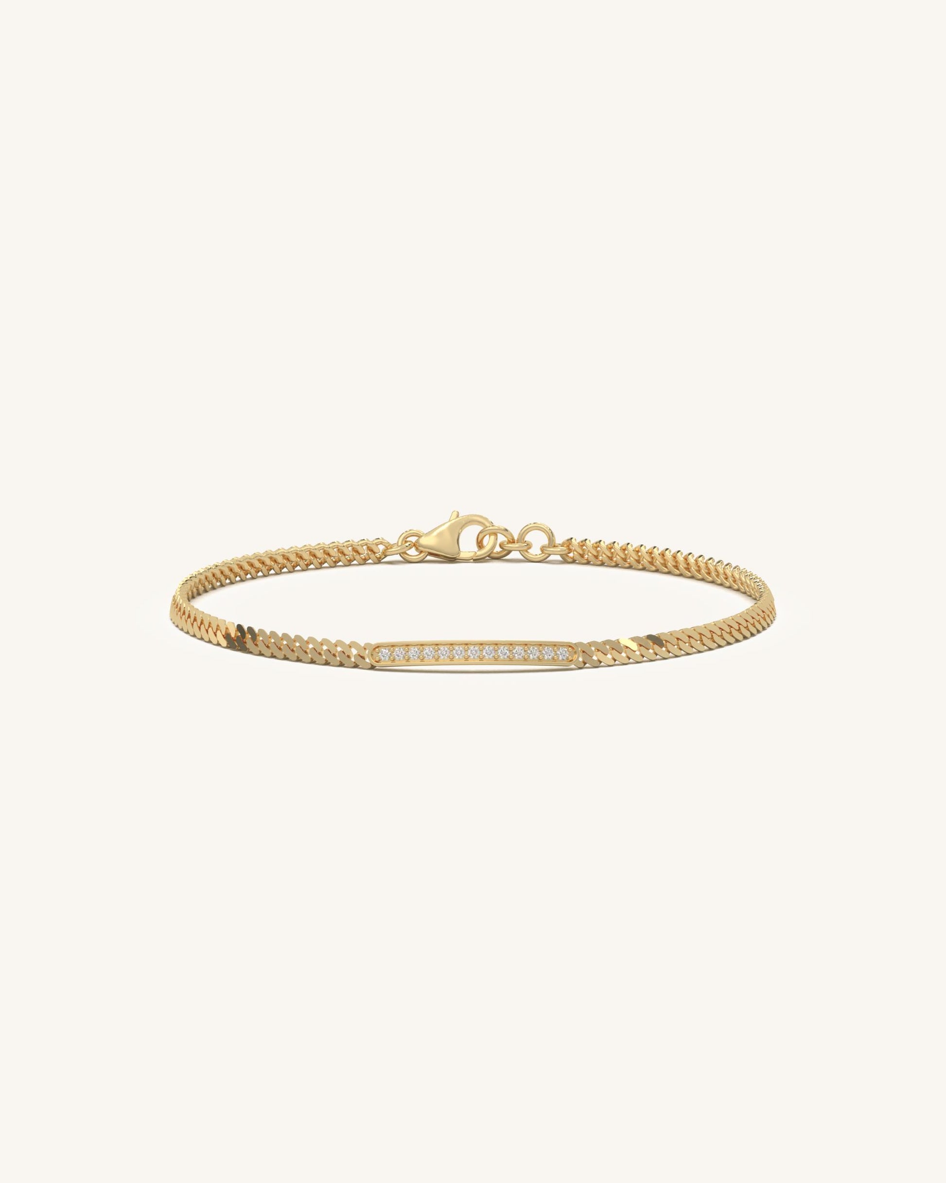 A sleek rose gold bracelet featuring a slender central bar set with a line of dazzling round diamonds.