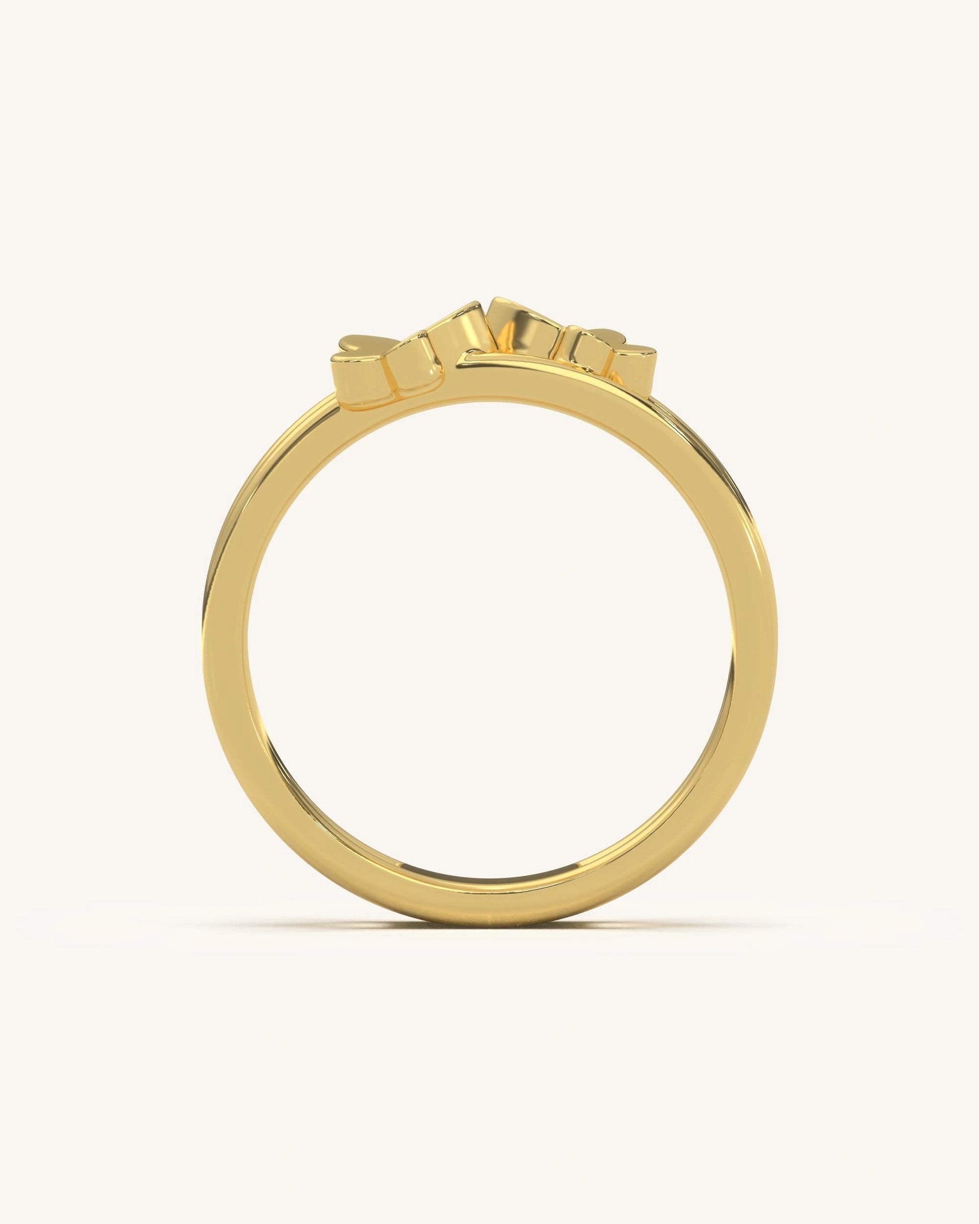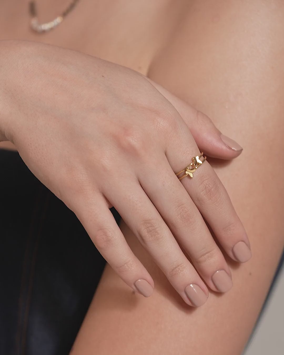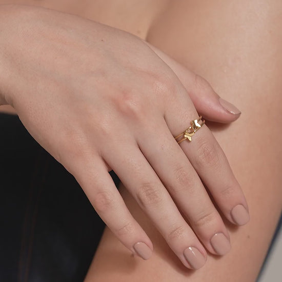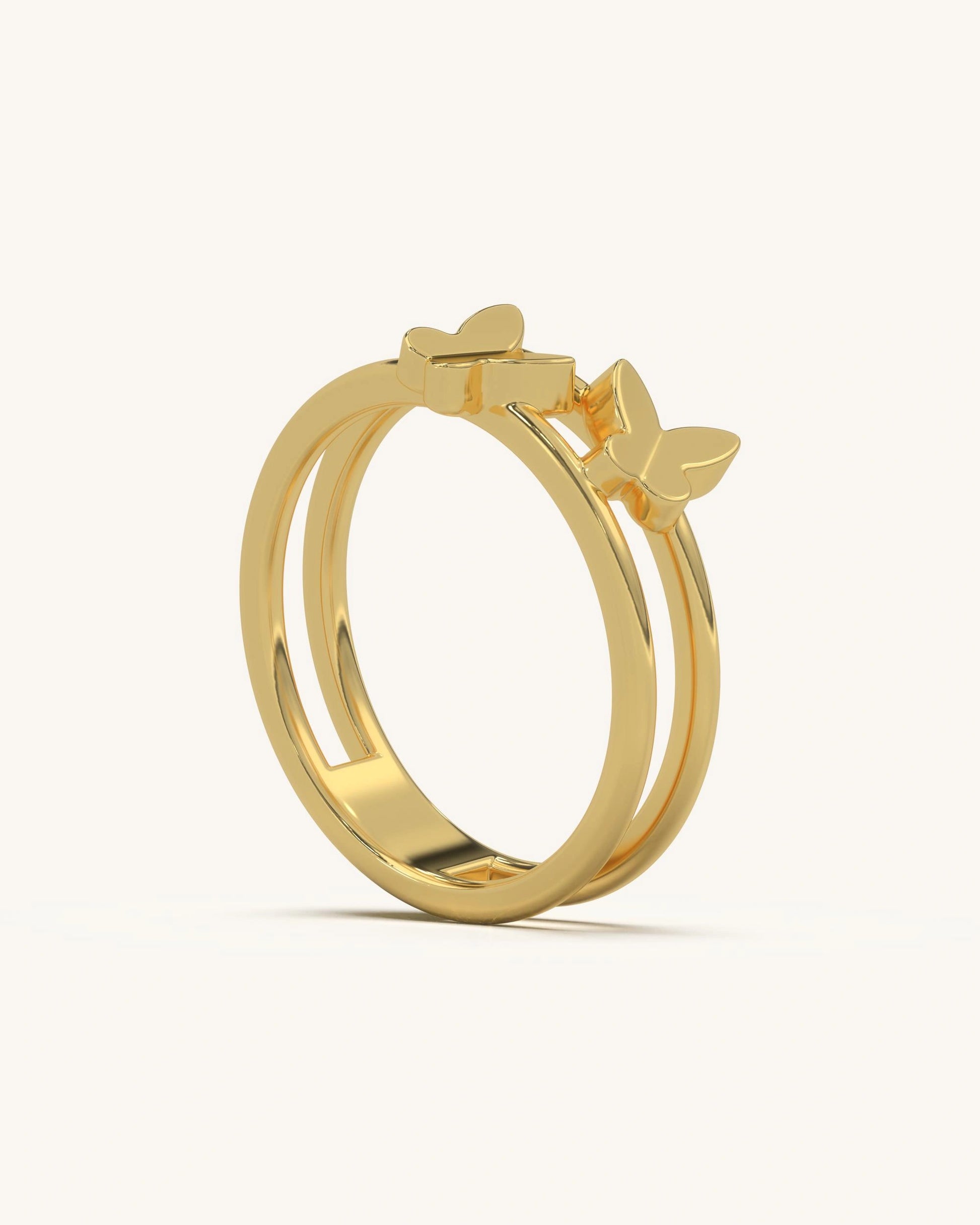 This contemporary ring presents two polished gold bands each accented with a sleek and solid butterfly, creating a modern layered effect full of charm.