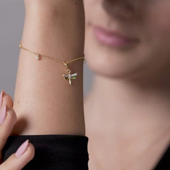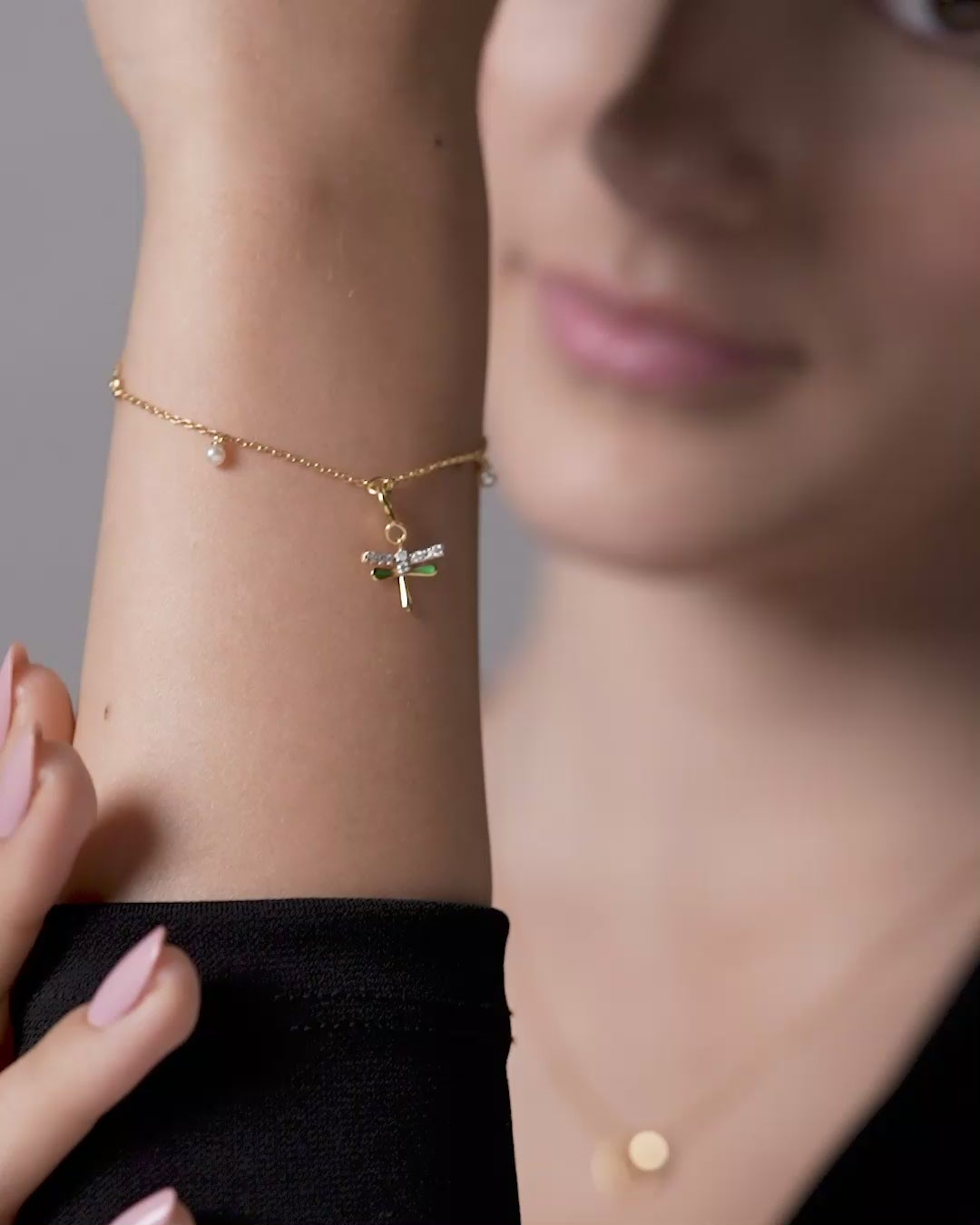 A sleek dragonfly design brought to life with diamond-studded wings and green enamel inlays, symbolizing freedom and movement.