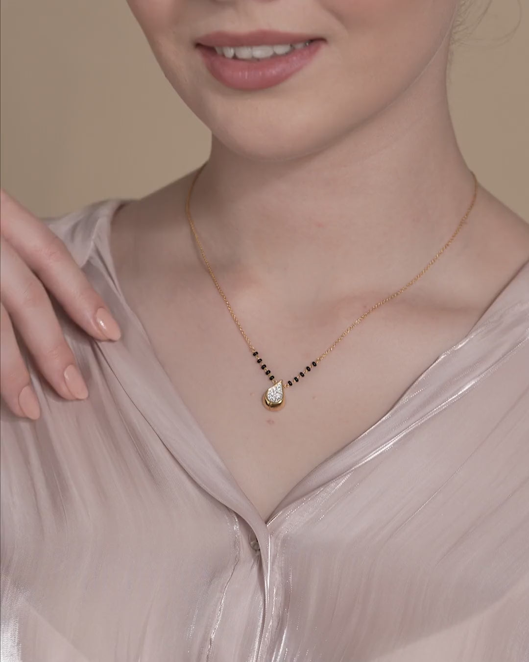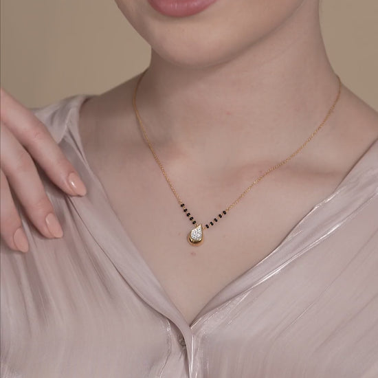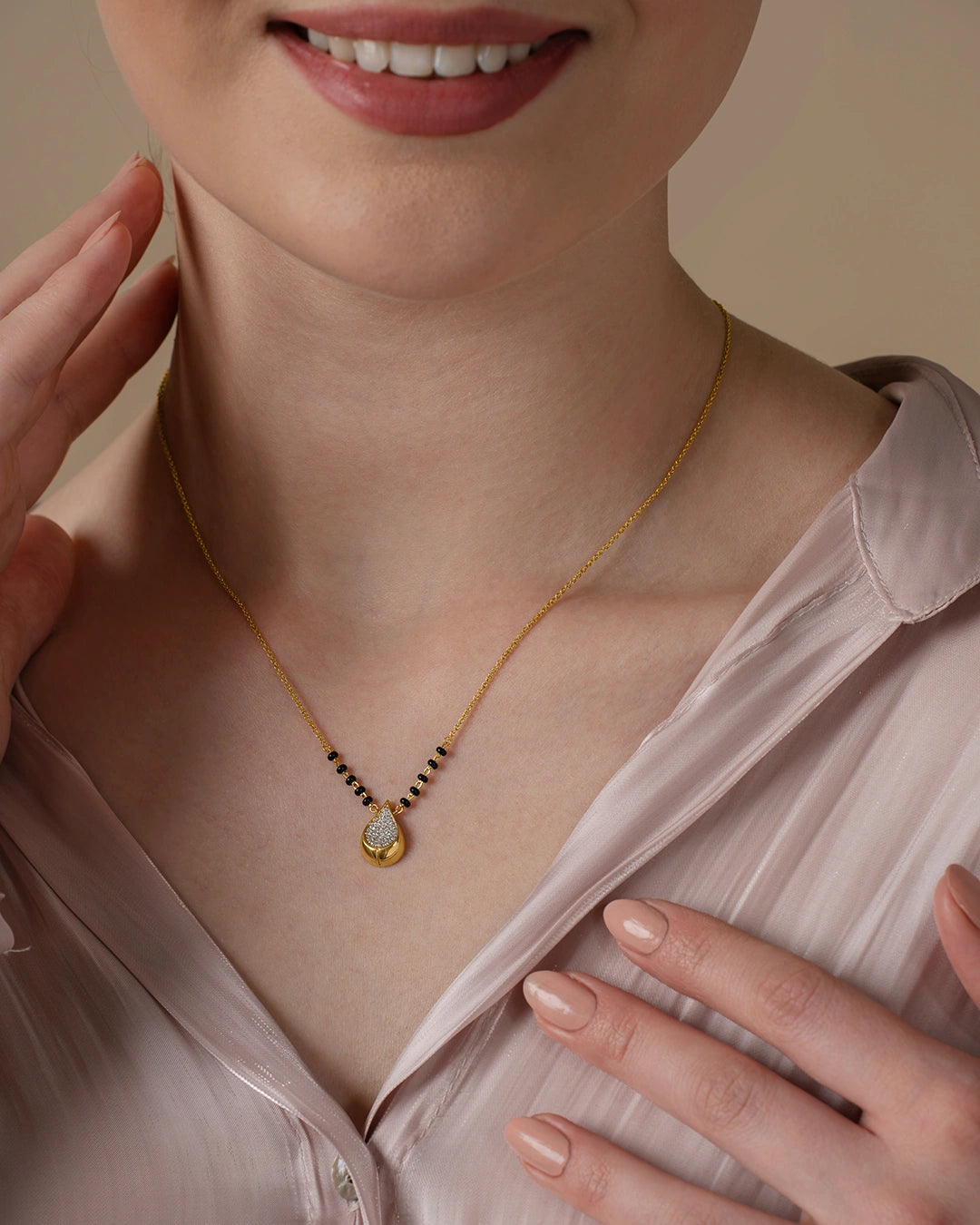 A small teardrop pendant beautifully blending gold and moissanite-set white, suspended from a traditional mangalsutra-style black bead chain.