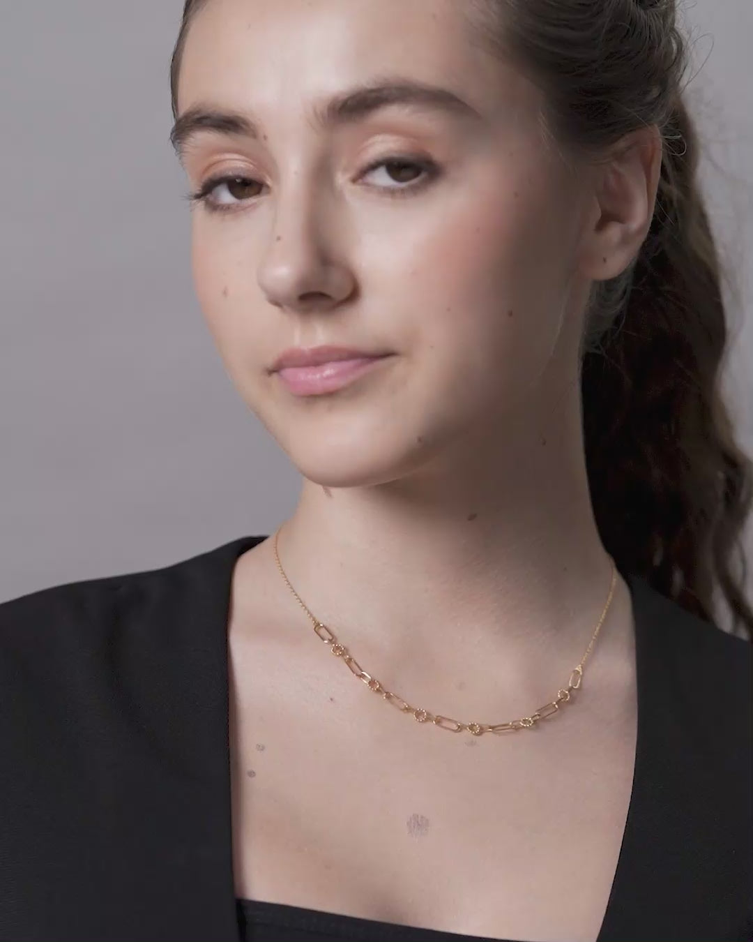 A stylish combination of circular and elongated open links arranged symmetrically across the front. The modern layout adds a sleek element to any outfit.