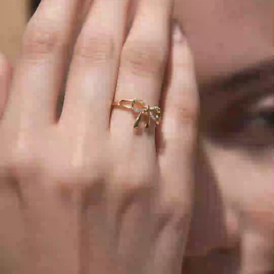 This charming ring features a dainty bow with moissanite-studded loops and a gold-tone ribbon drop. Its feminine style makes it a perfect everyday luxury.