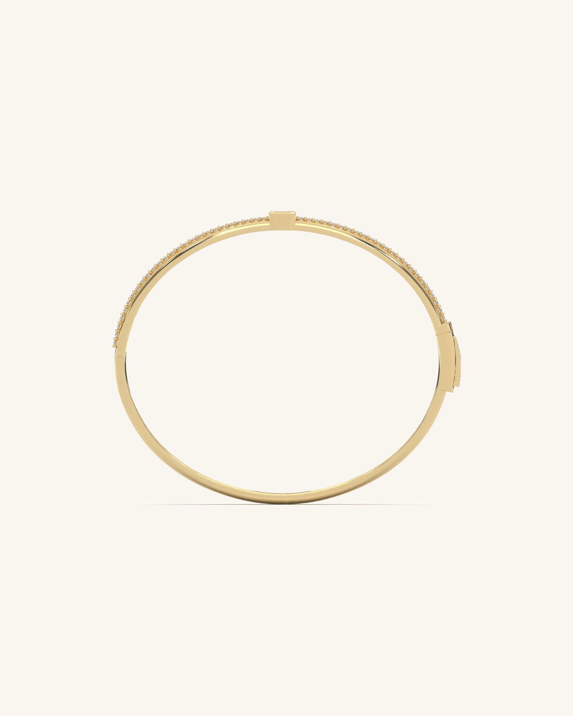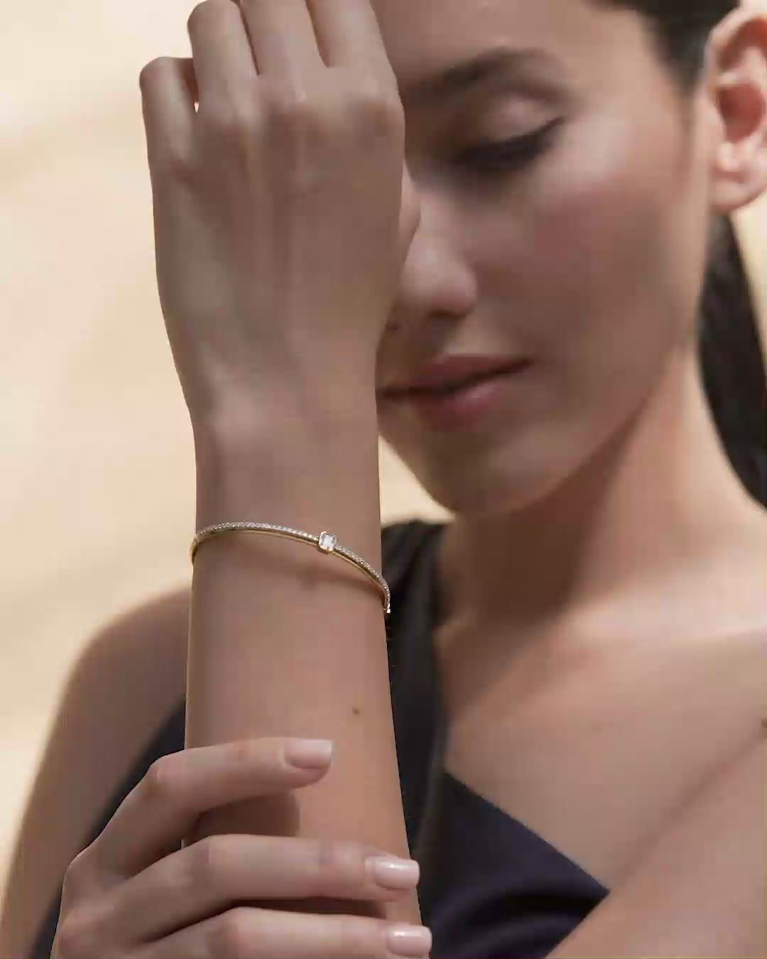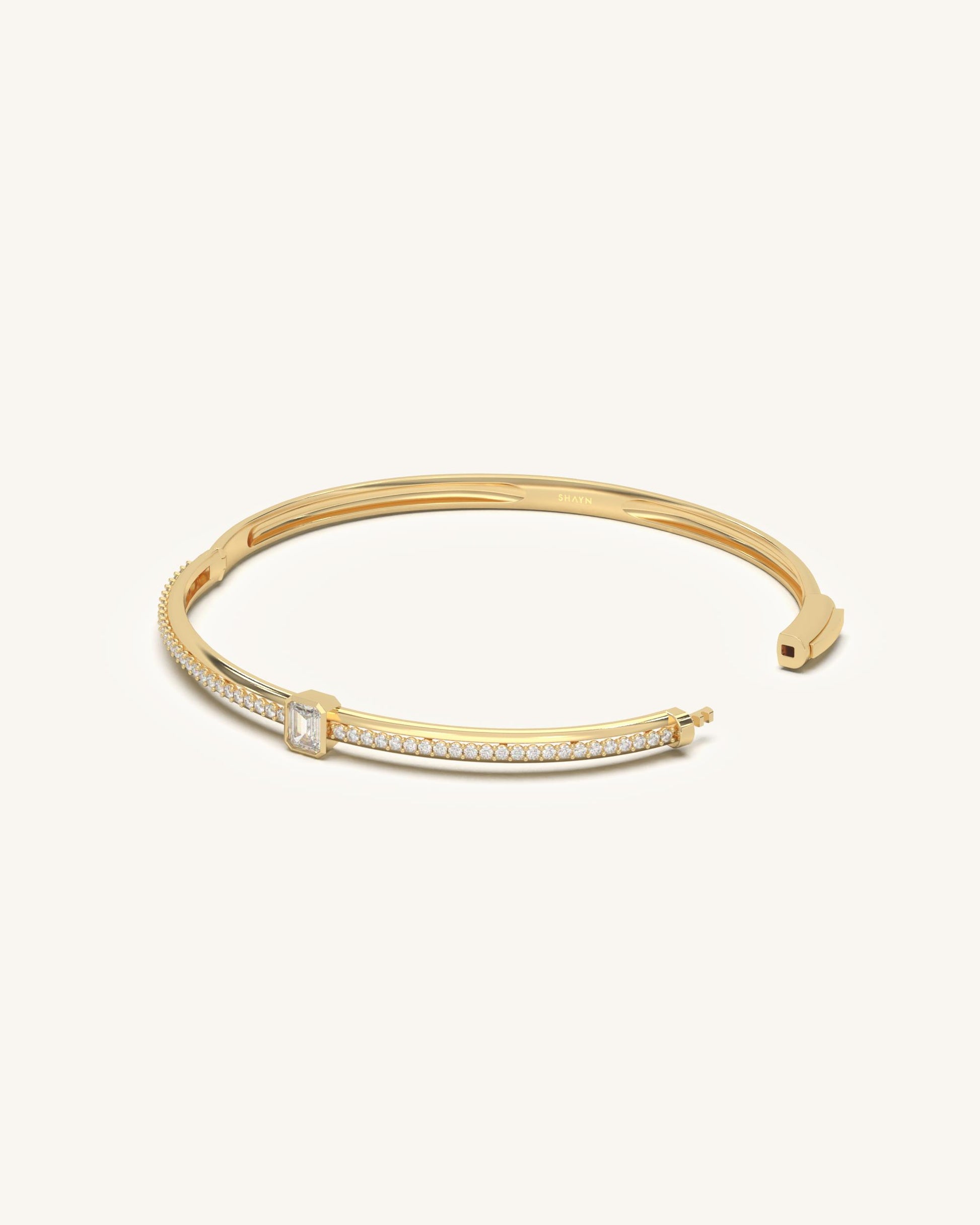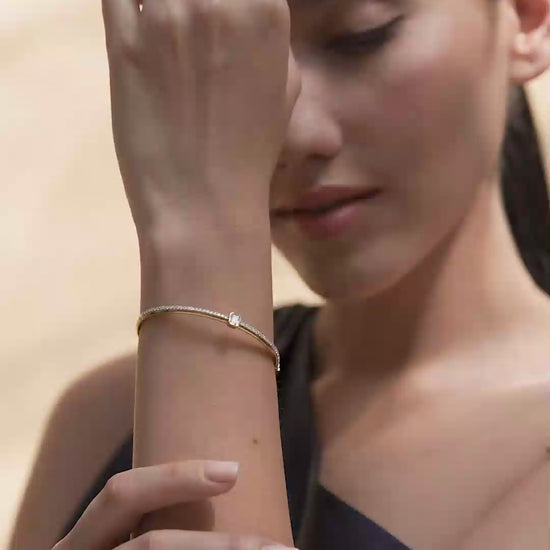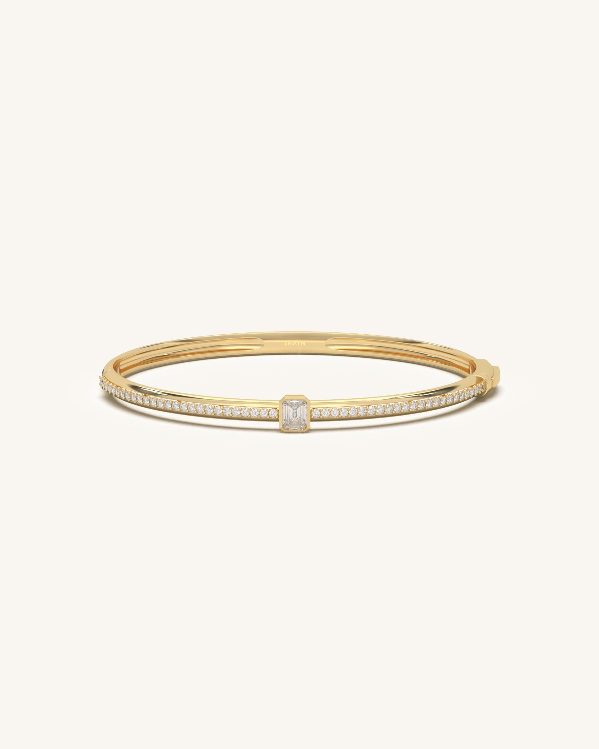 A delicate bracelet featuring a fine moissanite pavé line paired with a prominent emerald-cut moissanite centerpiece for a bold yet balanced design.