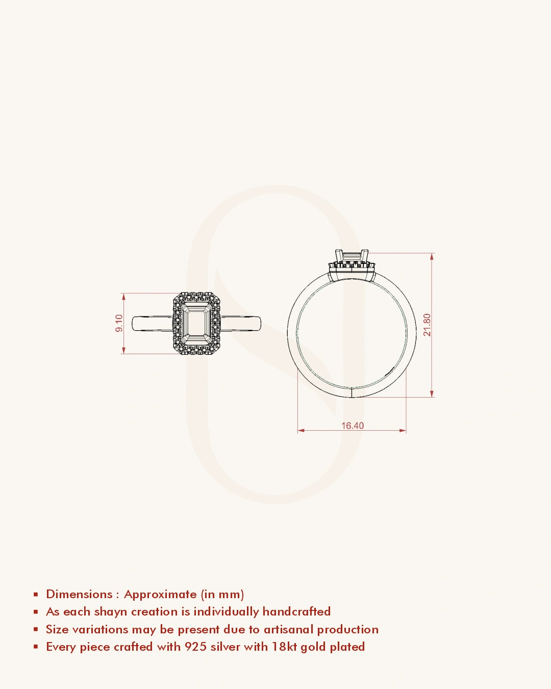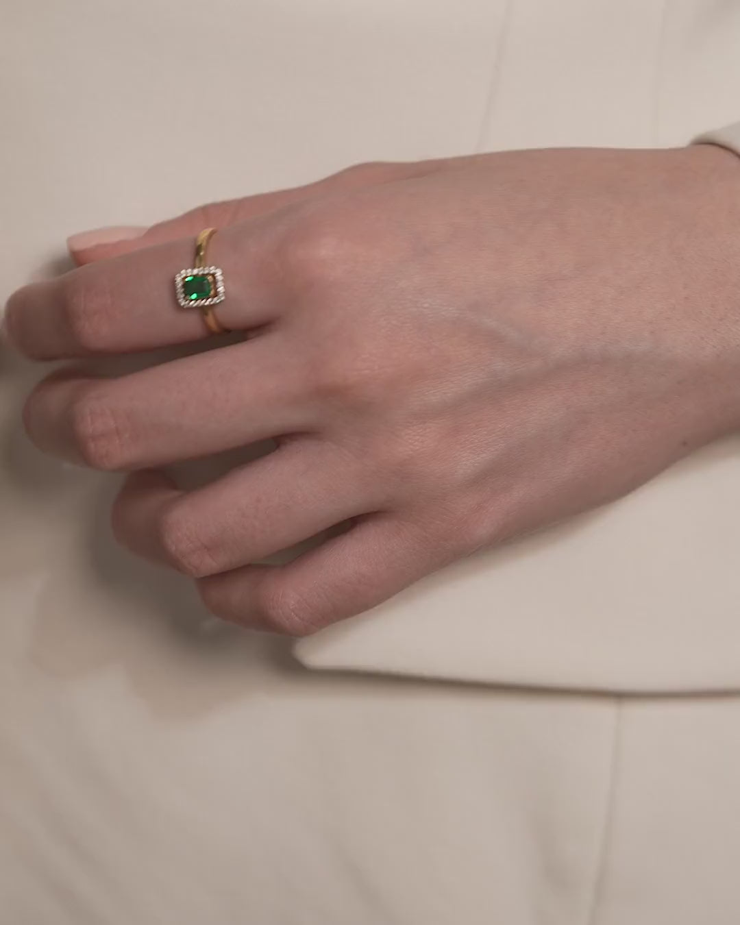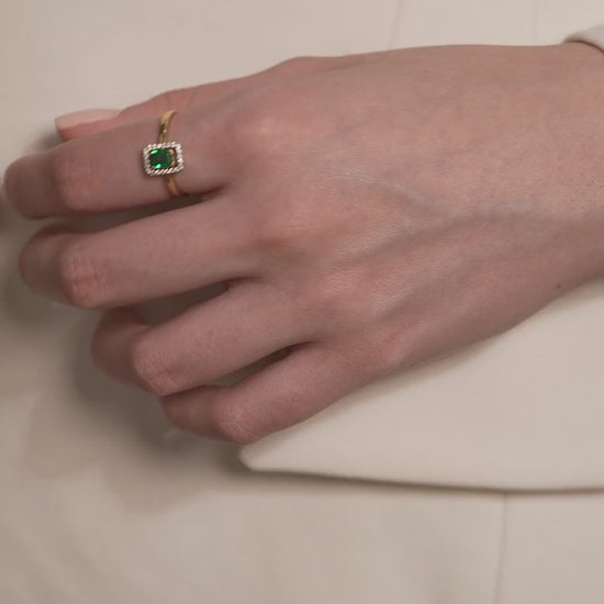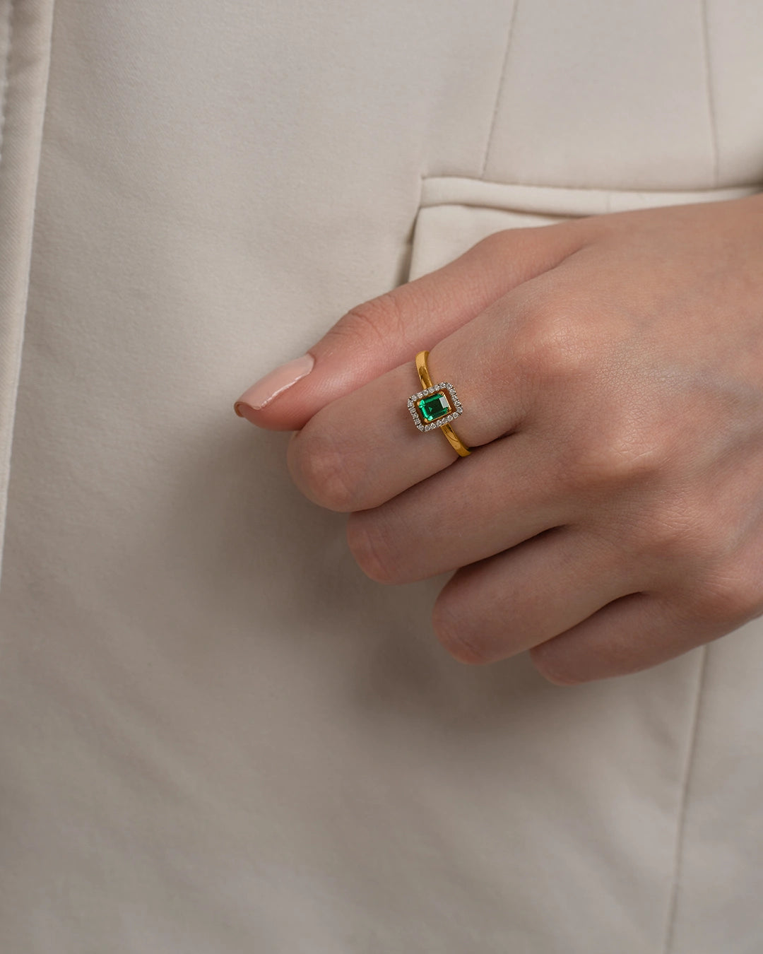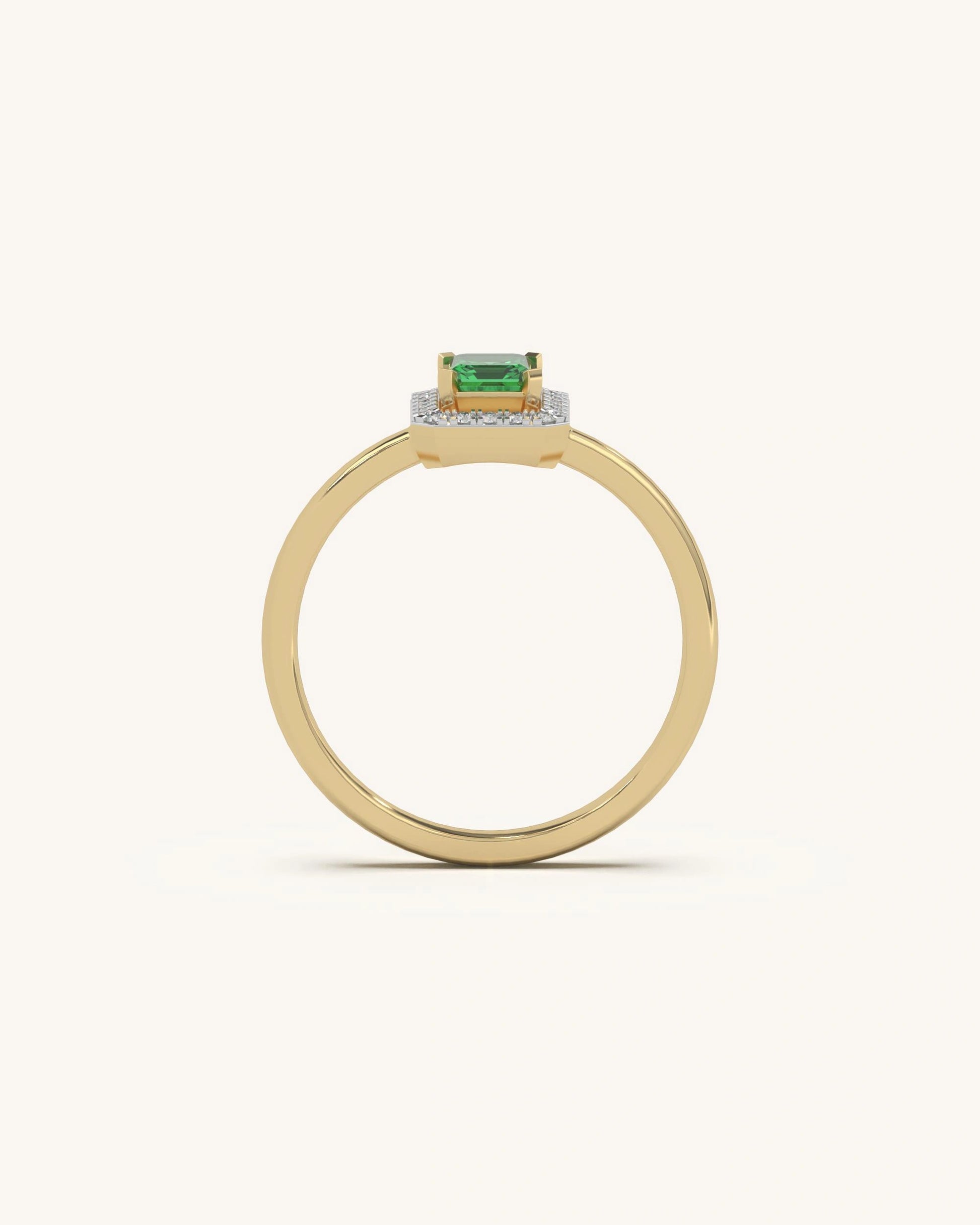 A rectangular emerald green center stone is framed with a sparkling halo of moissanite. The thin gold-tone band enhances its Timeless elegance, ideal for those who love refined luxury.