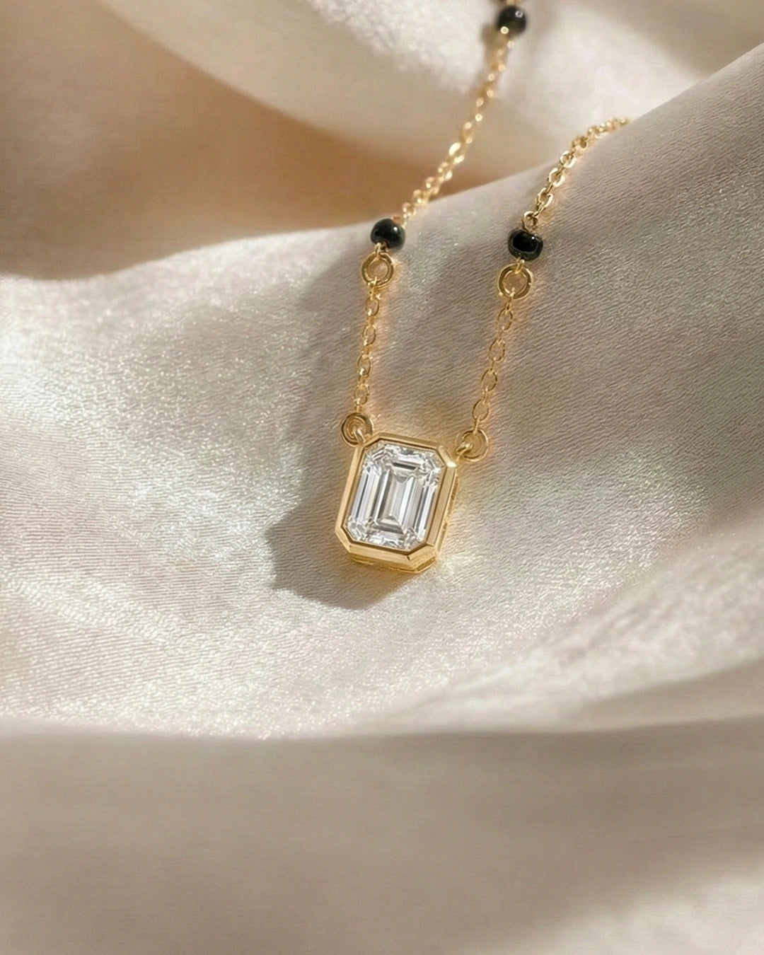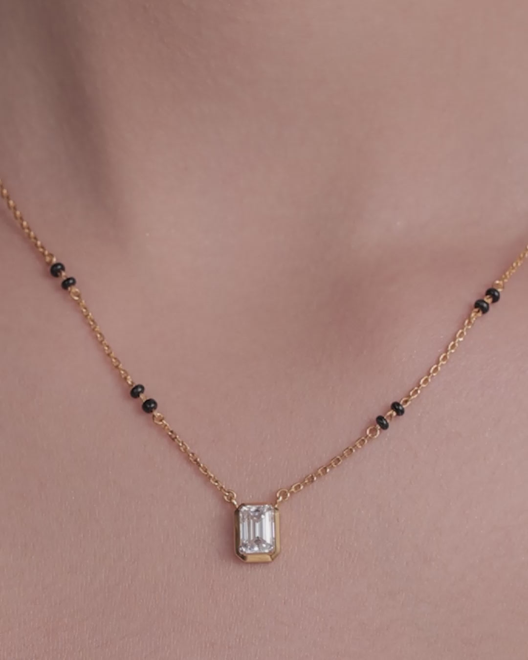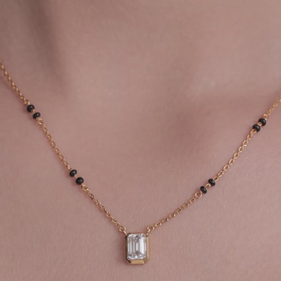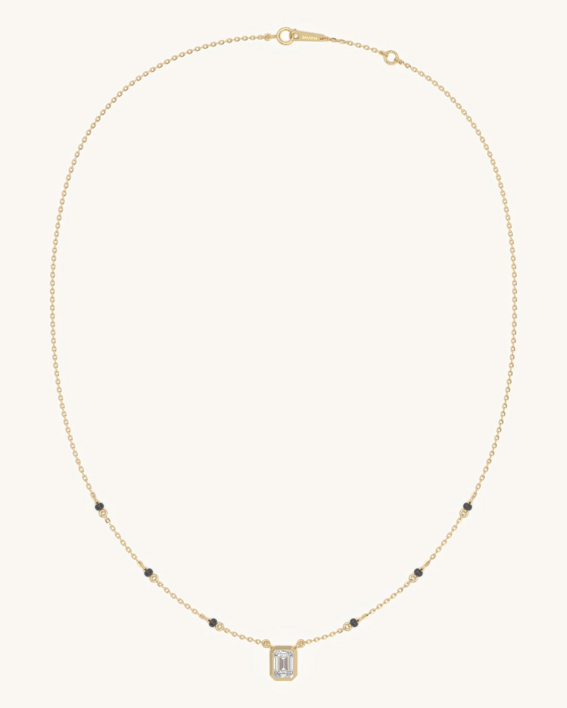Strong and elegant, this pendant highlights the clean lines of an emerald-cut Moissanite. The bevelled gold setting mirrors the Moissanite's step cuts, creating a powerful, vintage-inspired look with a high-end finish.