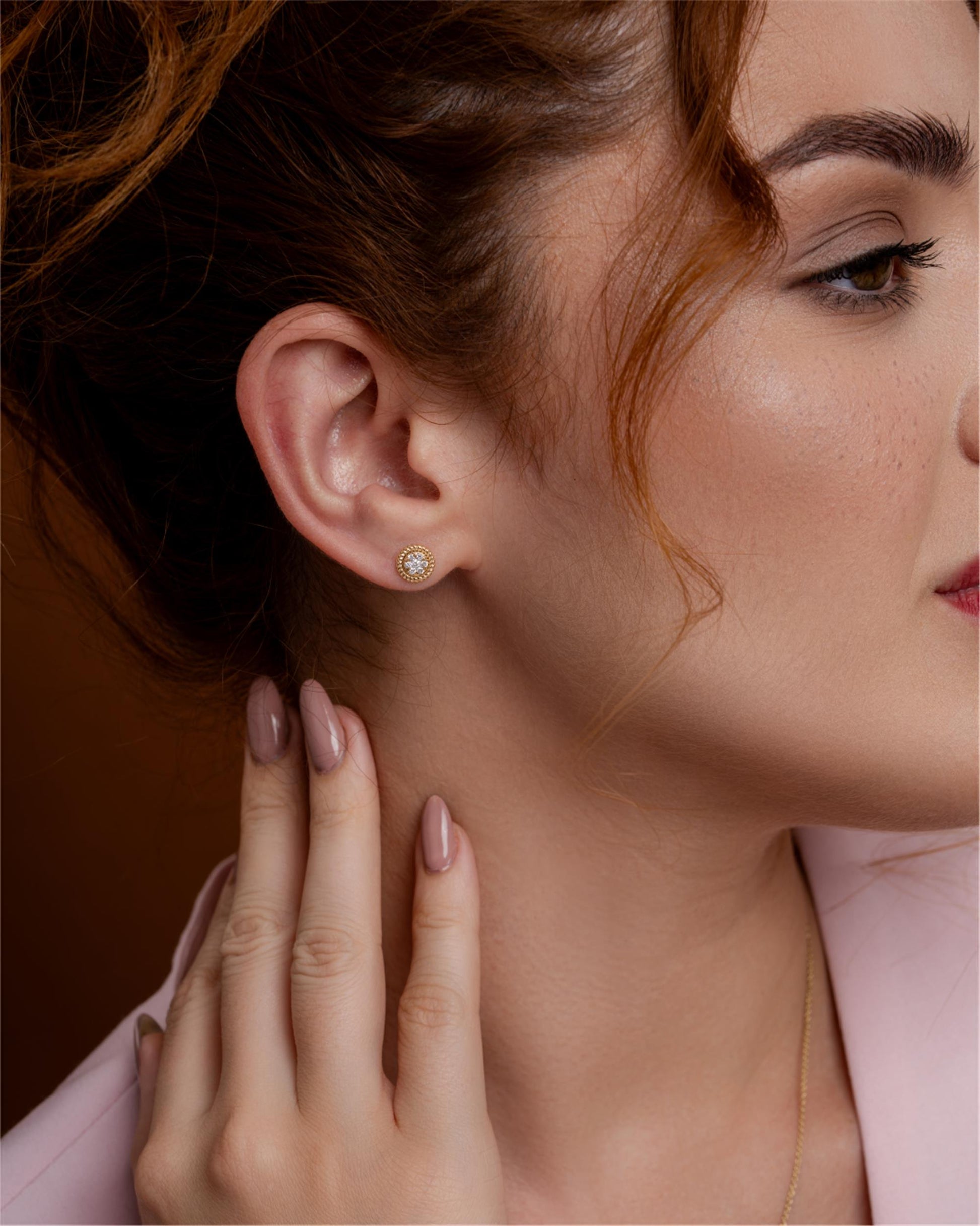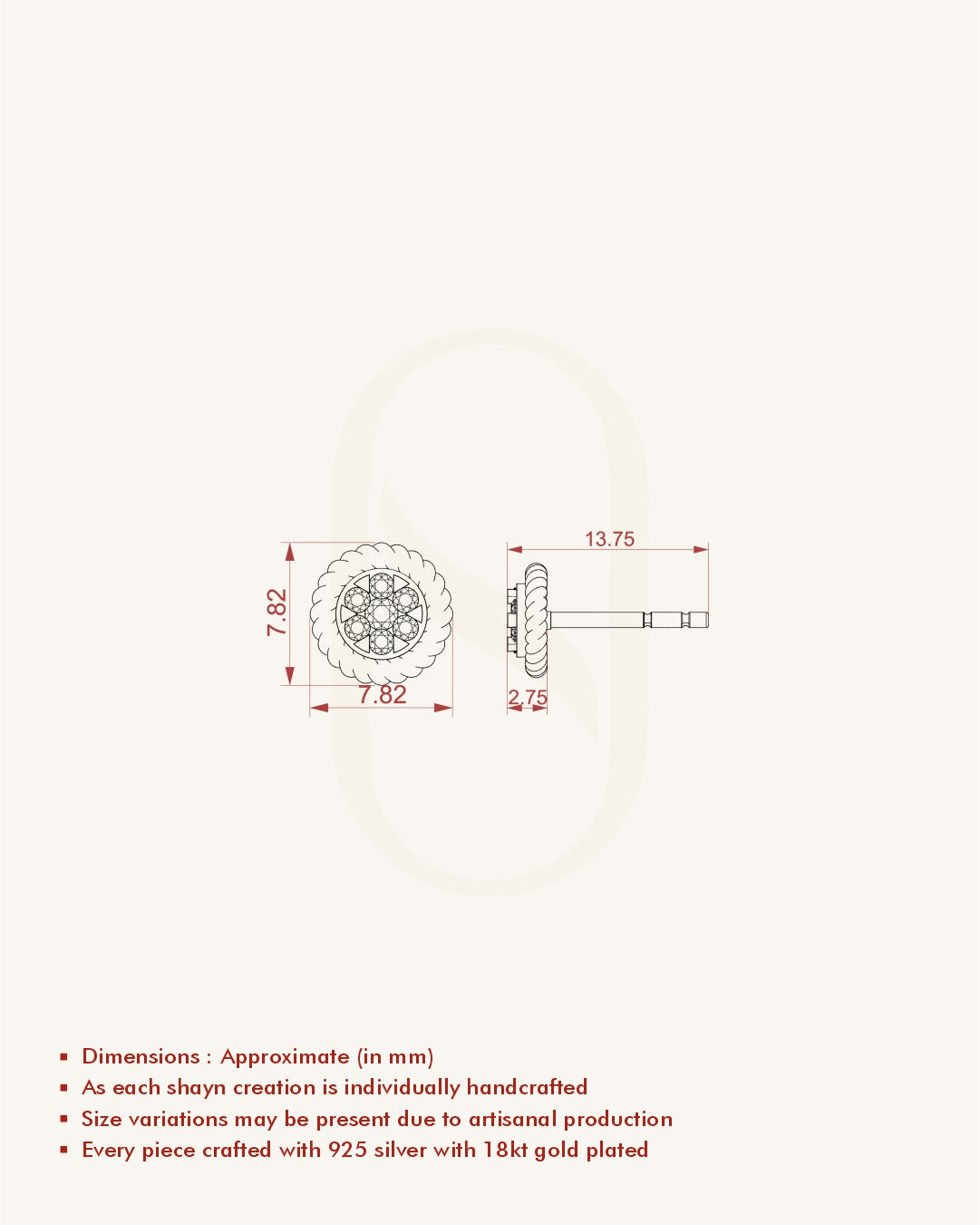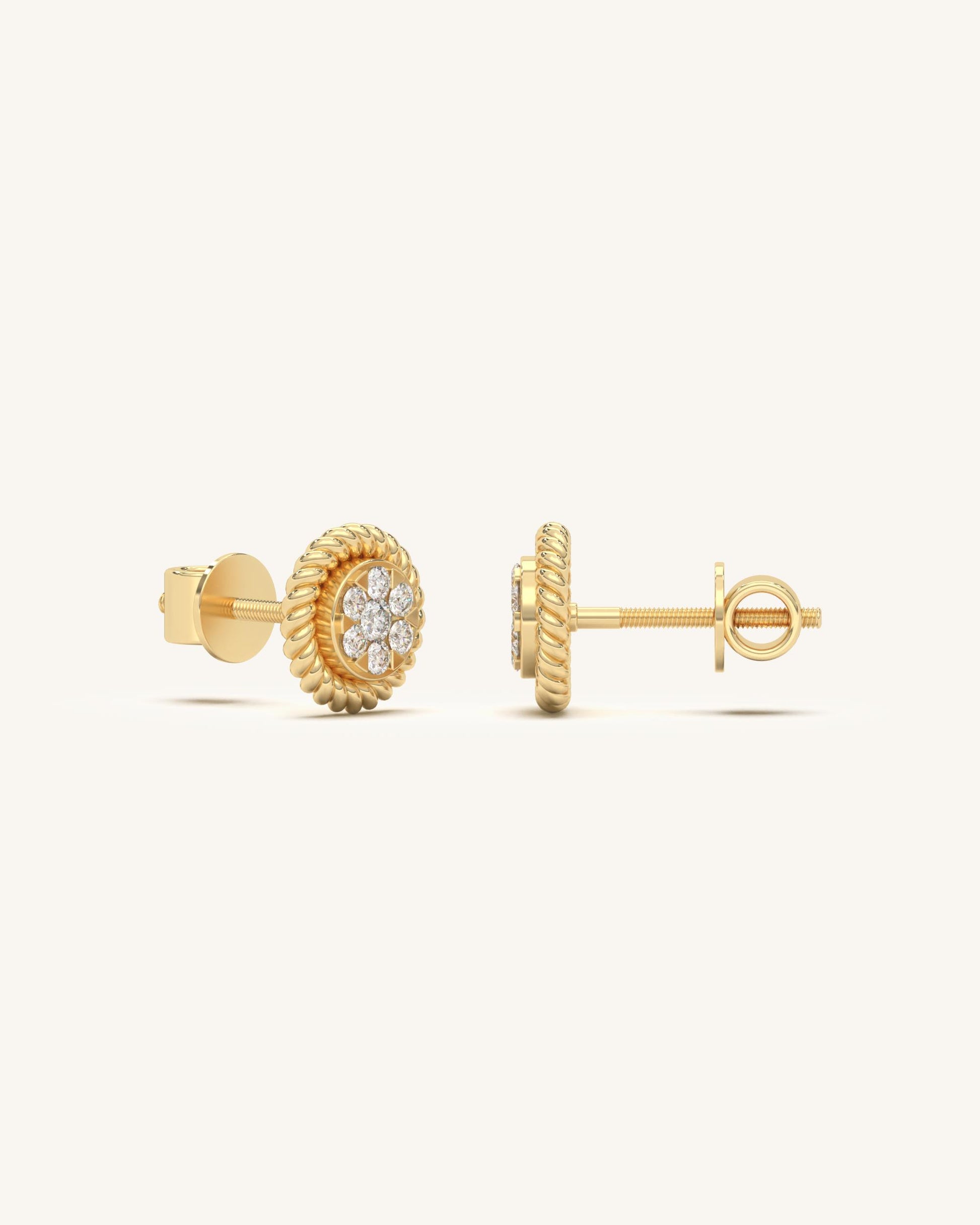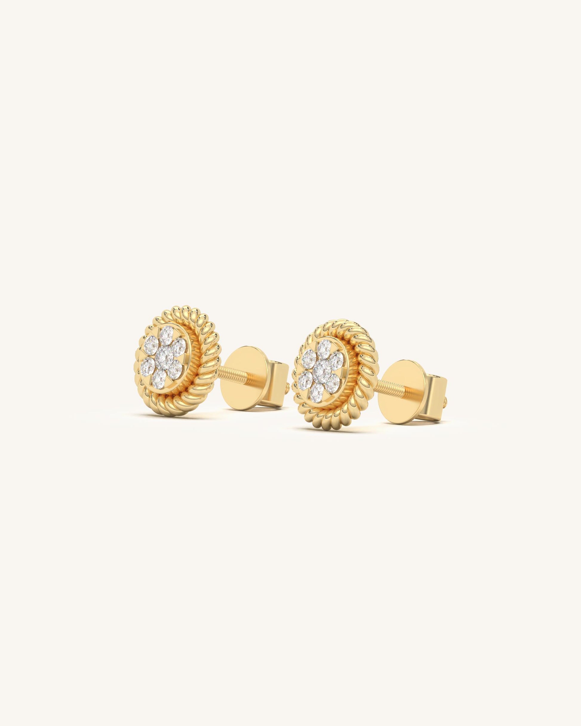 Stud earrings featuring circular floral stone clusters framed with a twisted rope border. A refined design that brings vintage inspiration with modern elegance.