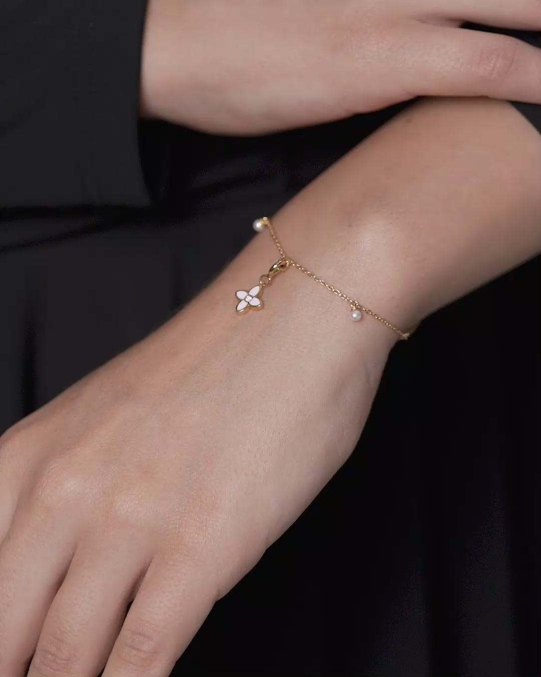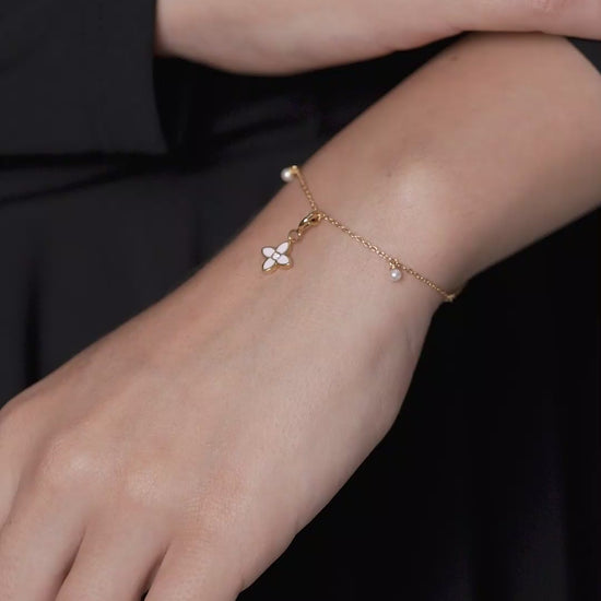 This four-petal floral charm is designed with soft pink enamel and a centered sparkling stone for a fresh, delicate look.
