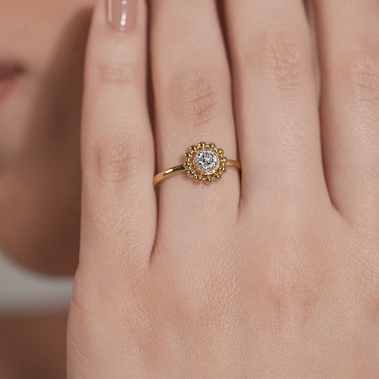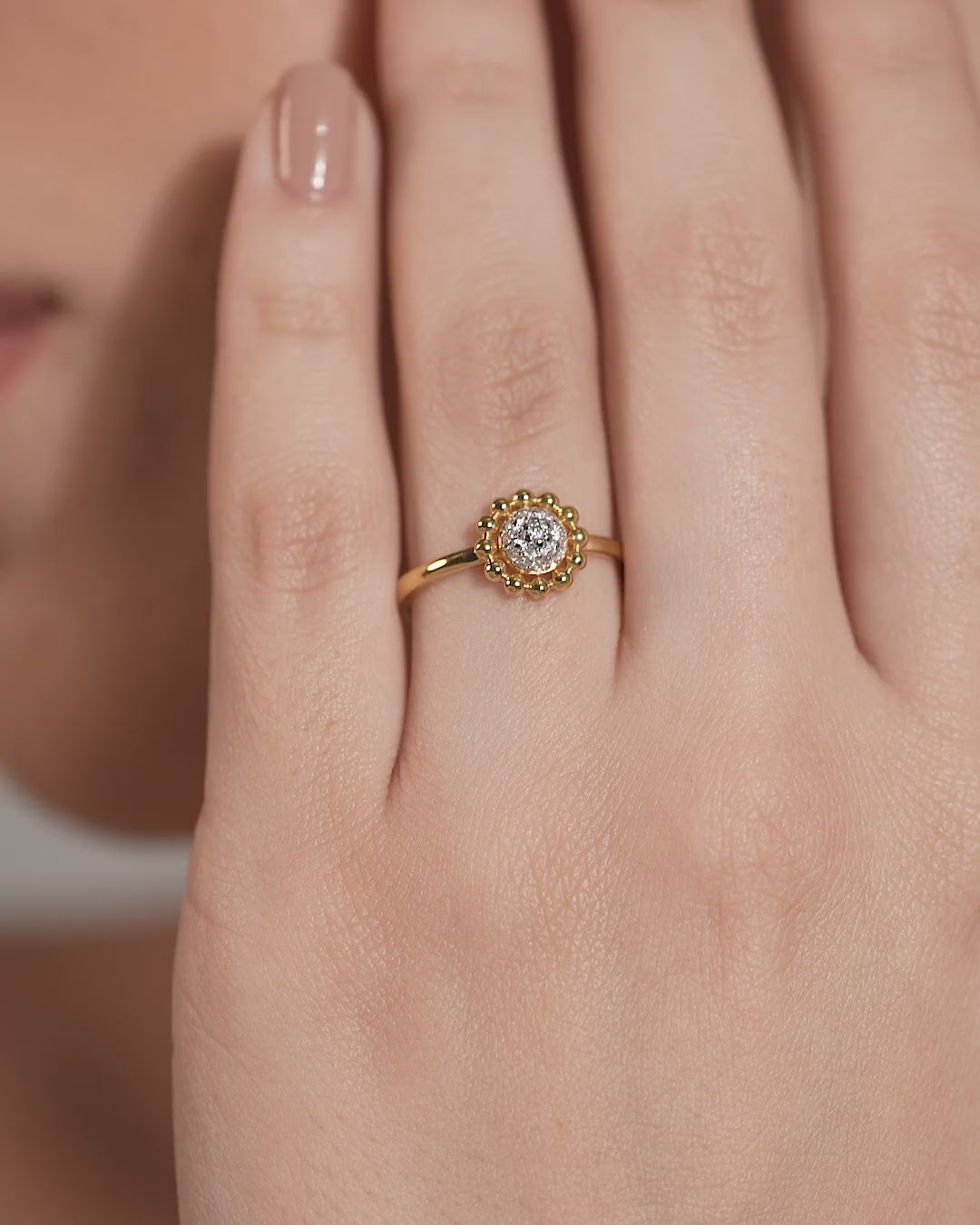 The ring presents a floral-inspired pattern made of tiny gold beads forming a perfect round bloom shape. Its flat surface offers a modern look.