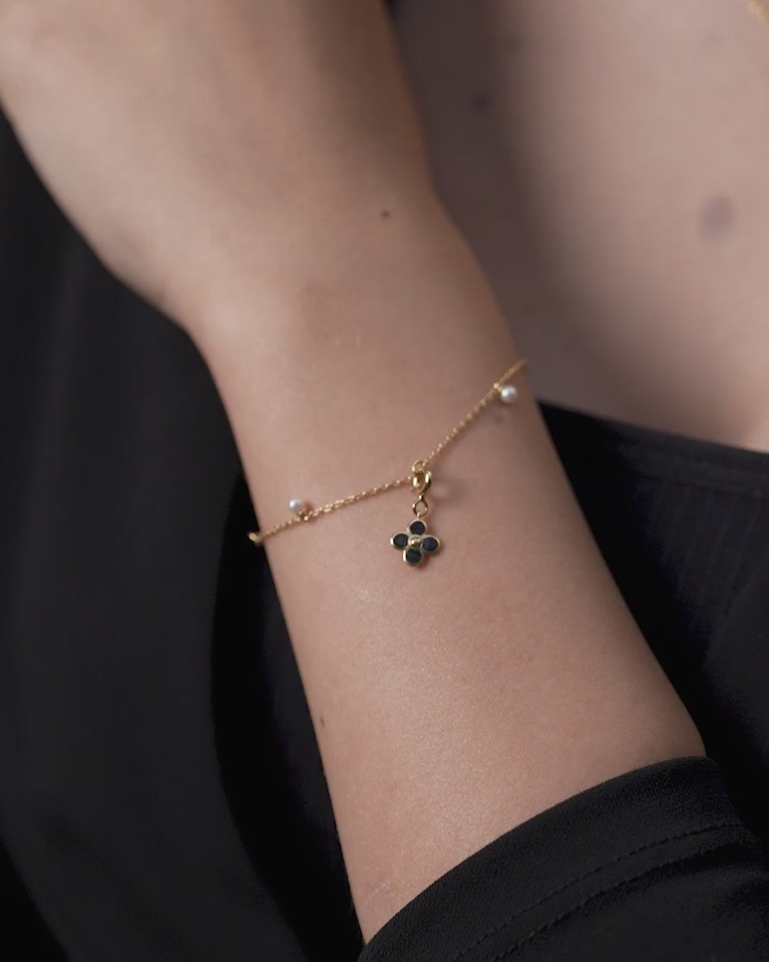 A four-petal clover pendant with a glossy black enamel finish and polished gold borders.