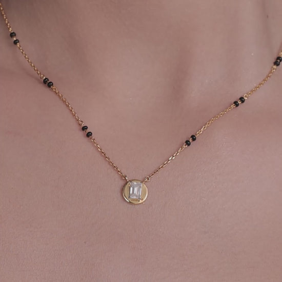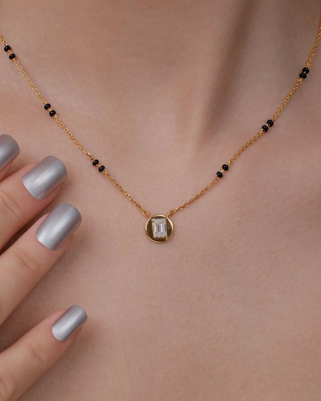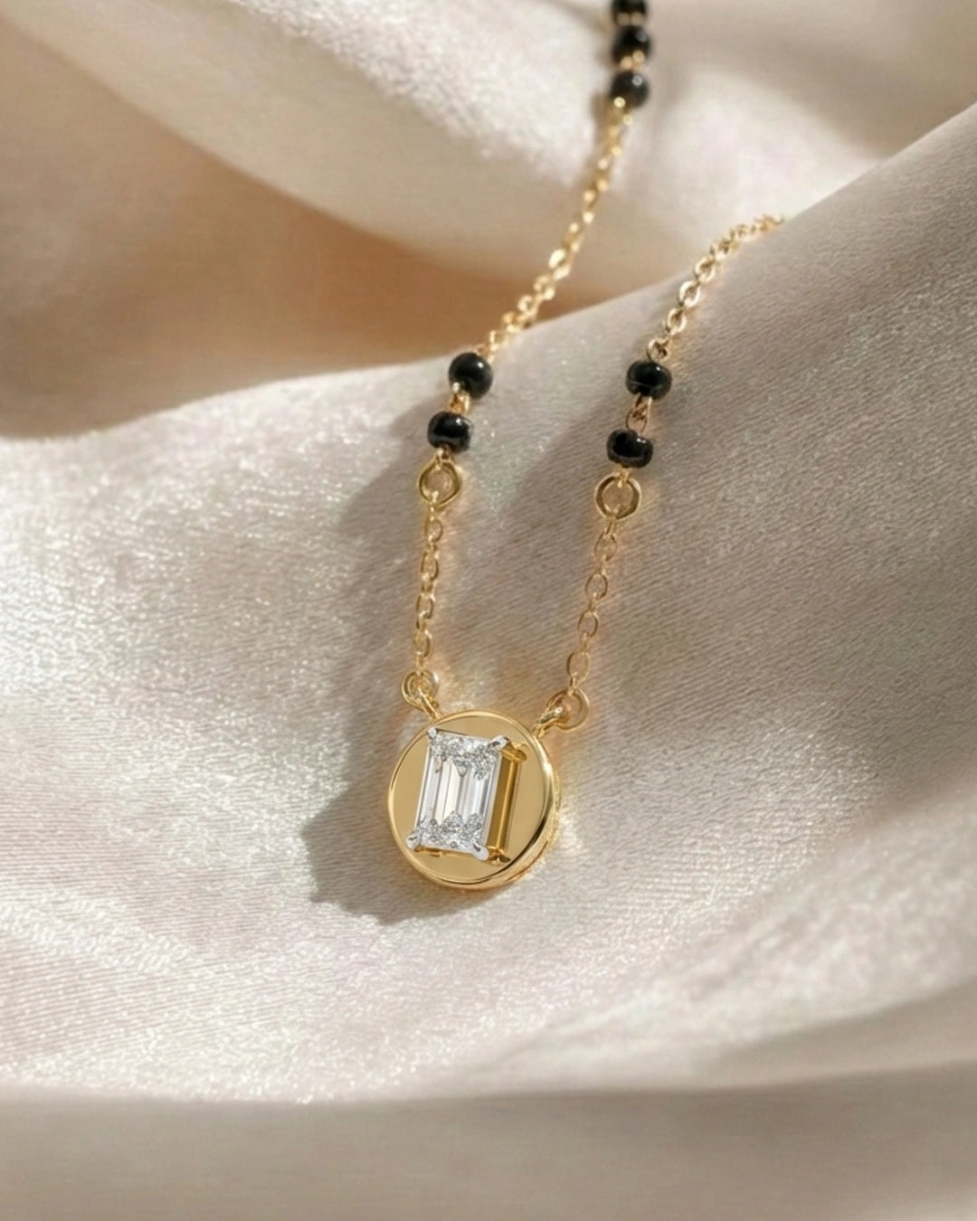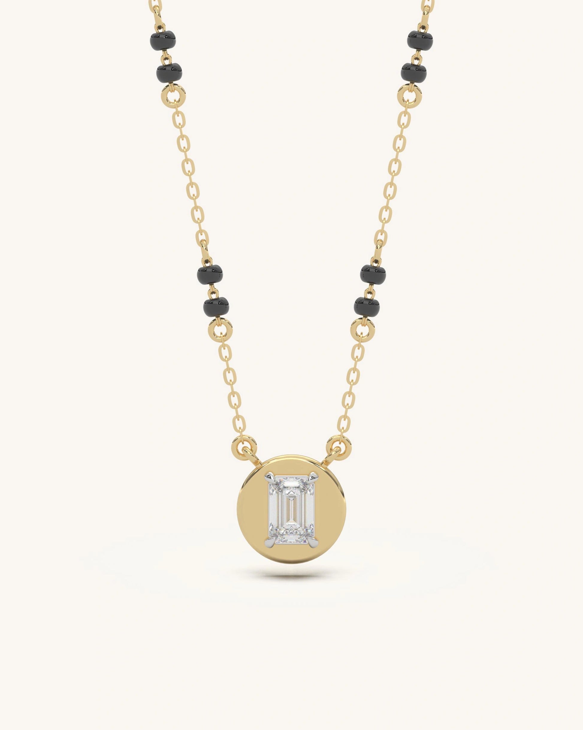 A unique fusion of shapes. A rectangular emerald cut is set centrally on a round, high-polish gold disc. The contrast between the linear Moissanite and the circular gold backdrop creates a striking, modern silhouette.
