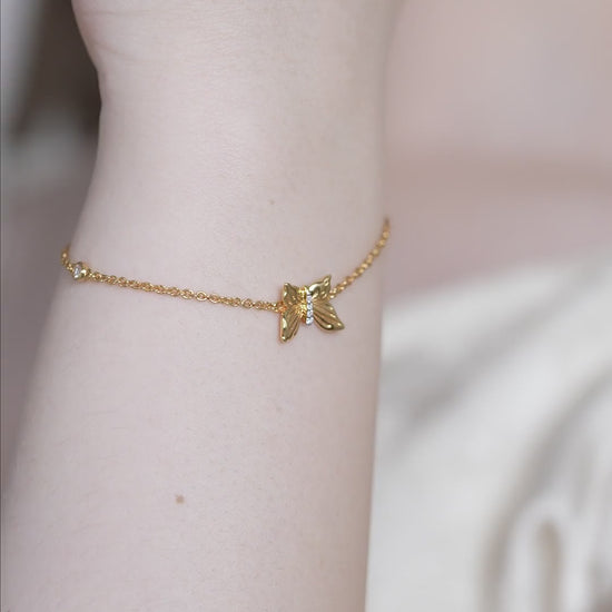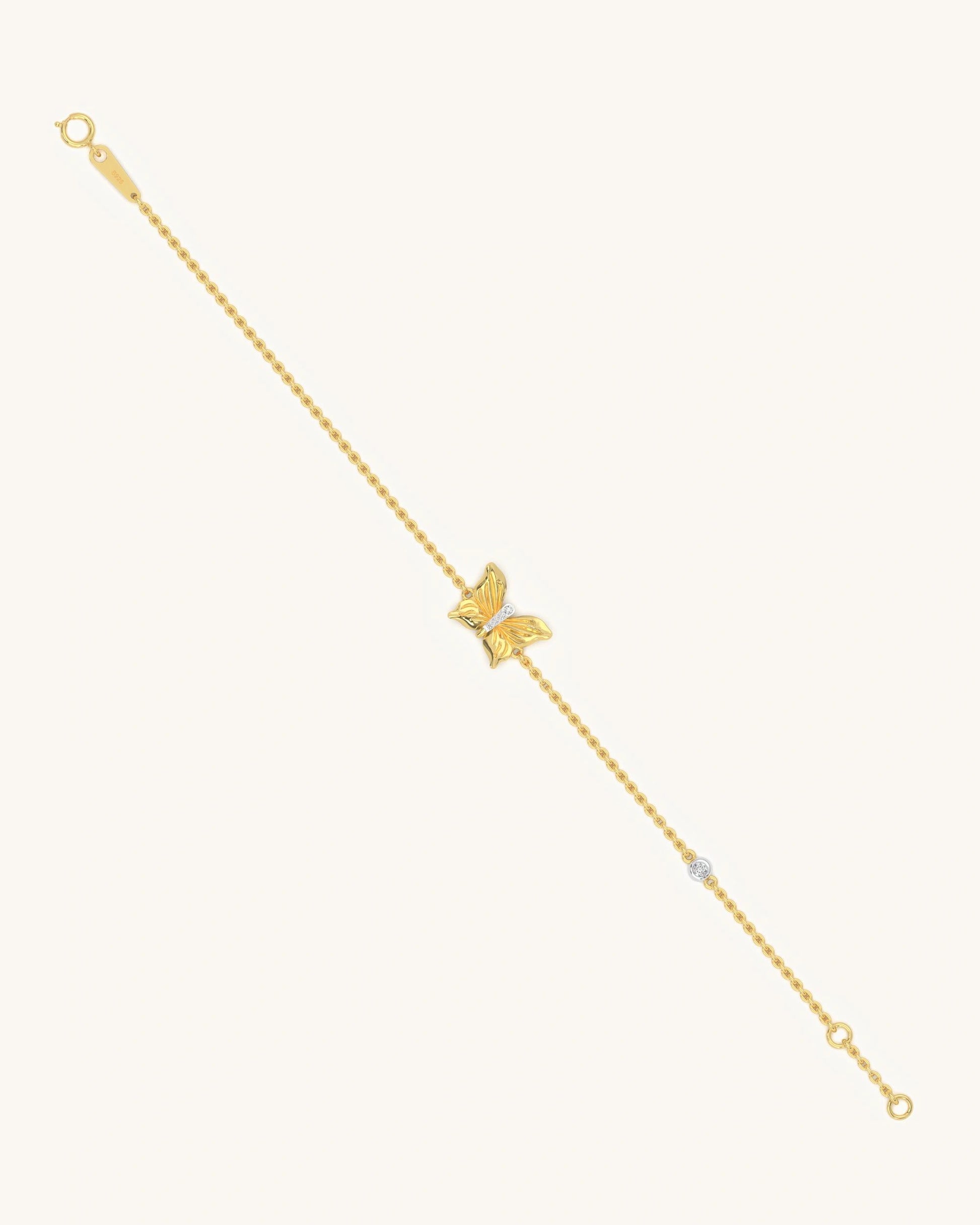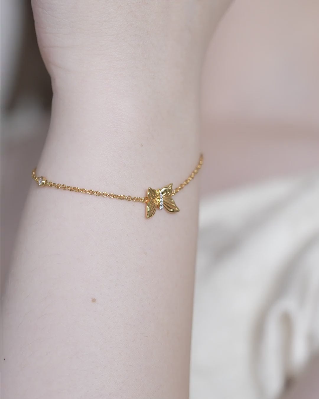 Crafted in hallmarked 925 silver and finished with radiant gold plating, the butterfly is accented with Moissanite diamonds to bring luxurious brilliance to your wrist.
