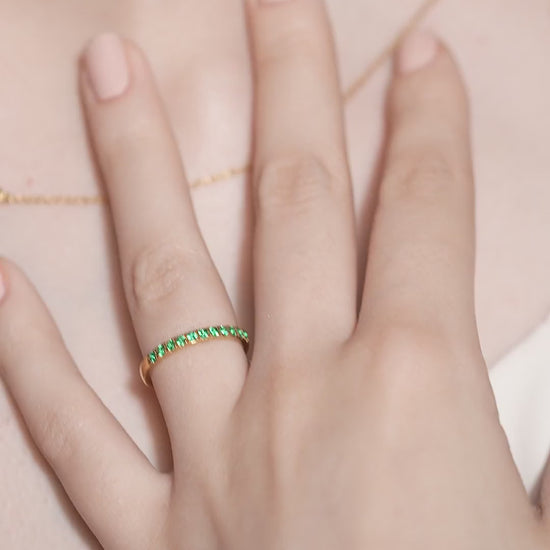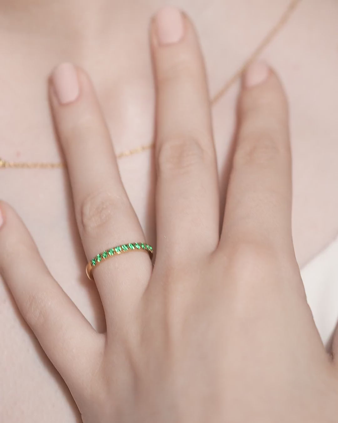 Crafted in925 Sterling Silver 18KT Gold Vermeil with moissanite green stones and finished in gold tone. Perfect for stacking or wearing solo.