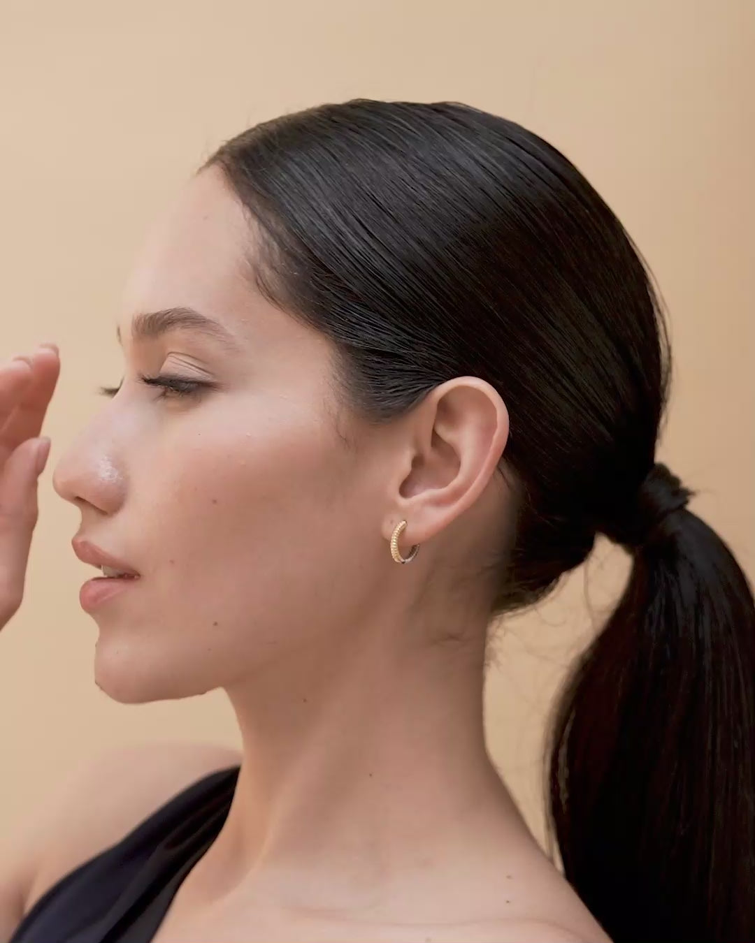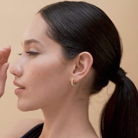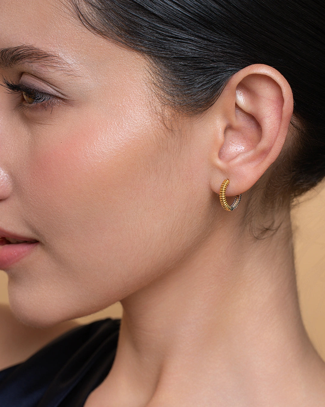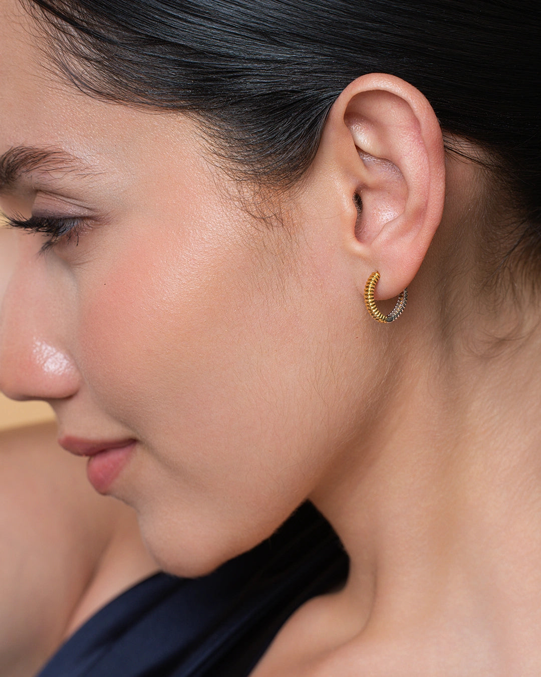 These hoops are designed with a rippled texture that alternates between silver and gold, evoking motion and modernity.