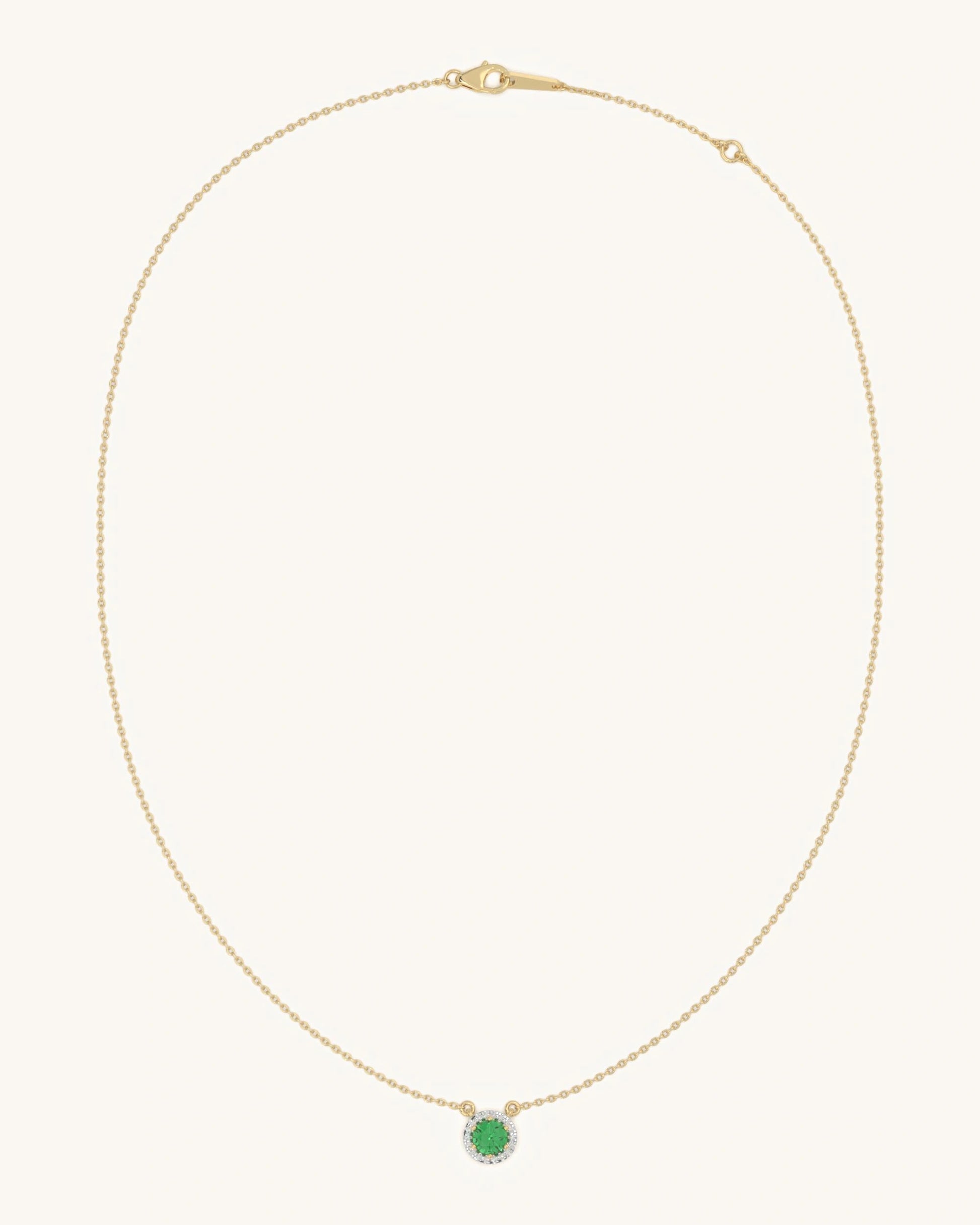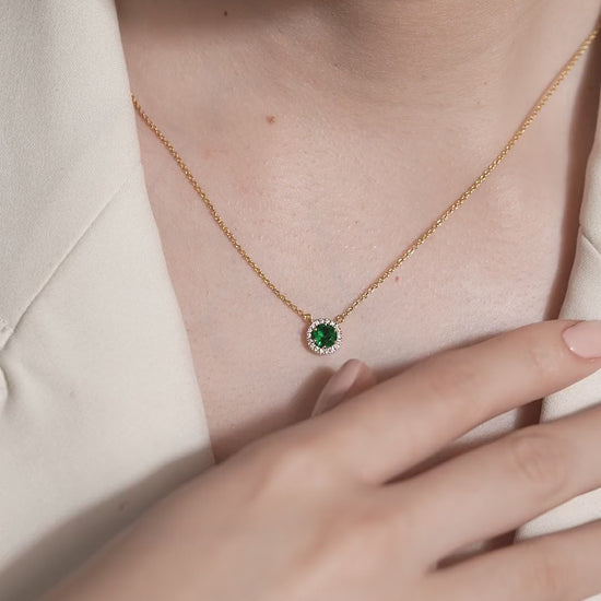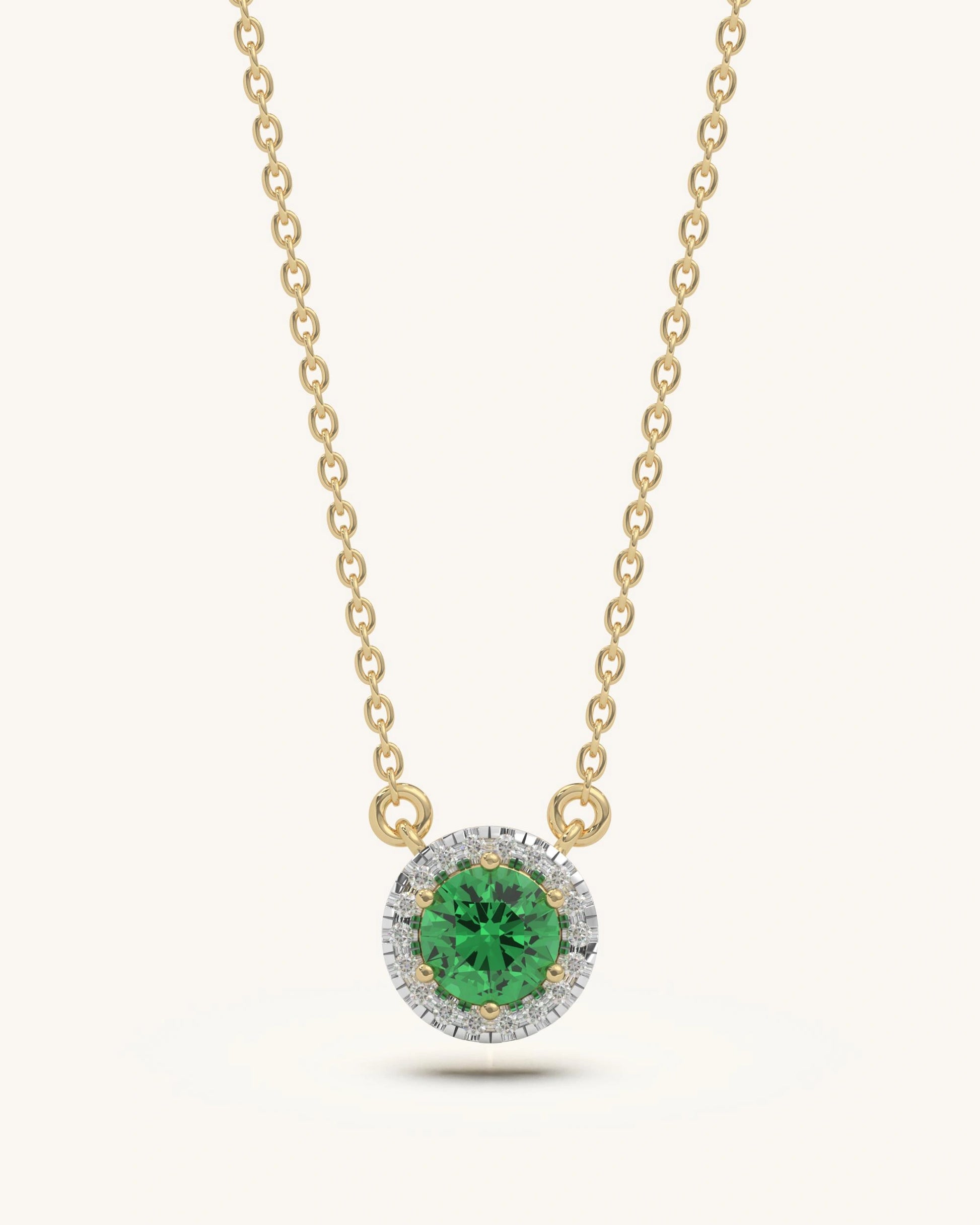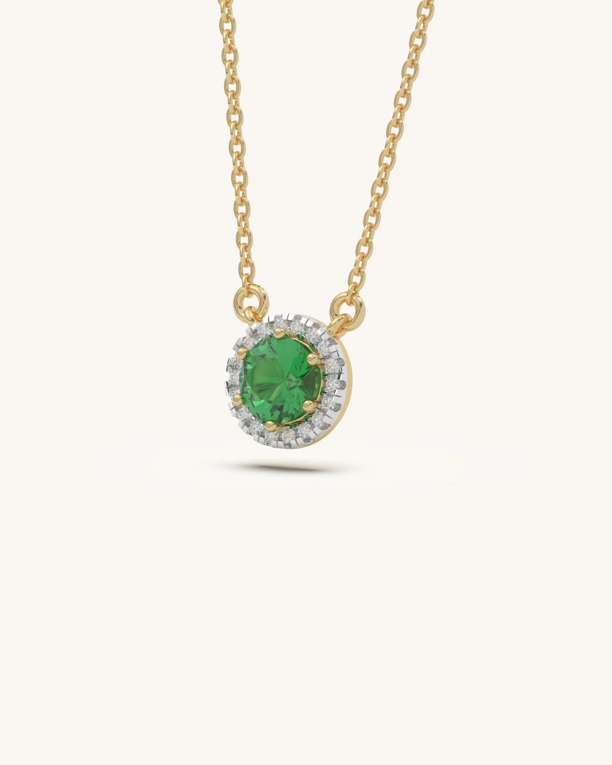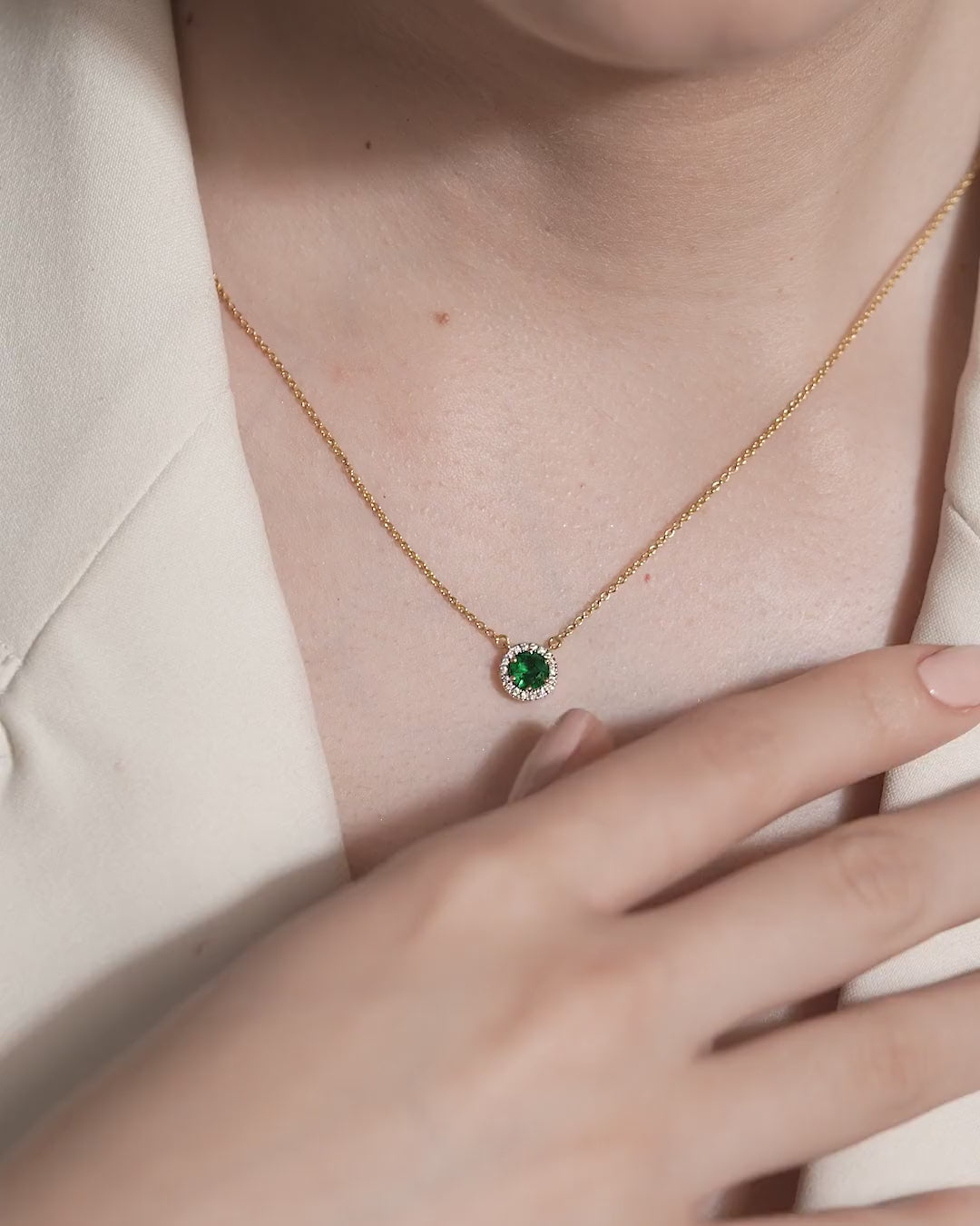 Made in 925 silver with moissanite halo and central green stone. Finished in polished gold tone.