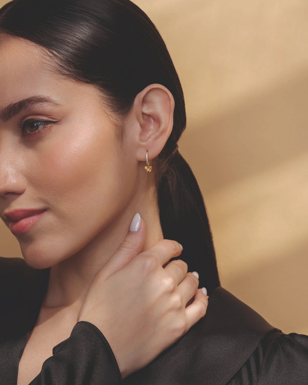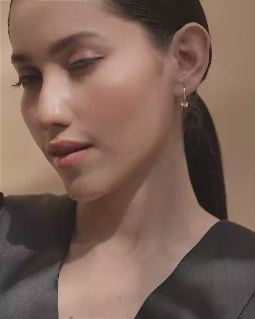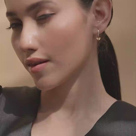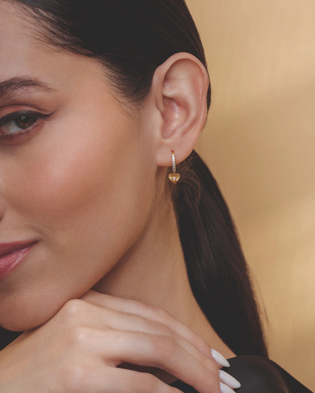Sparkling diamond hoops paired with textured heart drops for a flirty chic vibe. Lightweight and perfect for day-to-night styling