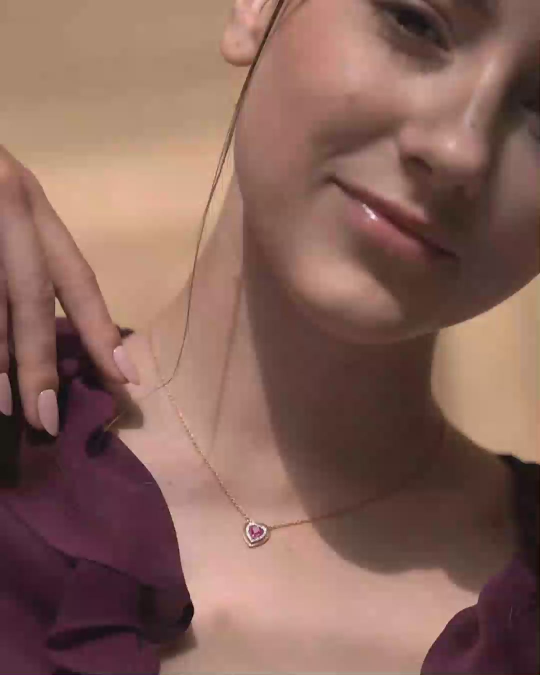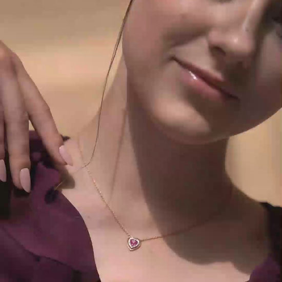 A heart-shaped pink stone lies at the center of this pendant, surrounded by double rows of glistening white 925 Sterling Silver With 18KT Gold Vermeil