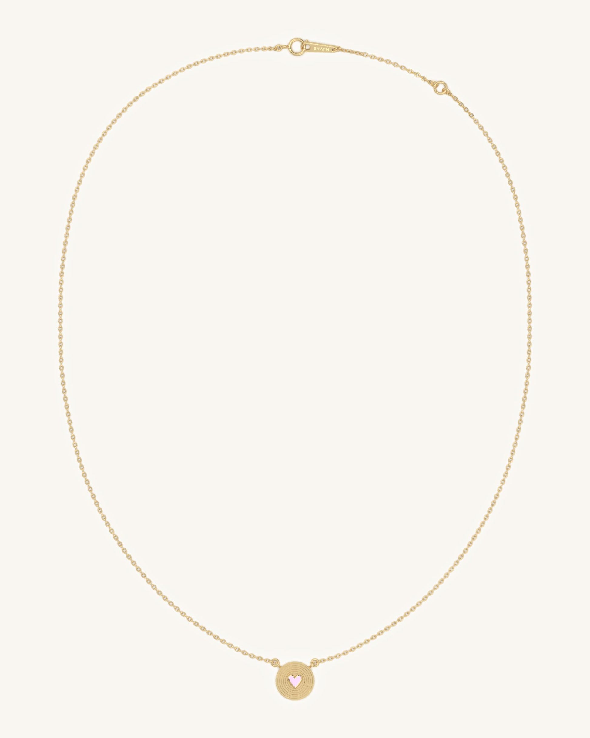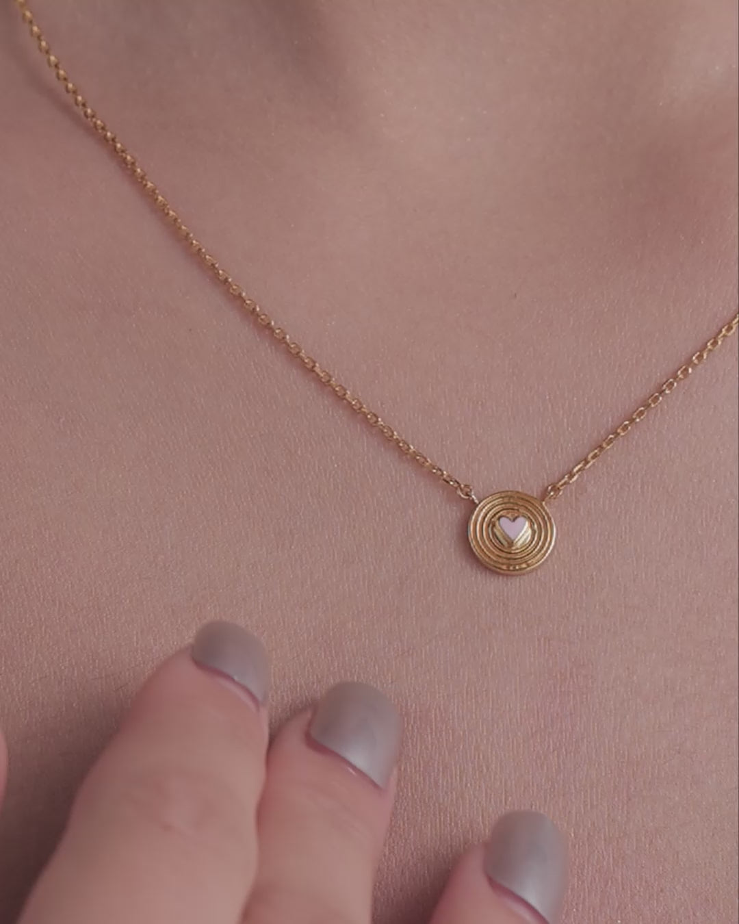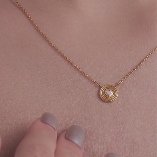 A circular pendant with concentric grooves and a soft heart accent at the center. Minimal yet expressive in design.