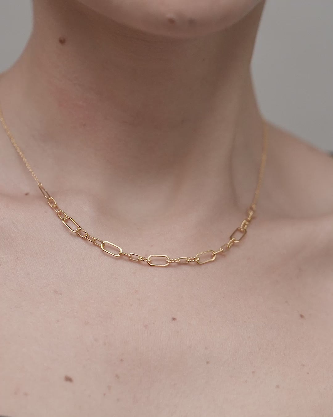 This design features bold hexagonal links forming a geometric pattern with subtle gaps for a minimal yet dynamic structure.