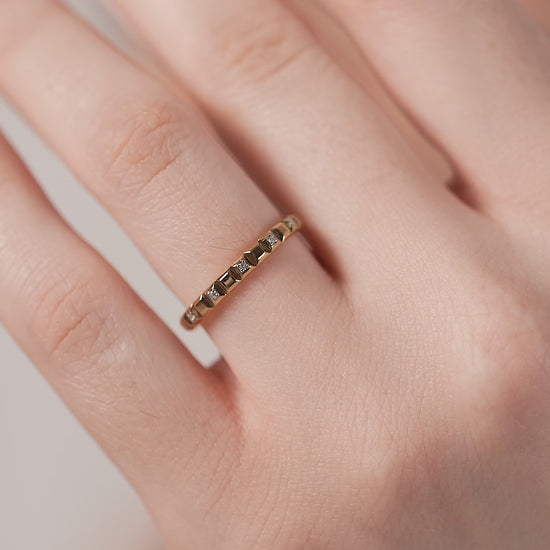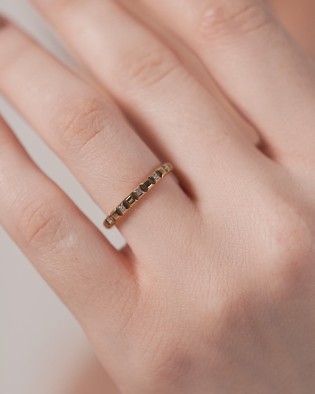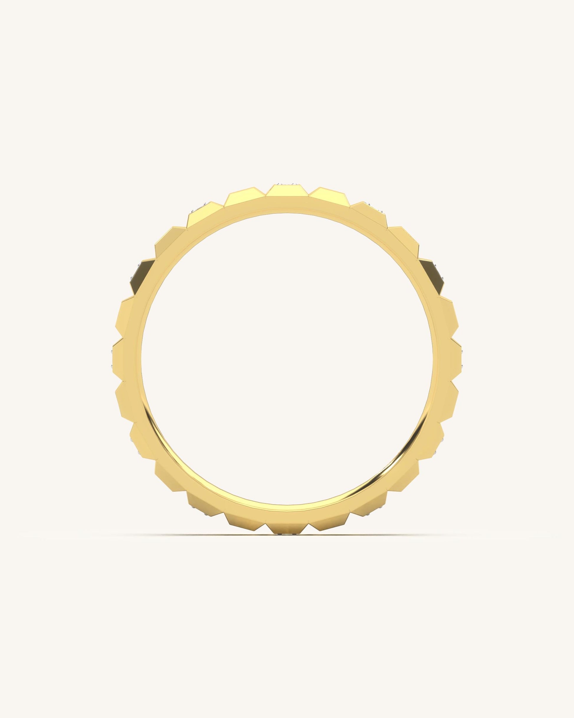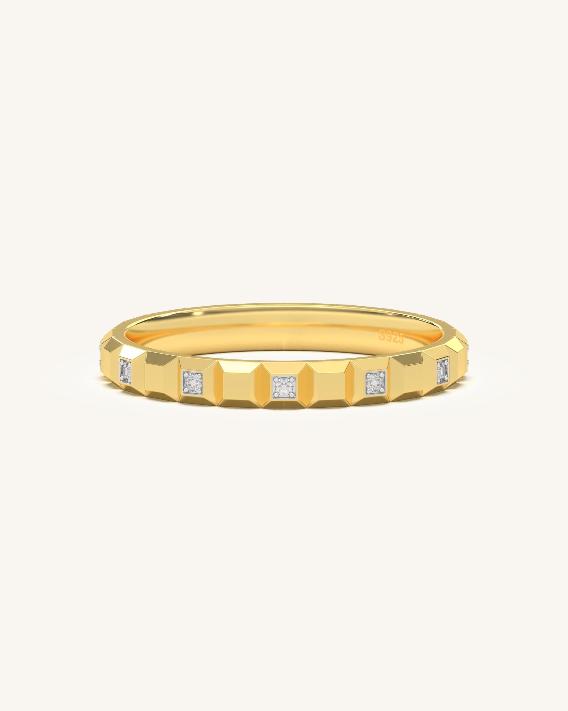Designed in 925 silver with gold finish. Moissanite diamonds enhance the rings modern aesthetic with minimal sparkle.