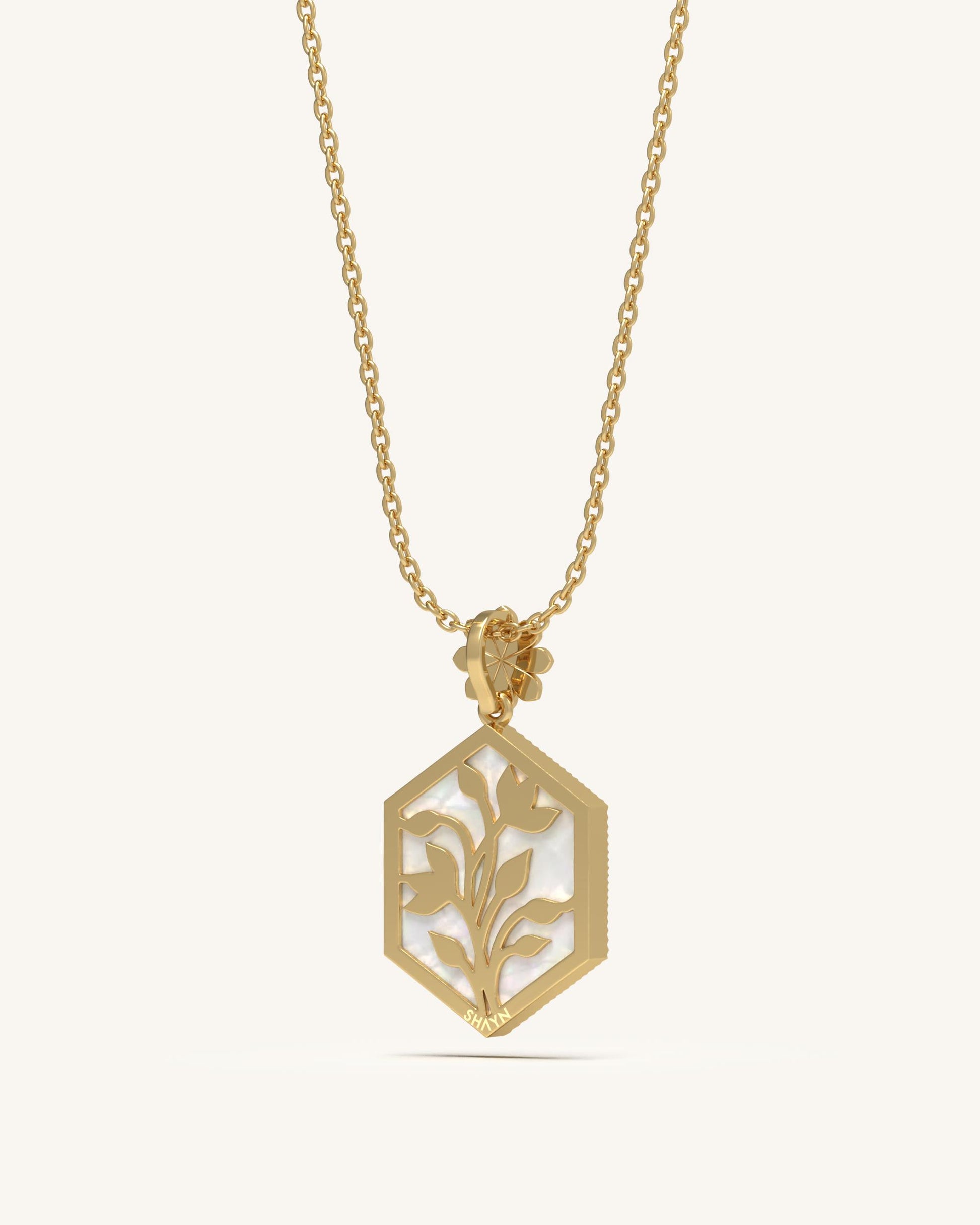 Crafted from 925 silver with bright gold tone and carved natural shell finish.