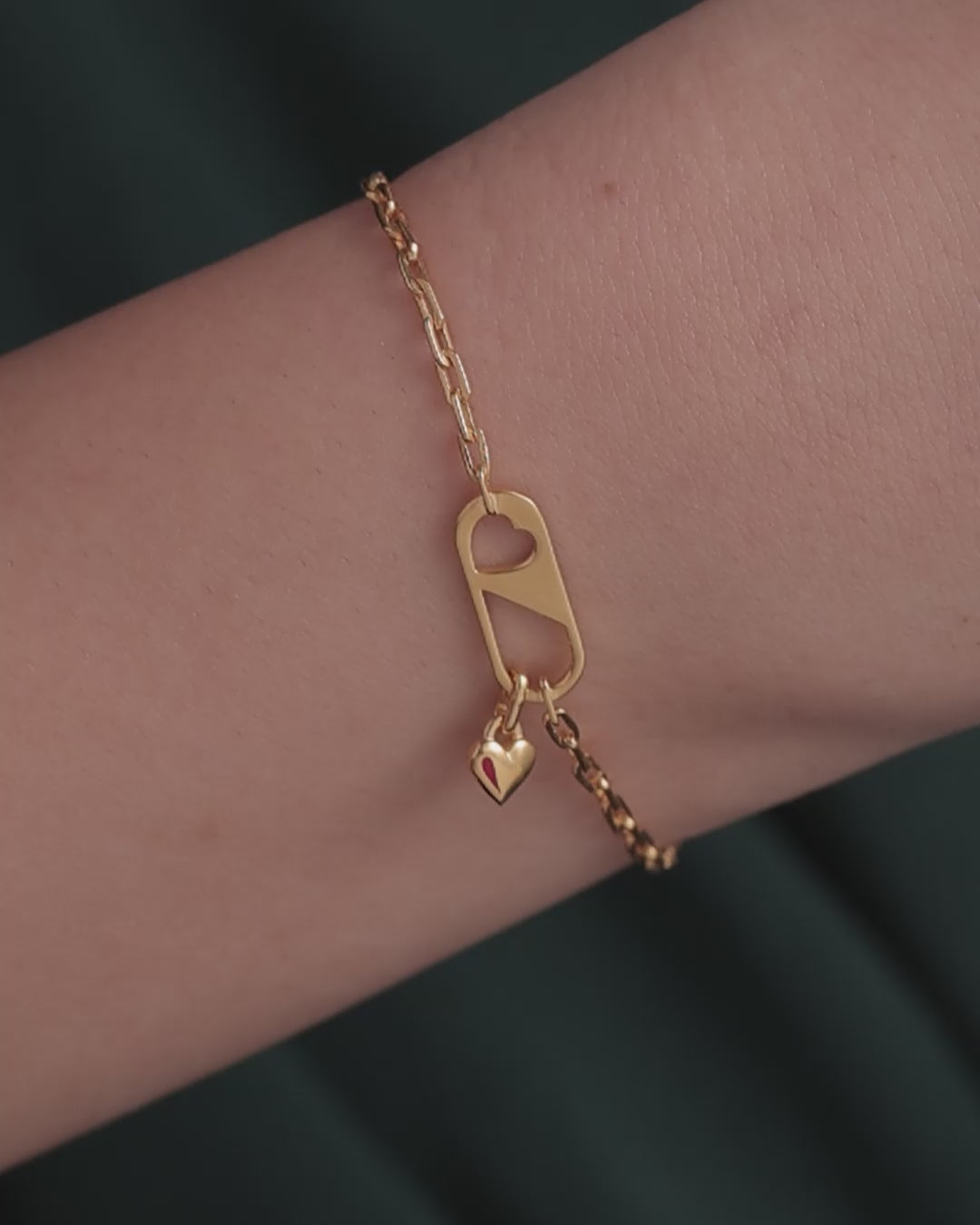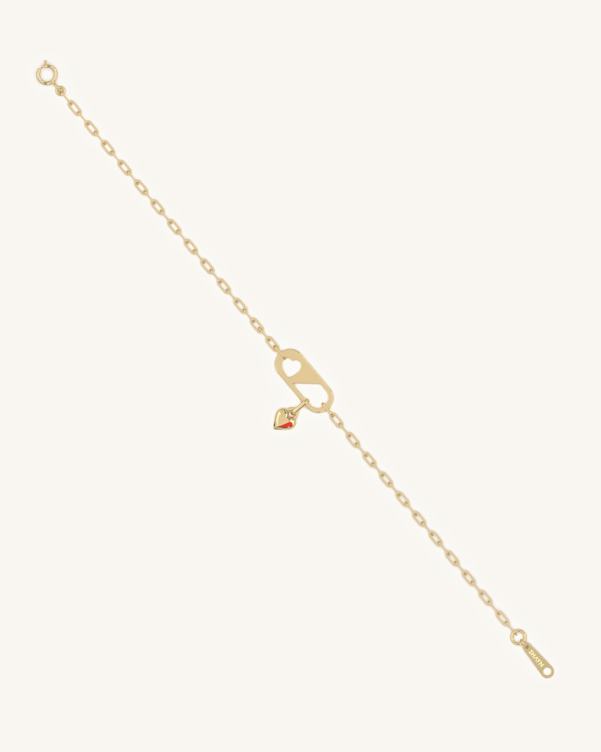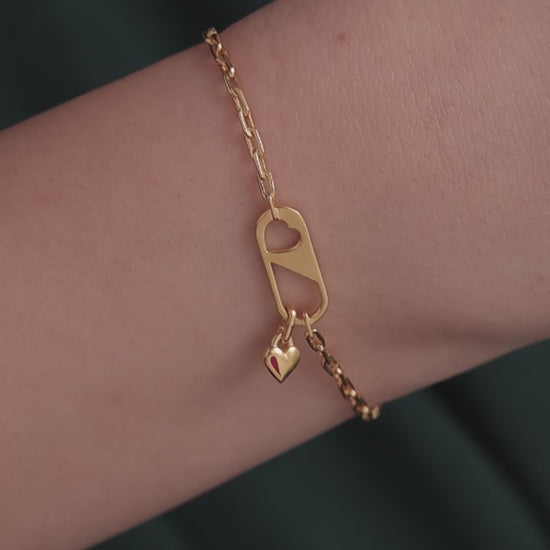 A modern lock-inspired bracelet featuring a heart cut-out and dangling charm. Subtle, stylish, and meaningful