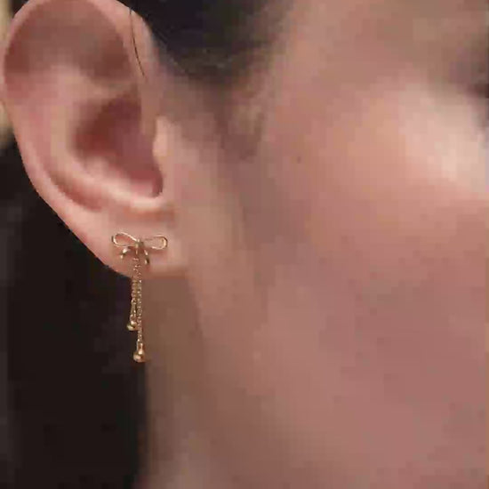 A statement earring with a classic bow design in matte gold and white finish, paired with a long drop chain ending in a tapering gold bar. The length adds drama to the design while maintaining grace.