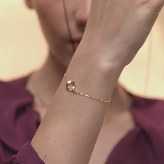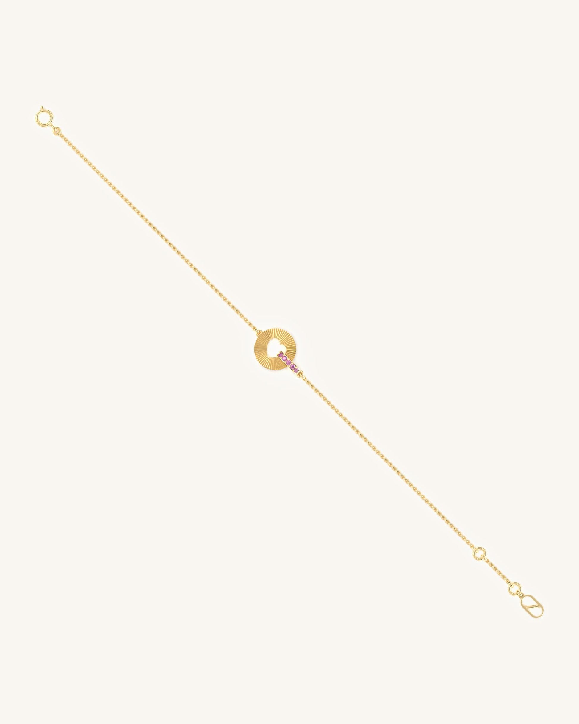 A circular charm bracelet with a heart cut-out and a pink stone bar linking across the chain for a vibrant modern accent.