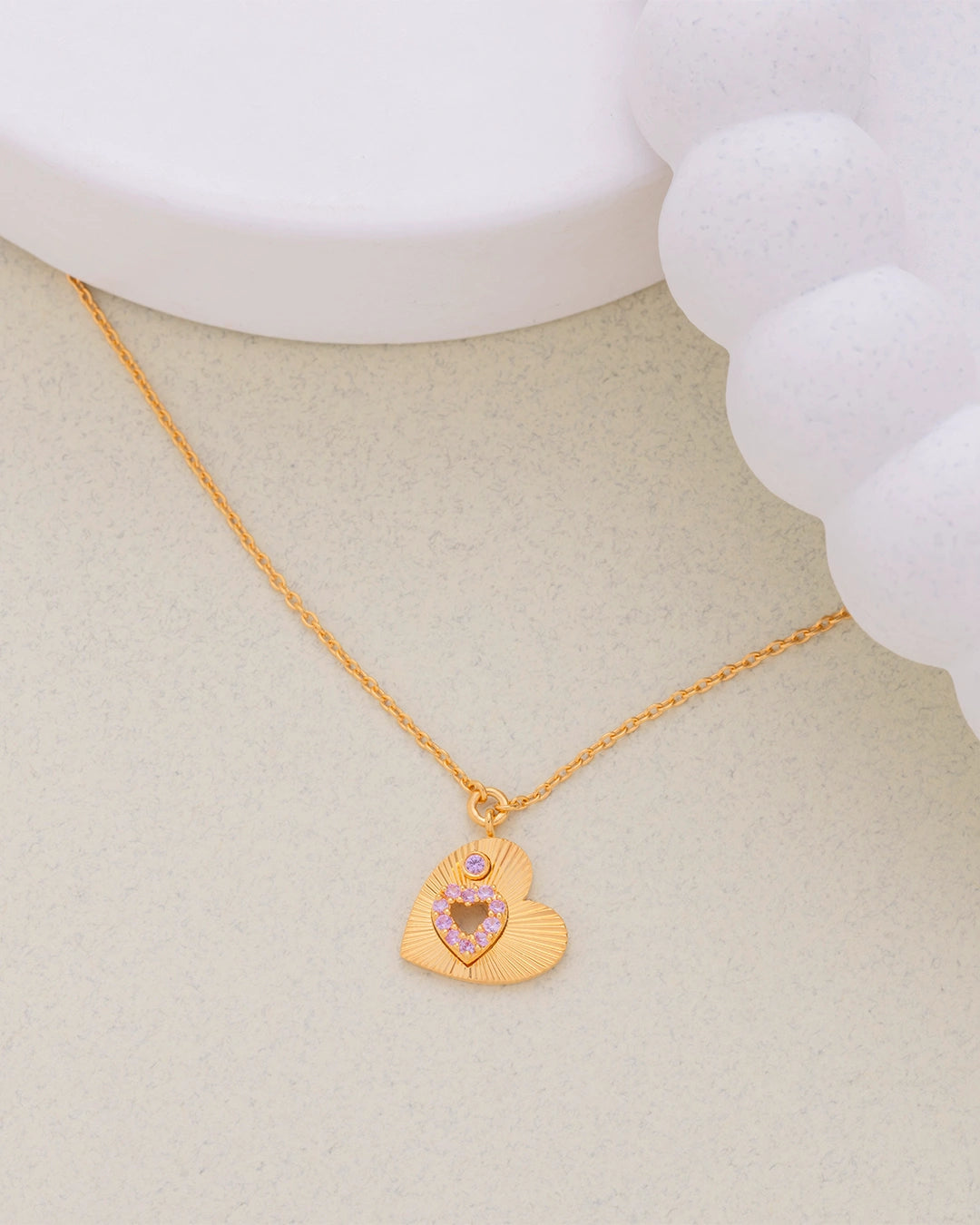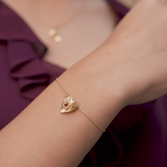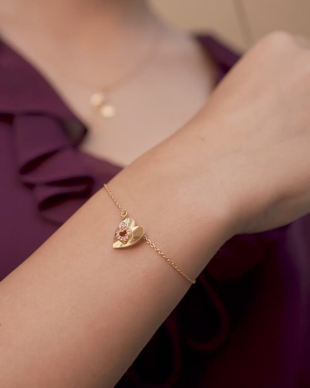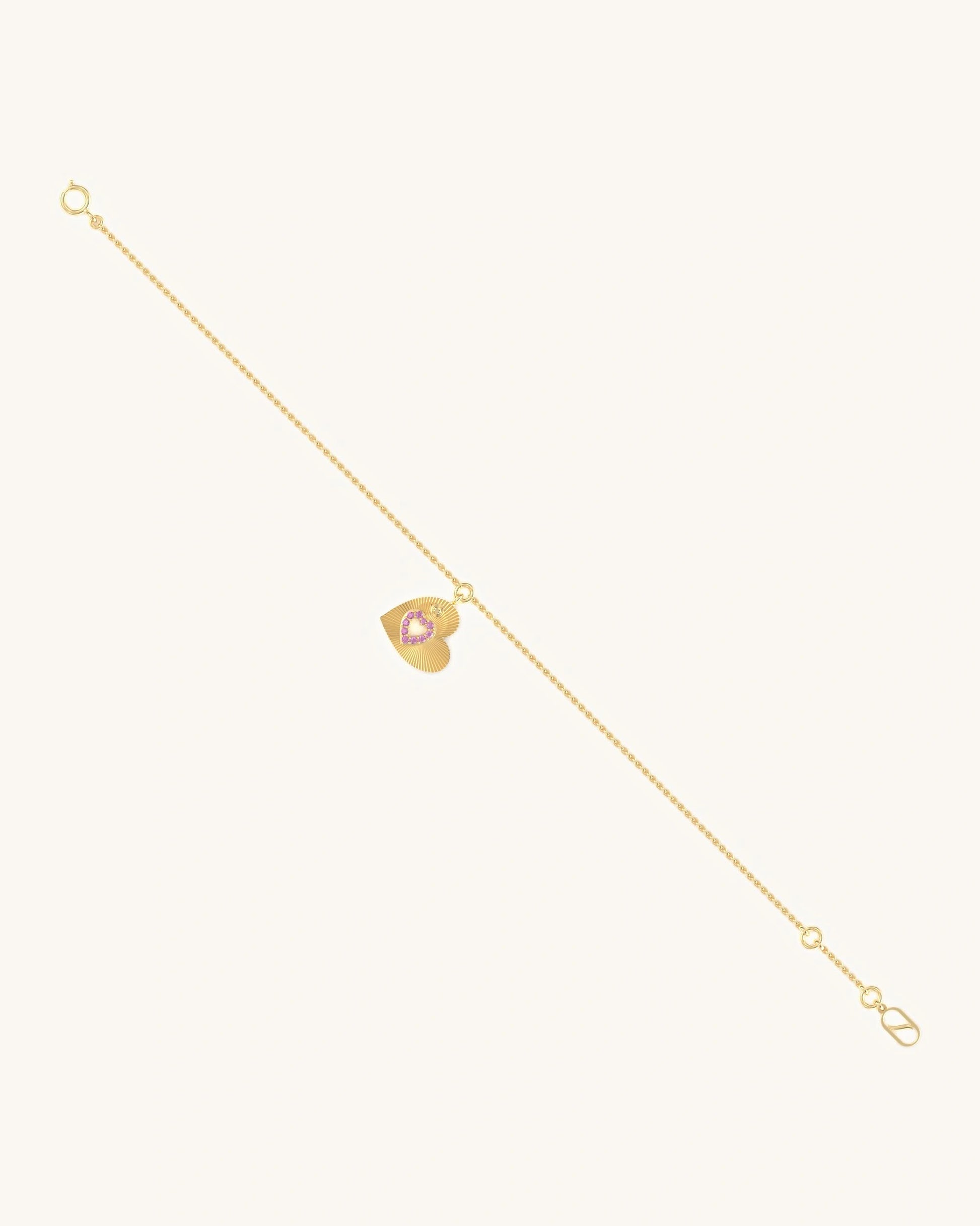 Bracelet showcasing a small heart pendant engraved with a radiating sunburst pattern and a center pink stone heart.