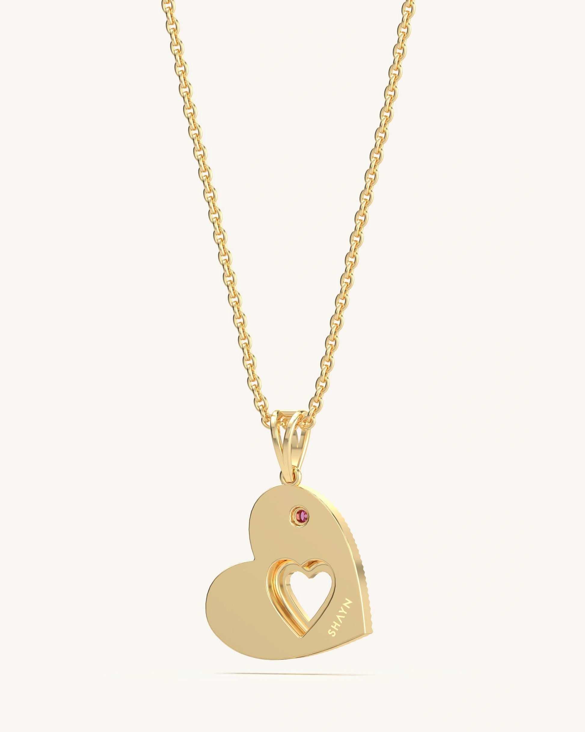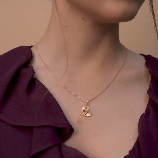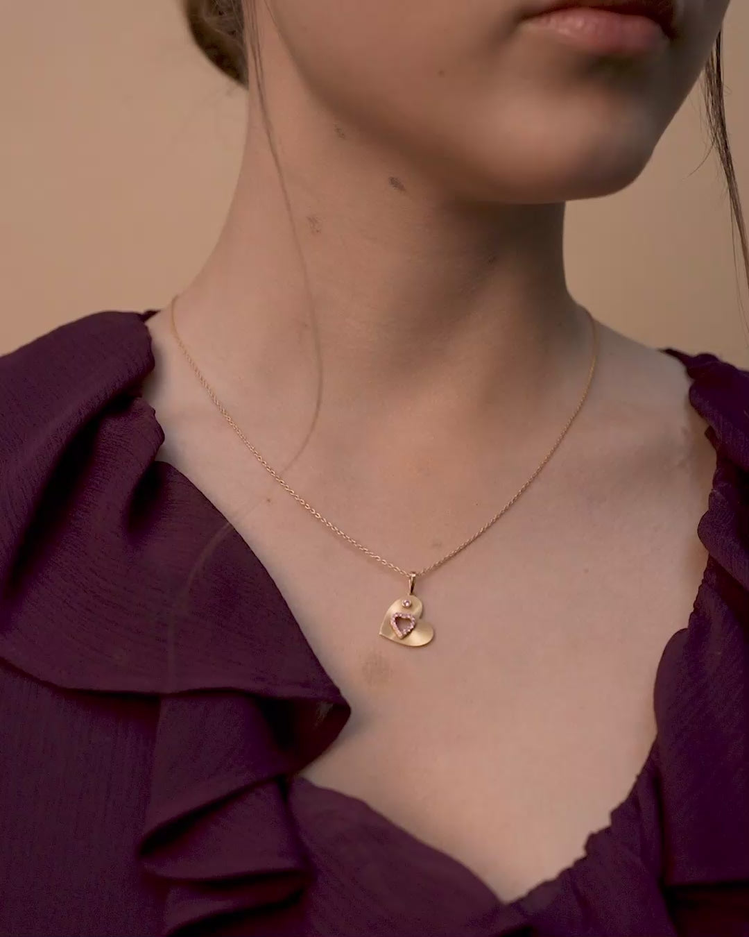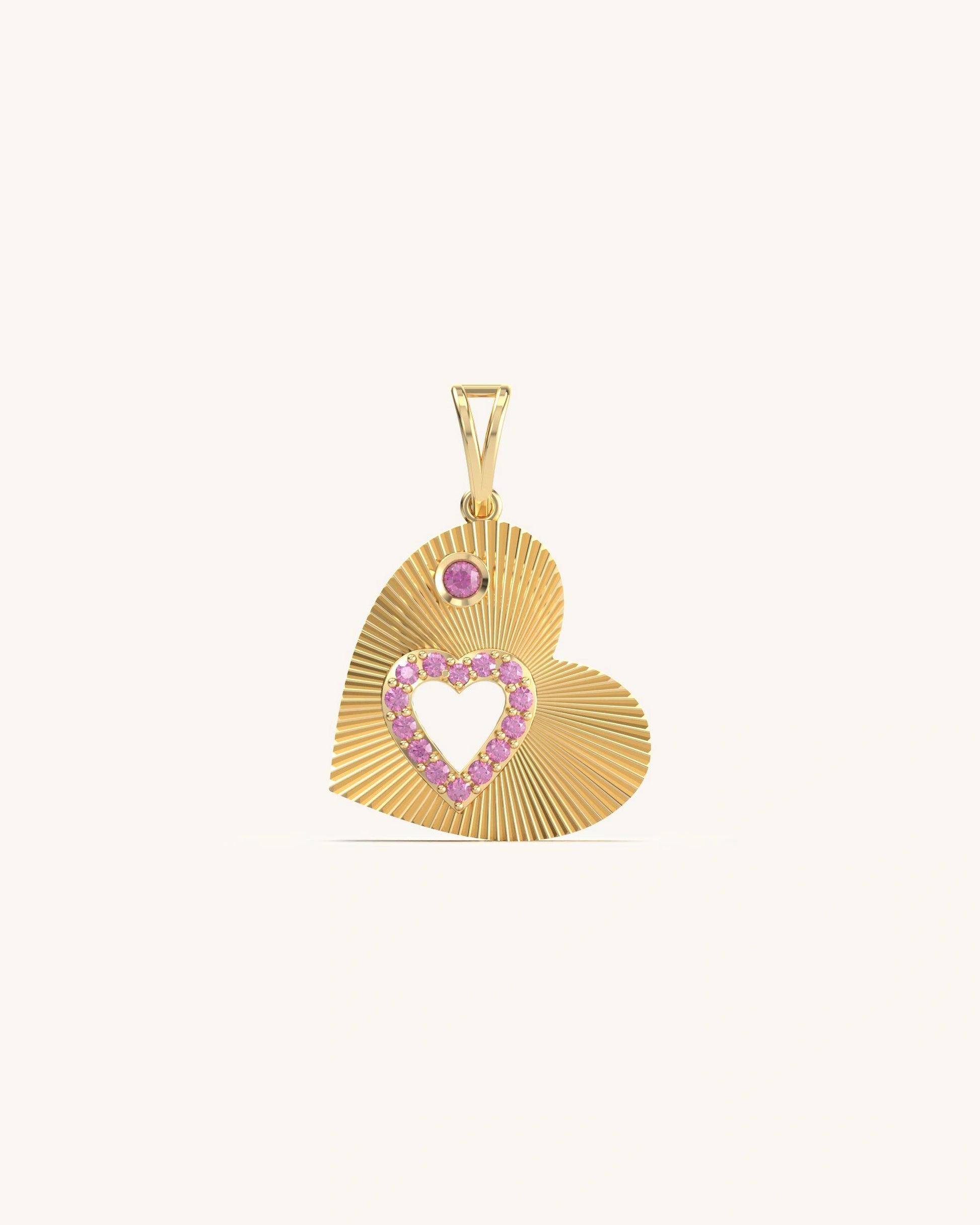 A tilted heart-shaped pendant showcasing a cut-out heart and one pink accent stone, designed with radiant engraving across its curved surface.